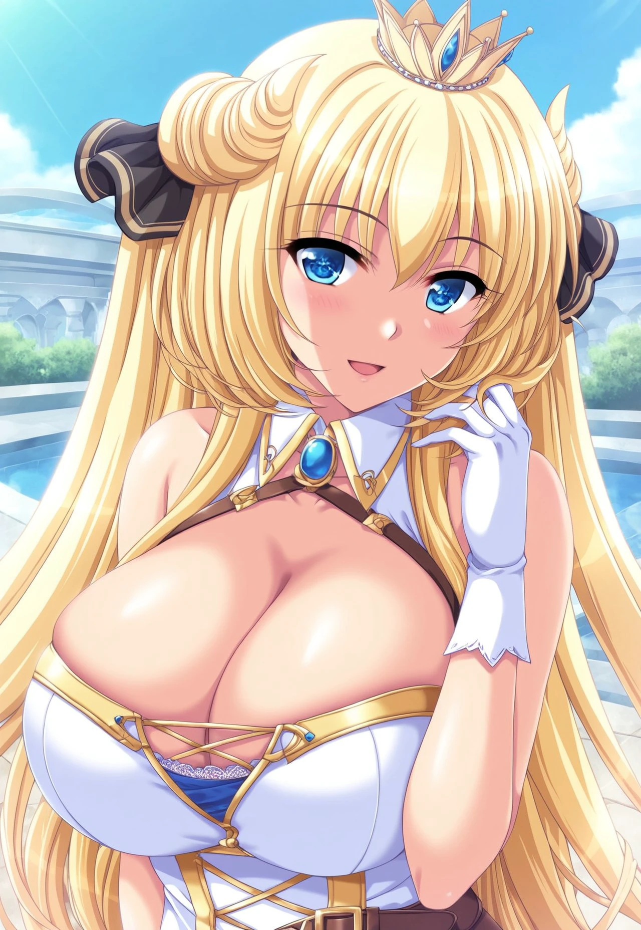 sleeveless, white high-collared shirt, lace detailing, cleavage, gold chest harness, brown belt, fitted black leggings, silver boots, white gloves,