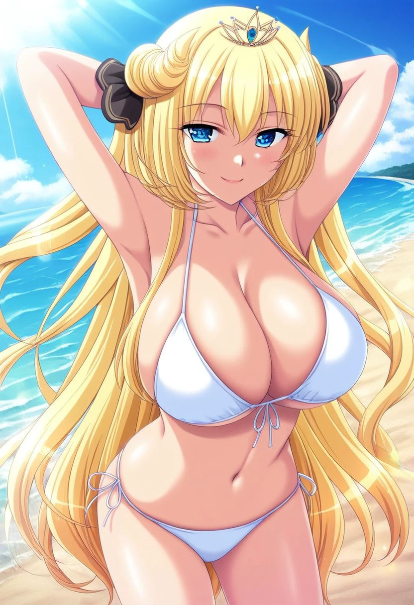 Blond hair, Odango, Ringlet, Side hair, Spiky Bangs, Twin Tails, V Bangs, long hair, blue eyes, tsurime, plus symbol in eyes,