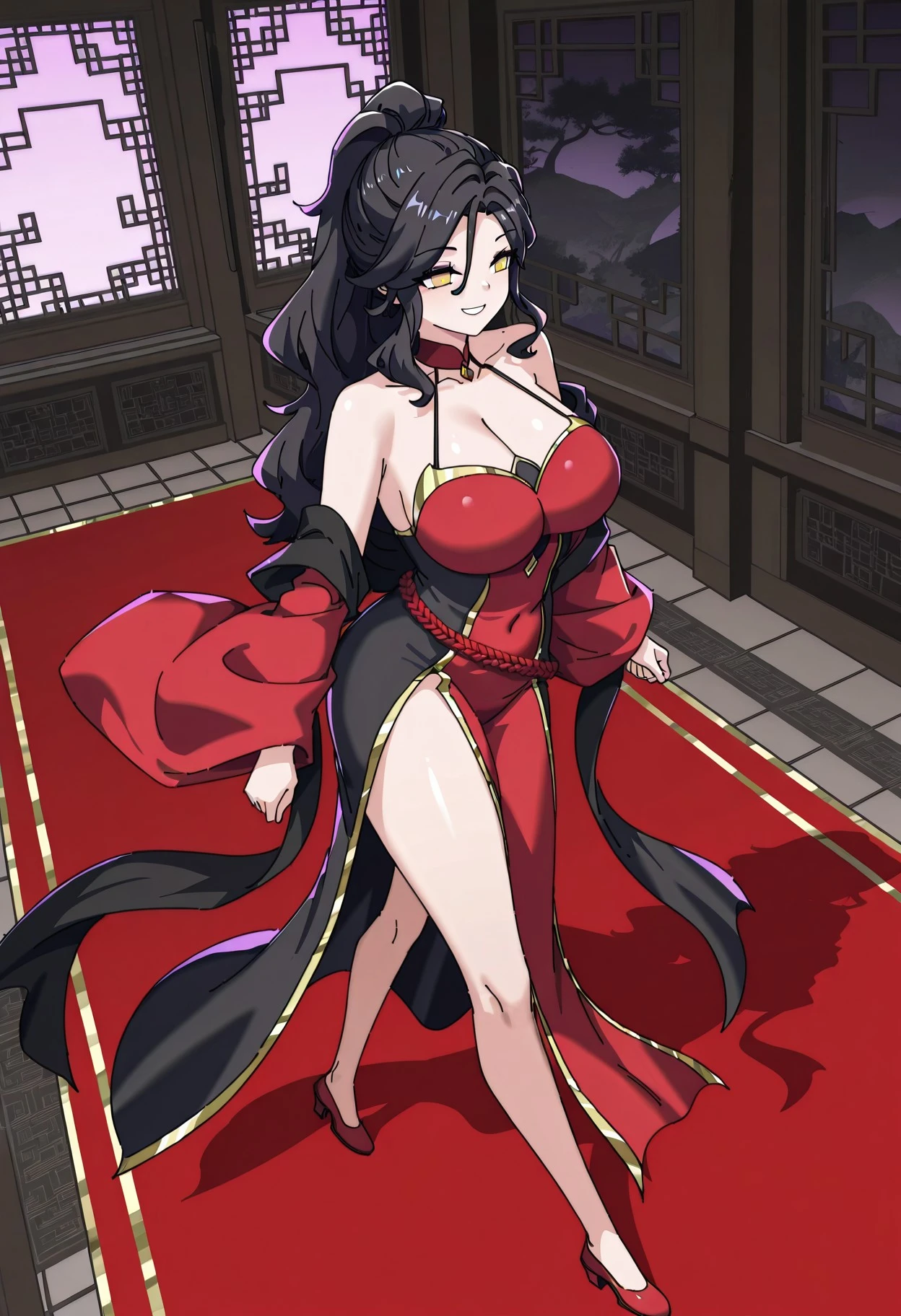 red sweetheart neckline, gold trim along neckline, lateral black vertical body panel, black shoulder straps, strap connected to choker, red choker with gold diamond pendant, layered sleeves, detached long red sleeves, wide red flared sleeves, (black inner sleeves:1.2), gold sleeve trims, black shawl draped over arms, independent black silk shawl, asymmetrical dress design, red and black color blocking, red loincloth, black side panel on left, panel on right, exposed right hip, gold trim along skirt edges, black long skirt panel at back, red braided rope belt, double-wrapped waist rope, red high heels