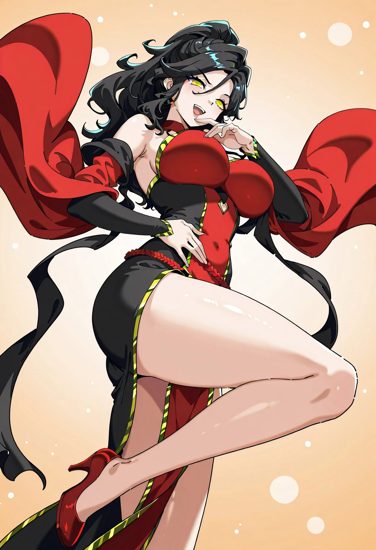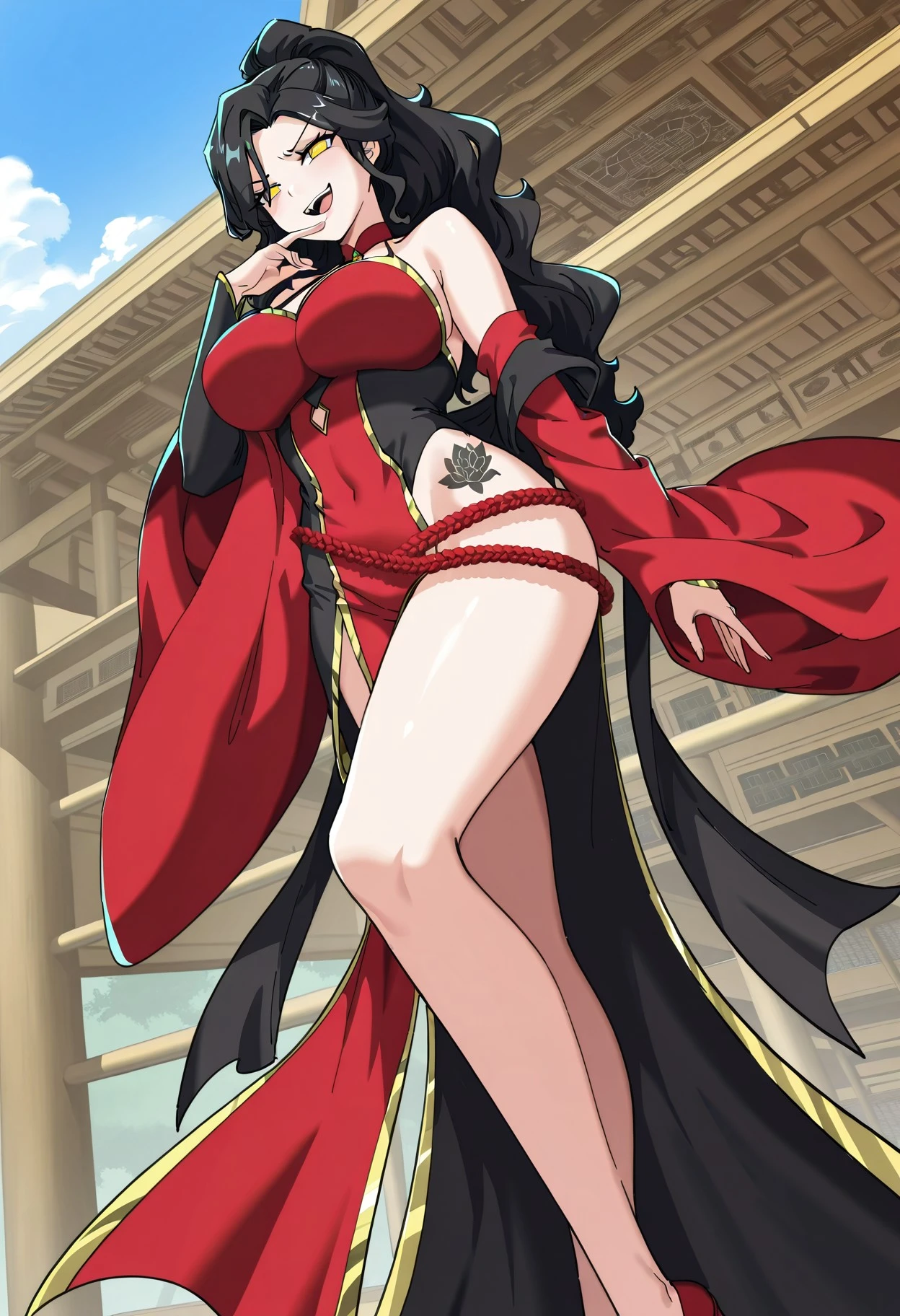 1girl, solo, mojil, long black hair, voluminous wavy hair, thick side-swept bangs, layered front strands framing face, high half-up hairstyle, oval face, sharp chin, narrow golden eyes, cat-like eyes, long eyelashes, thin arched eyebrows, tall female, curvy body, massive breasts, slim waist, wide hips, long legs, black lotus tattoo on right hip,