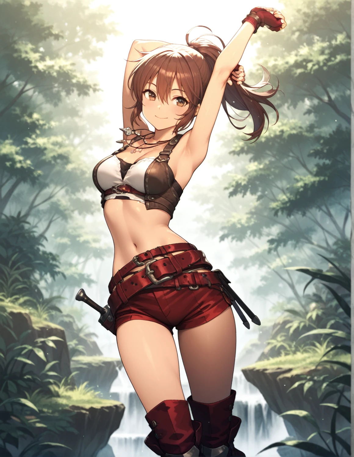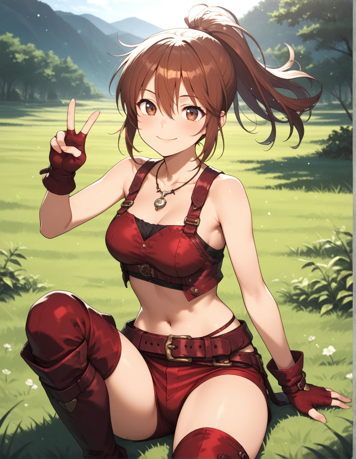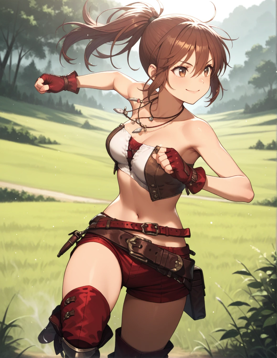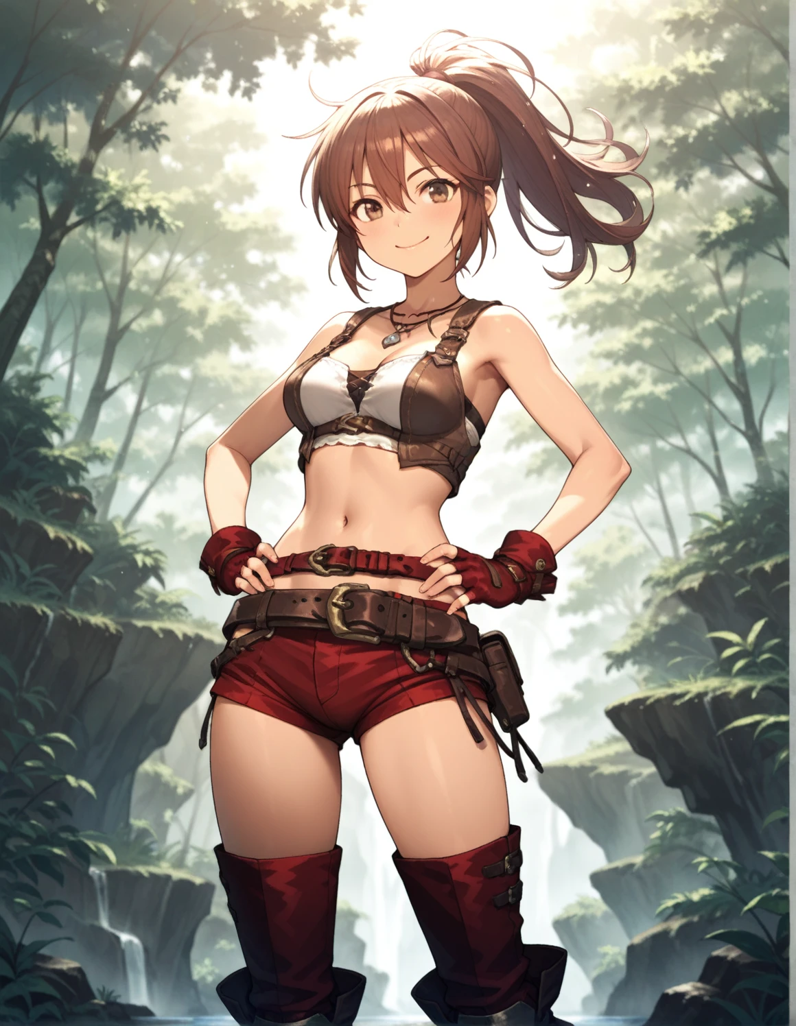 1girl, rs3eln, brown eyes, brown hair, ponytail, bangs, hair between eyes, necklace, midriff, navel, red fingerless gloves, belt, buckle, short shorts, red shorts, red thighhighs, knee boots, no jacket,