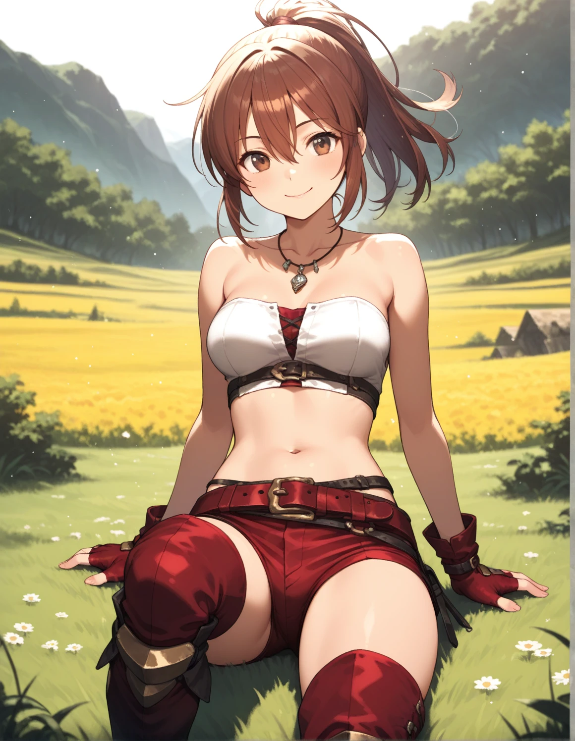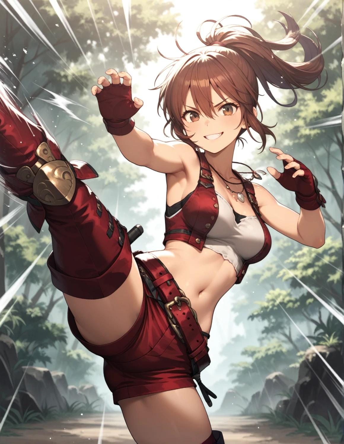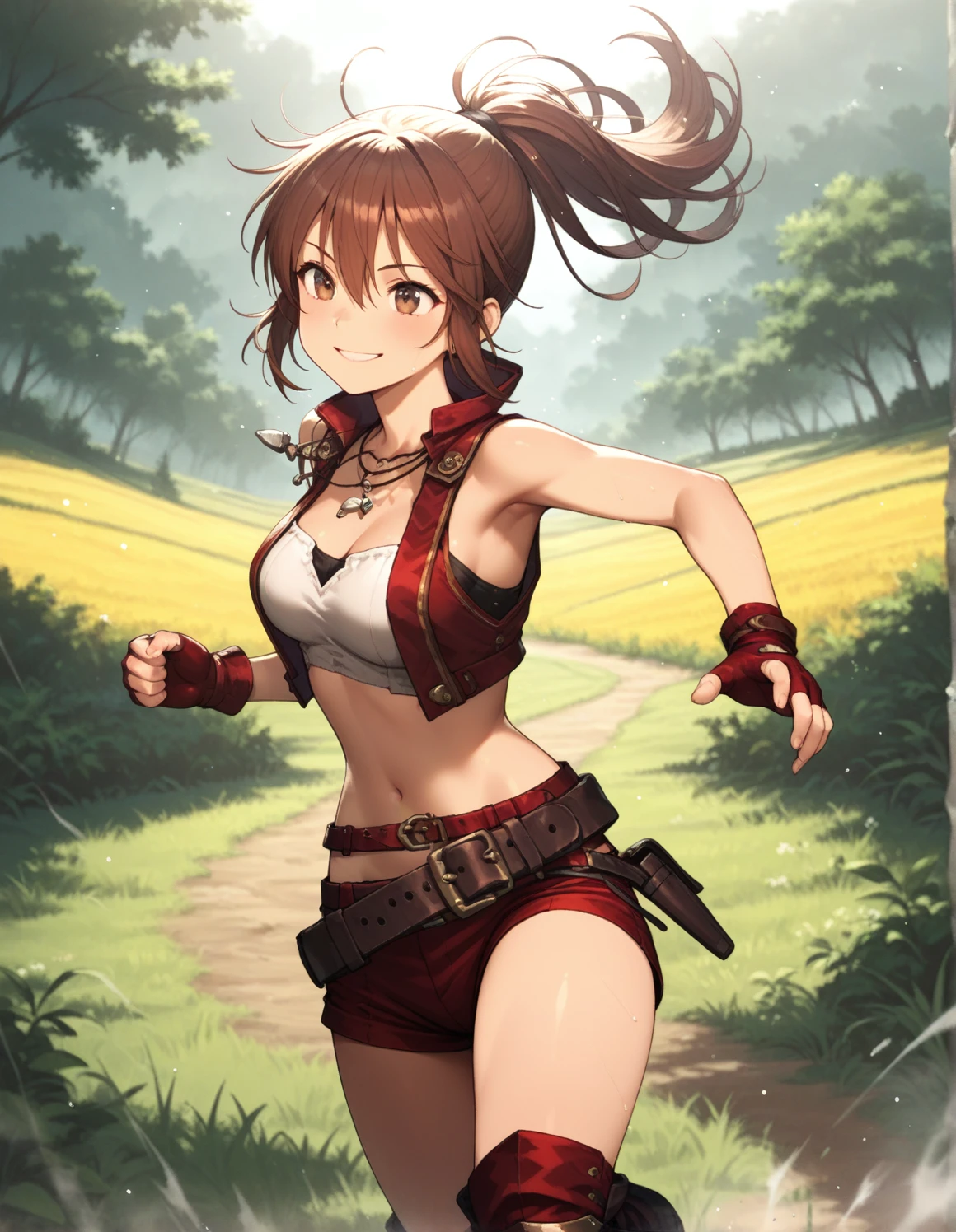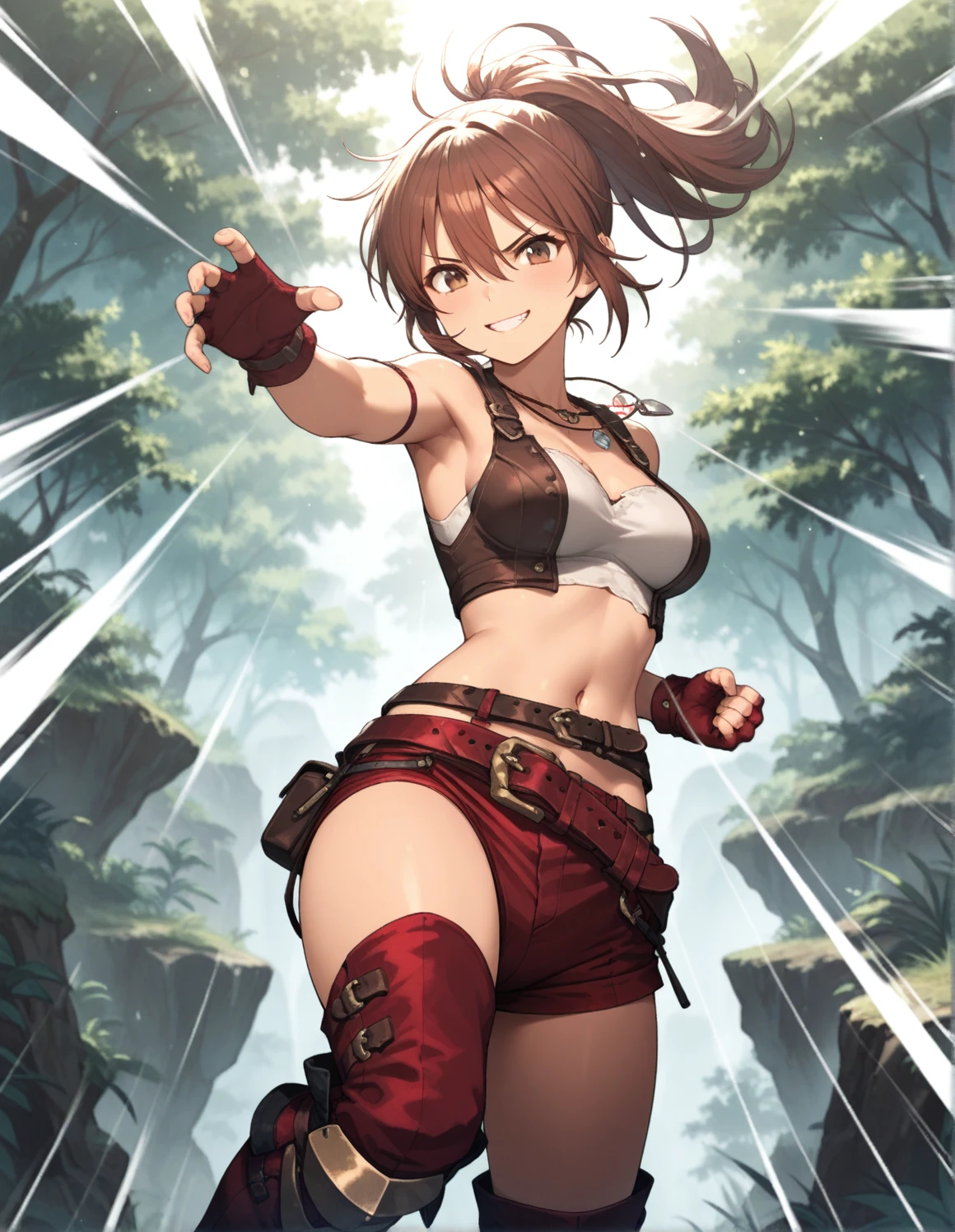 1girl, rs3eln, brown eyes, brown hair, ponytail, bangs, hair between eyes, necklace, midriff, navel, red fingerless gloves, belt, buckle, short shorts, red shorts, red thighhighs, knee boots, no jacket,