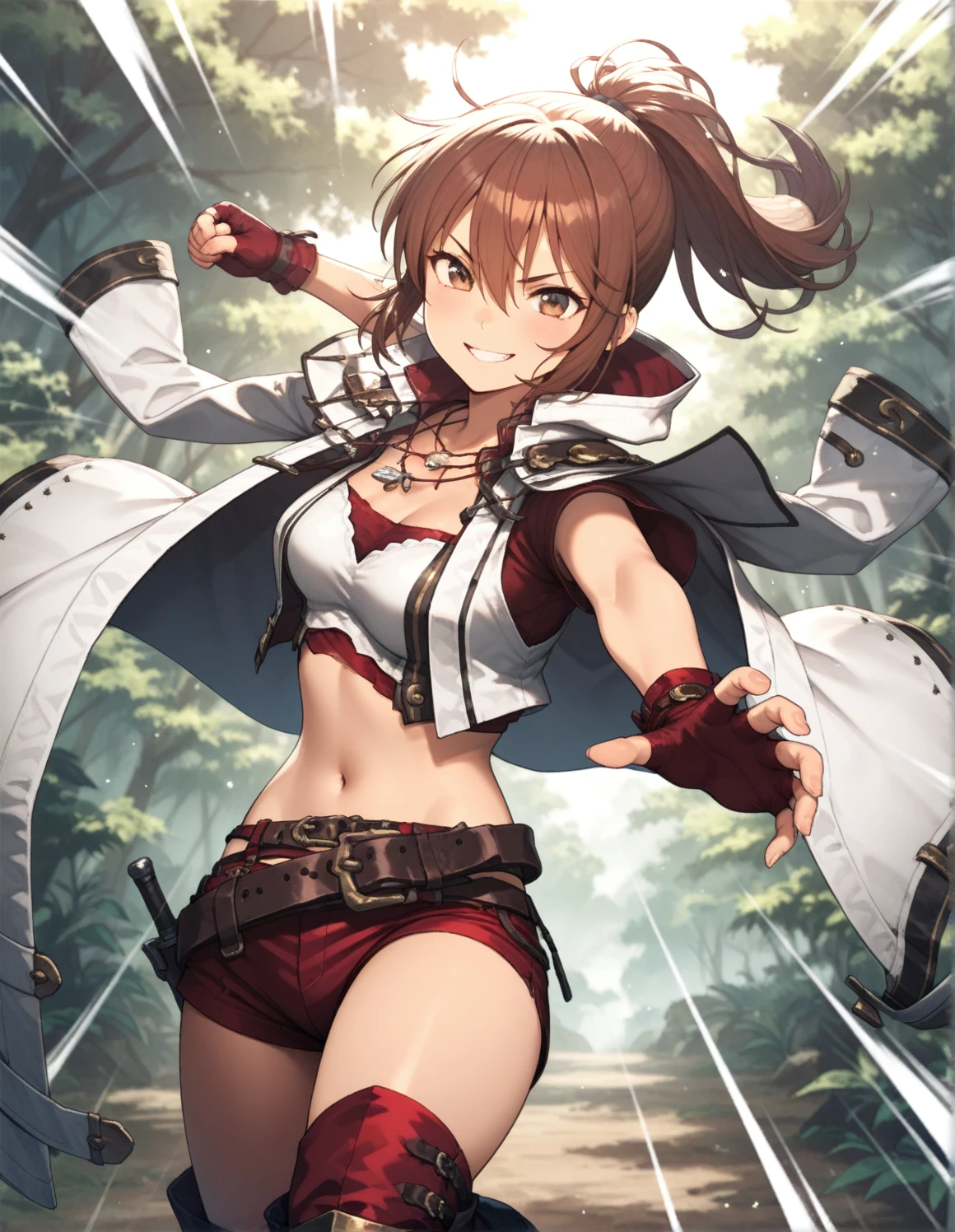 1girl, rs3eln, brown eyes, brown hair, ponytail, bangs, hair between eyes, necklace, midriff, navel, white jacket on shoulders, short sleeves, red fingerless gloves, belt, buckle, short shorts, red shorts,