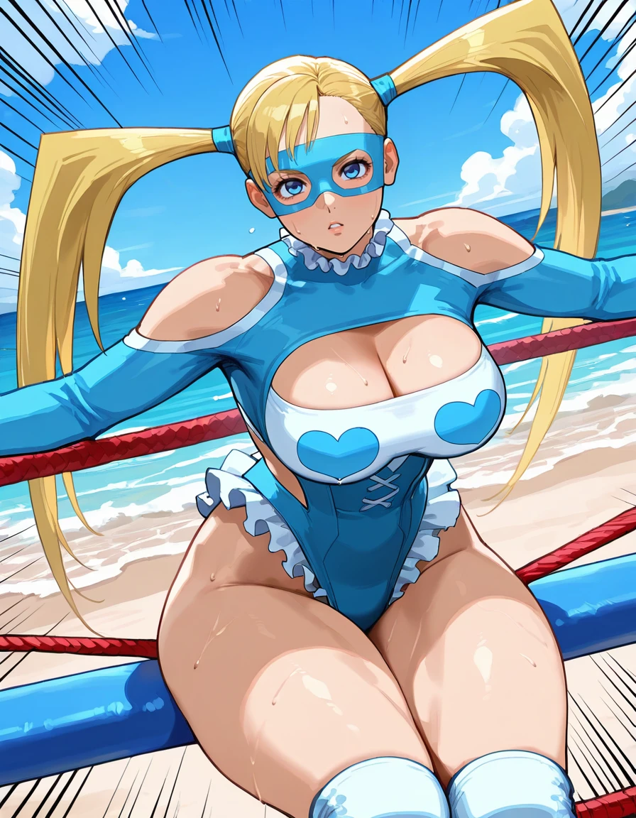 (retro artstyle:0.7), (rainbow-mika, blue eyes, brown eyebrows, blonde hair, long hair, large twintails, sharp twintails, hair tie, swept bangs, domino mask, huge breasts, wide hips, thick thighs, toned female), (wrestling outfit, frills, cleavage cutout, side cutout, back cutout, shoulder cutout, elbow cutout, thigh cutout, knee pads, wrestling boots)