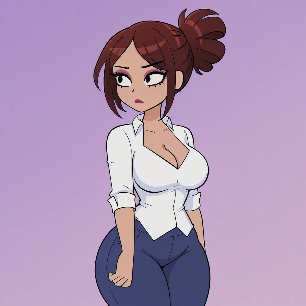 VeronicaCruz, 1girl, solo, black eyes, bangs, medium breasts, large breasts, brown hair, ponytail, medium hair, dark skin, dark-skinned female, parted bangs, curvy, mature female, makeup, wide hips, white shirt, cleavage, blue pants,