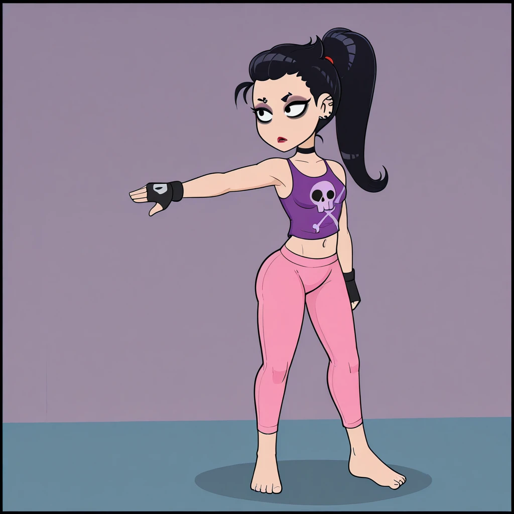 barefoot, navel, fingerless gloves, purple tank top, pink pants, skull print,