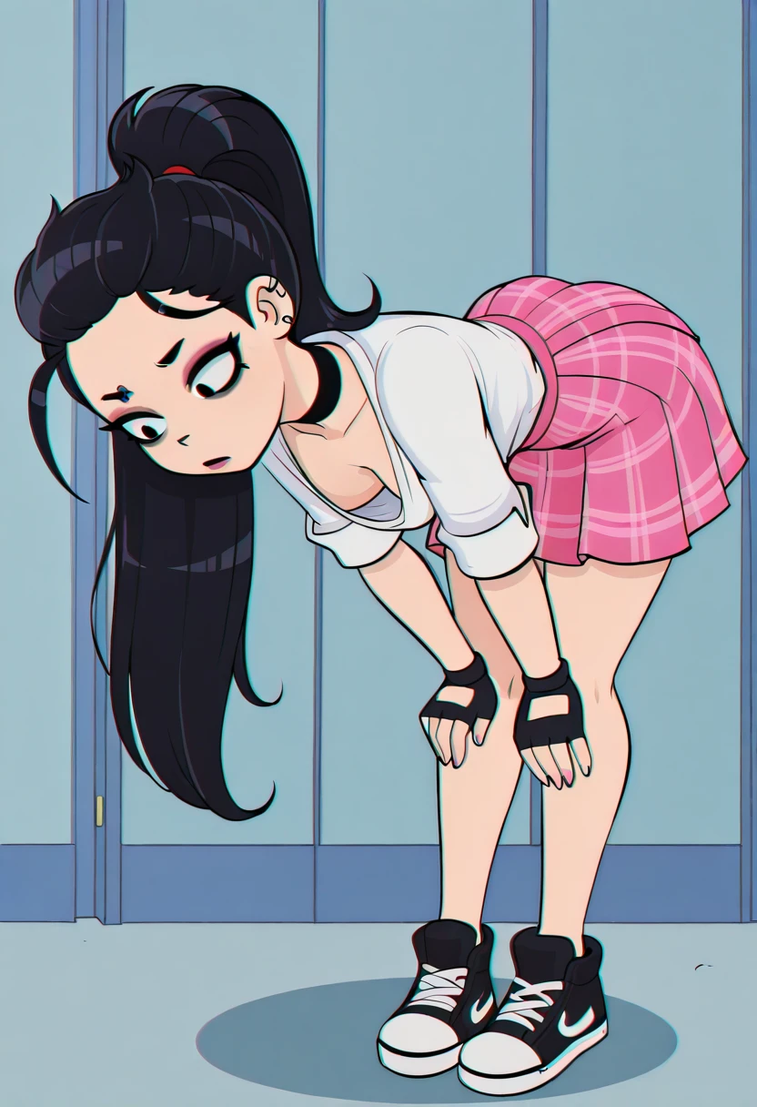 Stacey, 1girl, long hair, breasts, small breasts, black hair, ponytail, choker, multiple earrings, makeup,