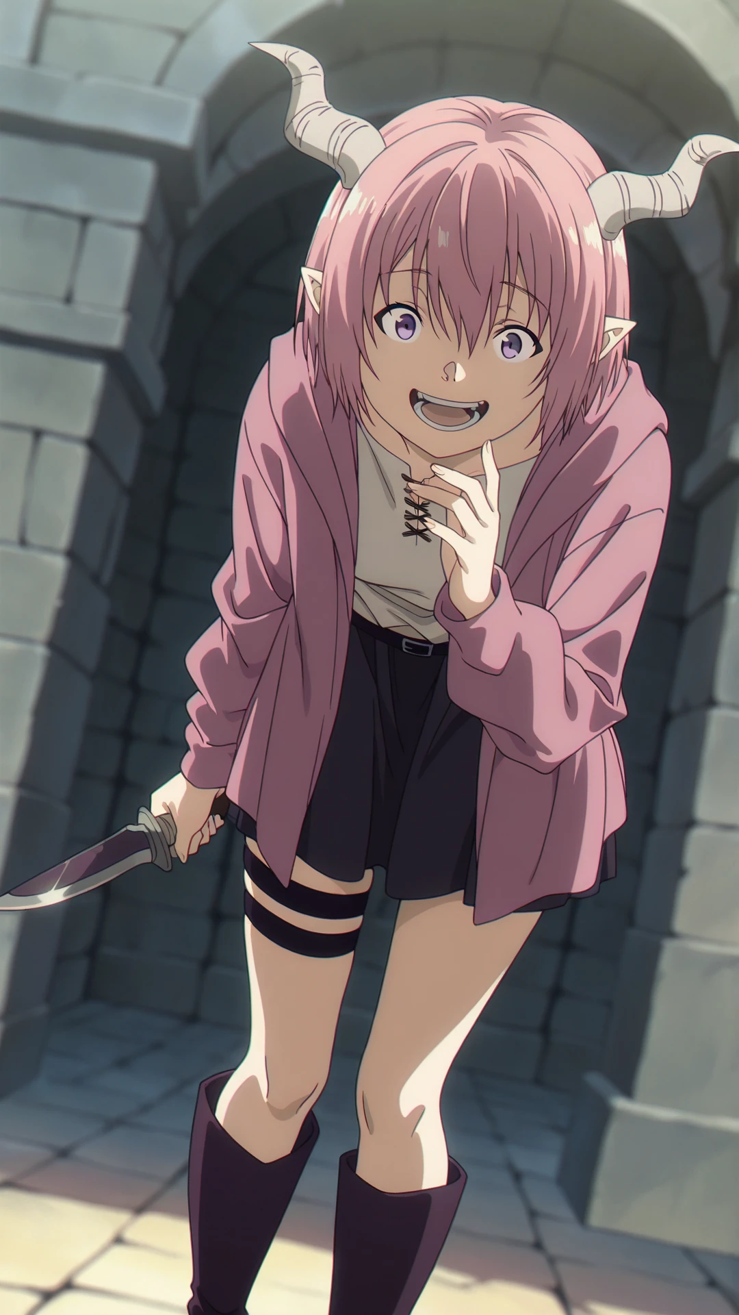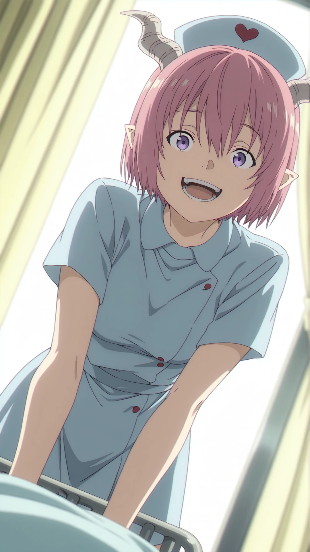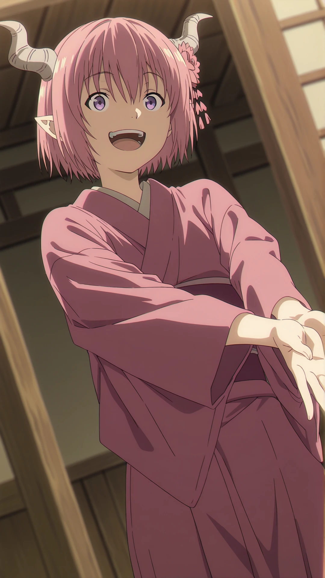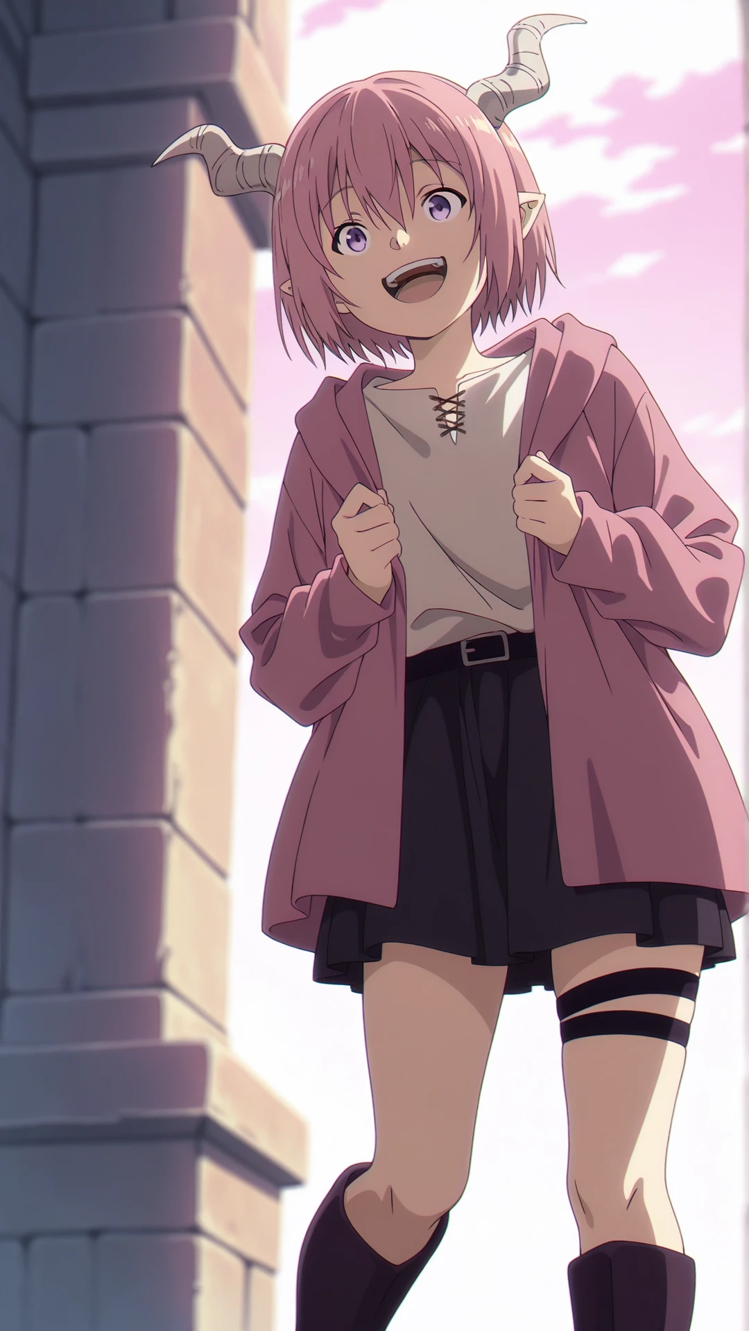 jung\(sousou no frieren\),short hair, demon girl, demon horns, pointy ears, pink hair, purple eyes, hair between eyes,