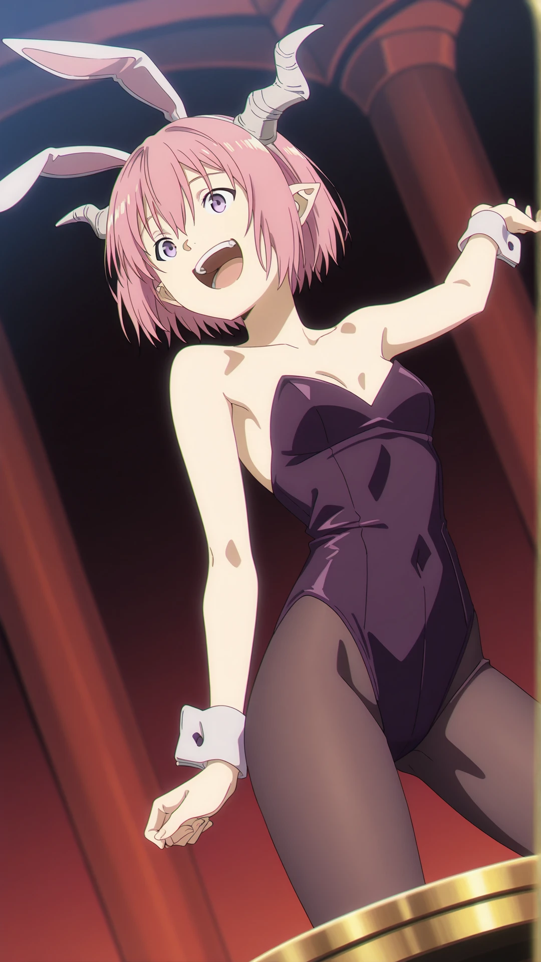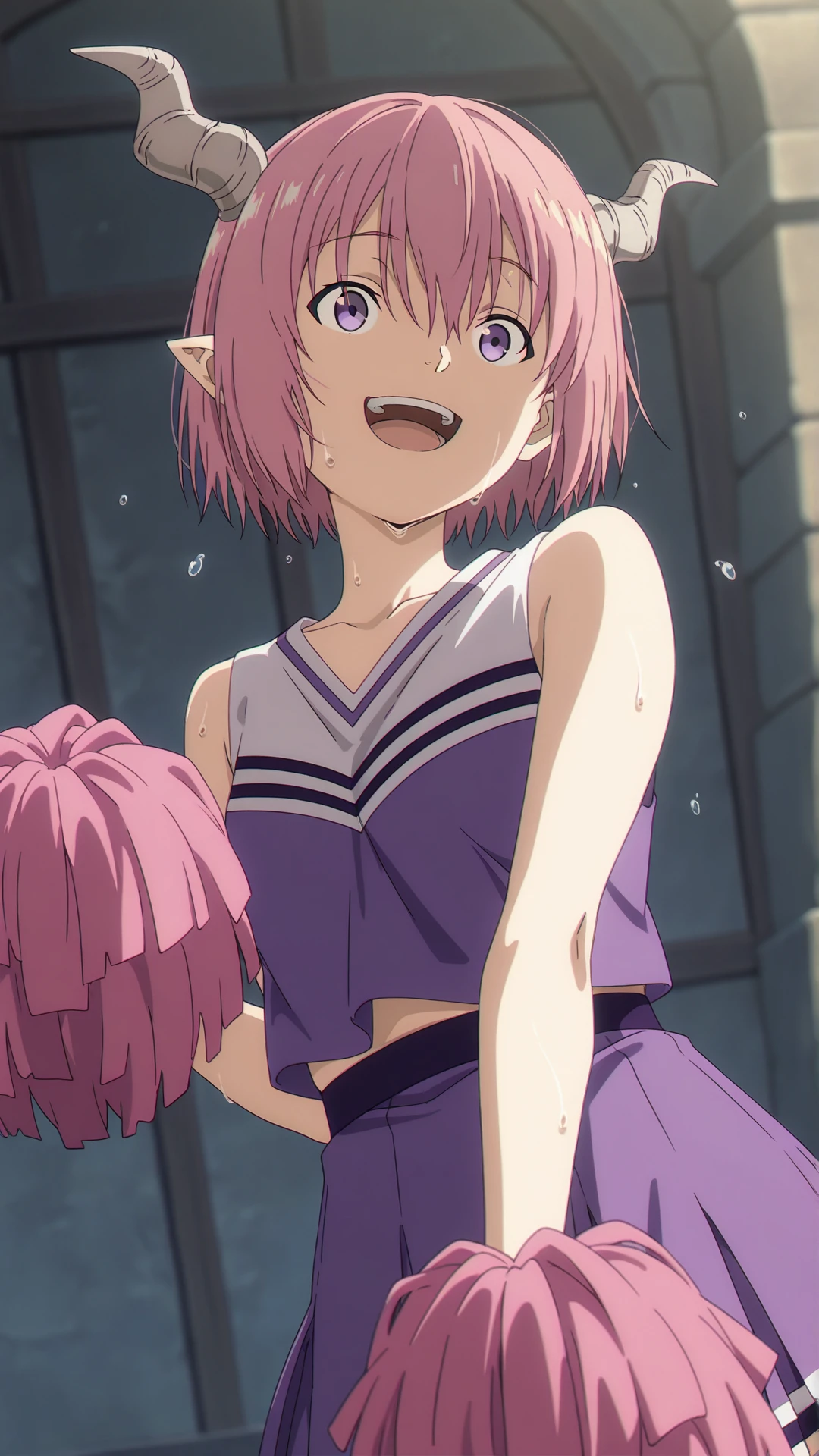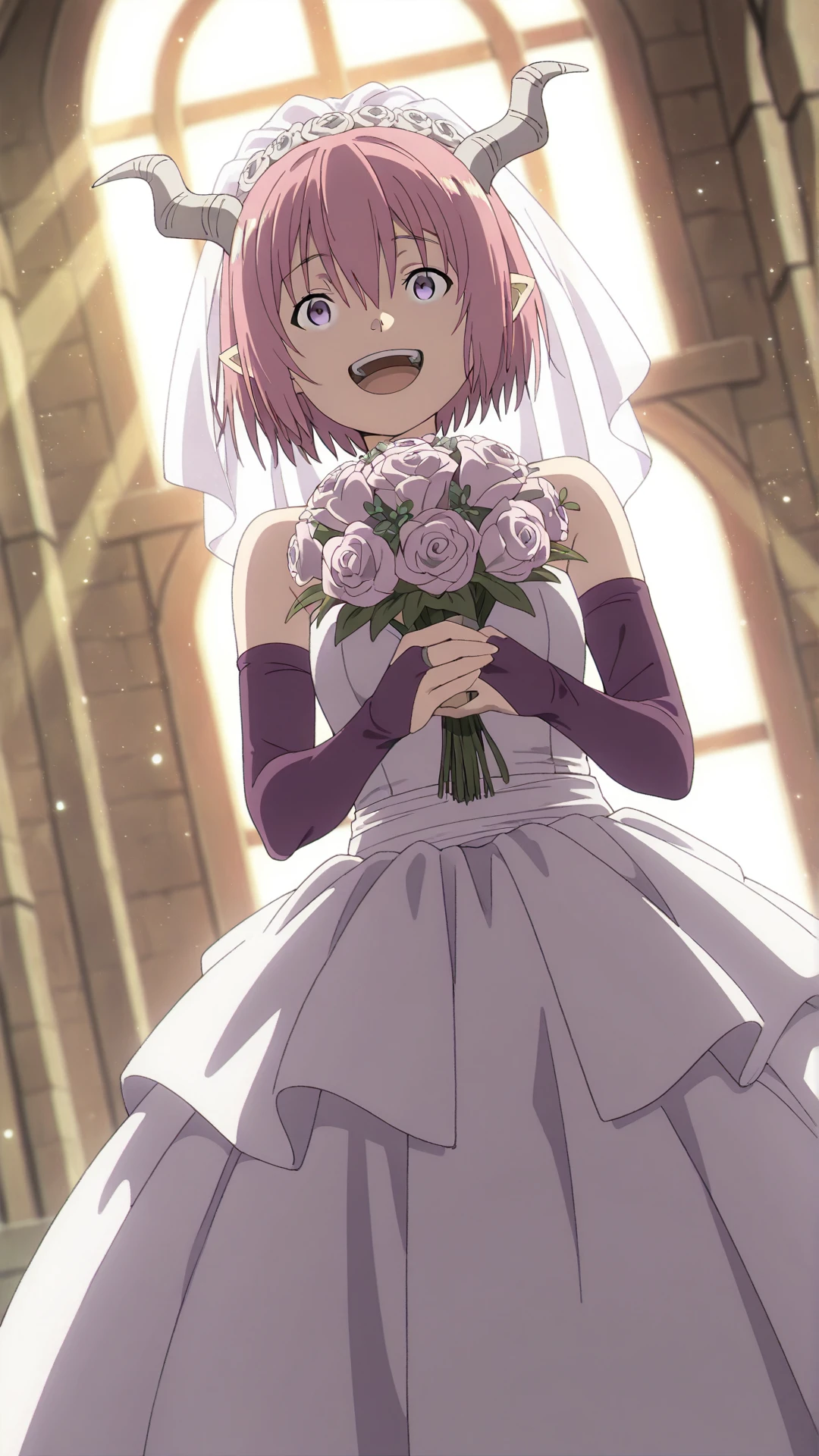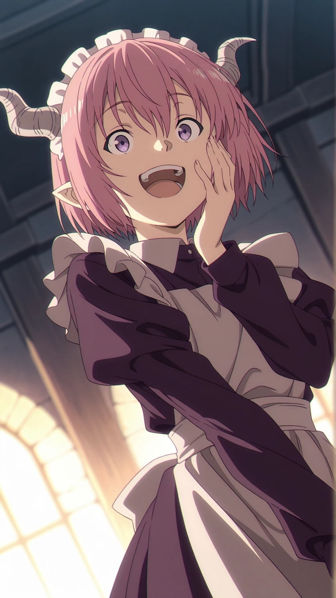 jung\(sousou no frieren\),short hair, demon girl, demon horns, pointy ears, pink hair, purple eyes, hair between eyes,