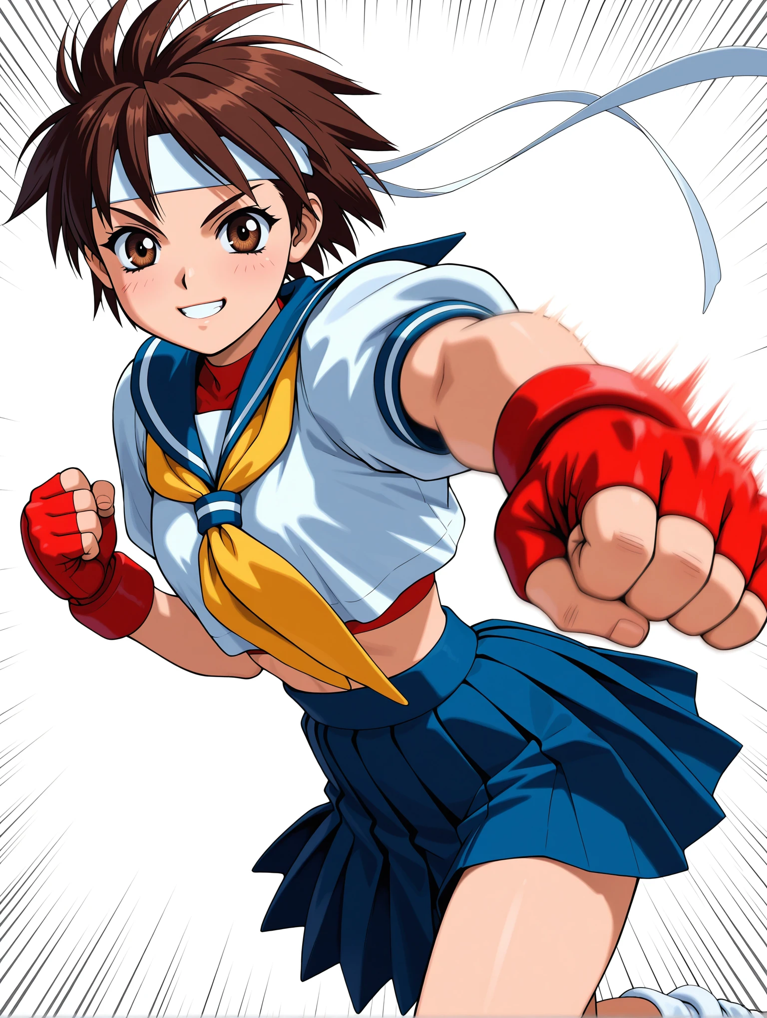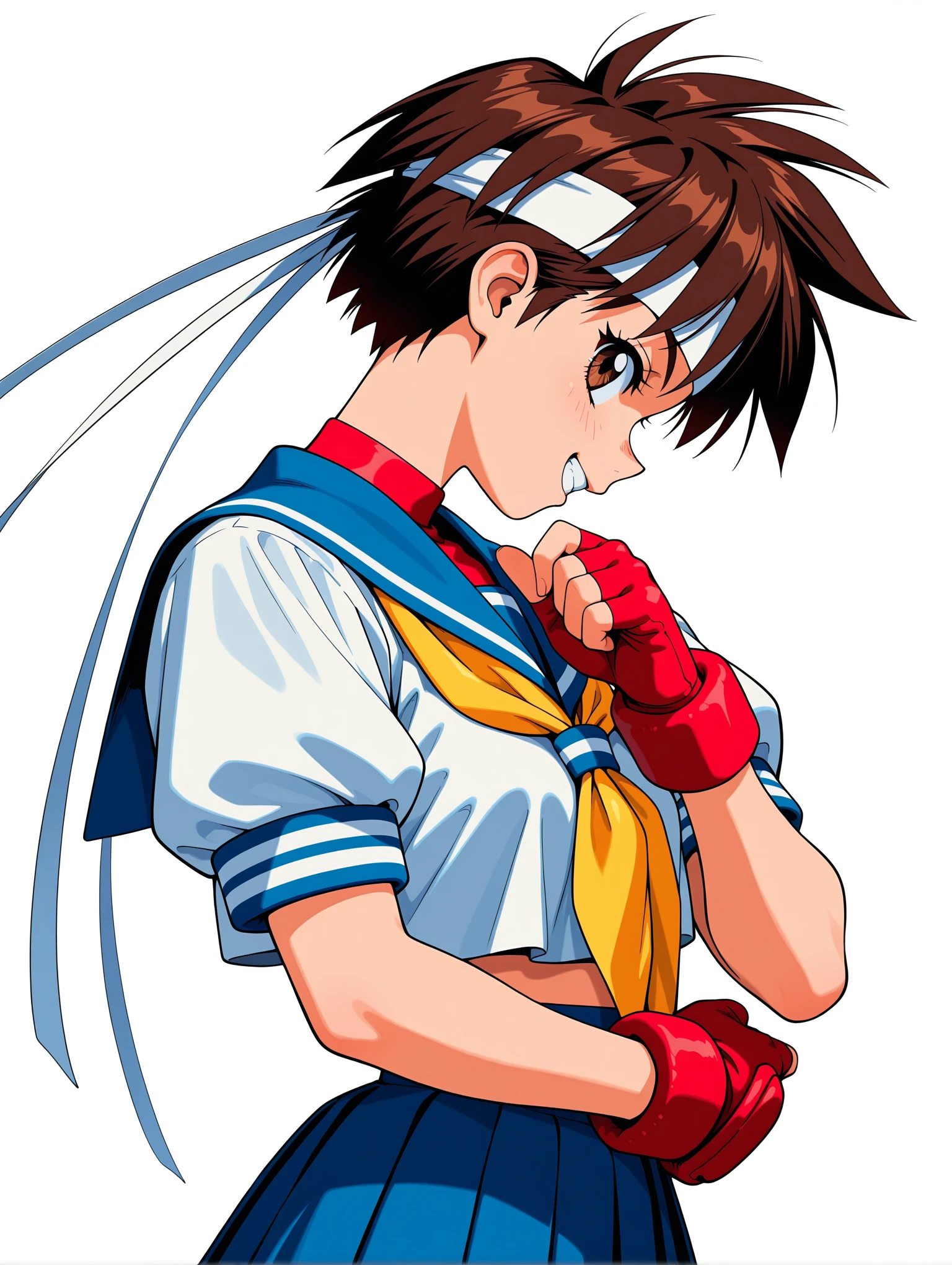 衣装(カラー)・s_clothes,blue sailor collar,yellow neckerchief,red wristband,red fingerless gloves,white crop top,blue pleated skirt,white bobby socks,white shoelaces,red sneakers,
