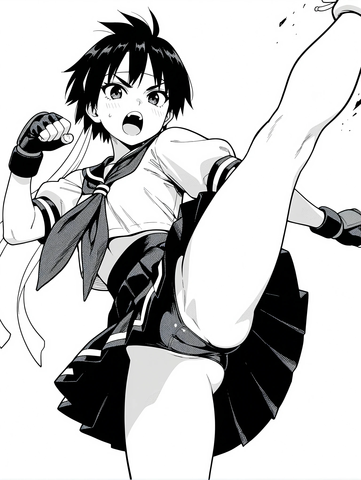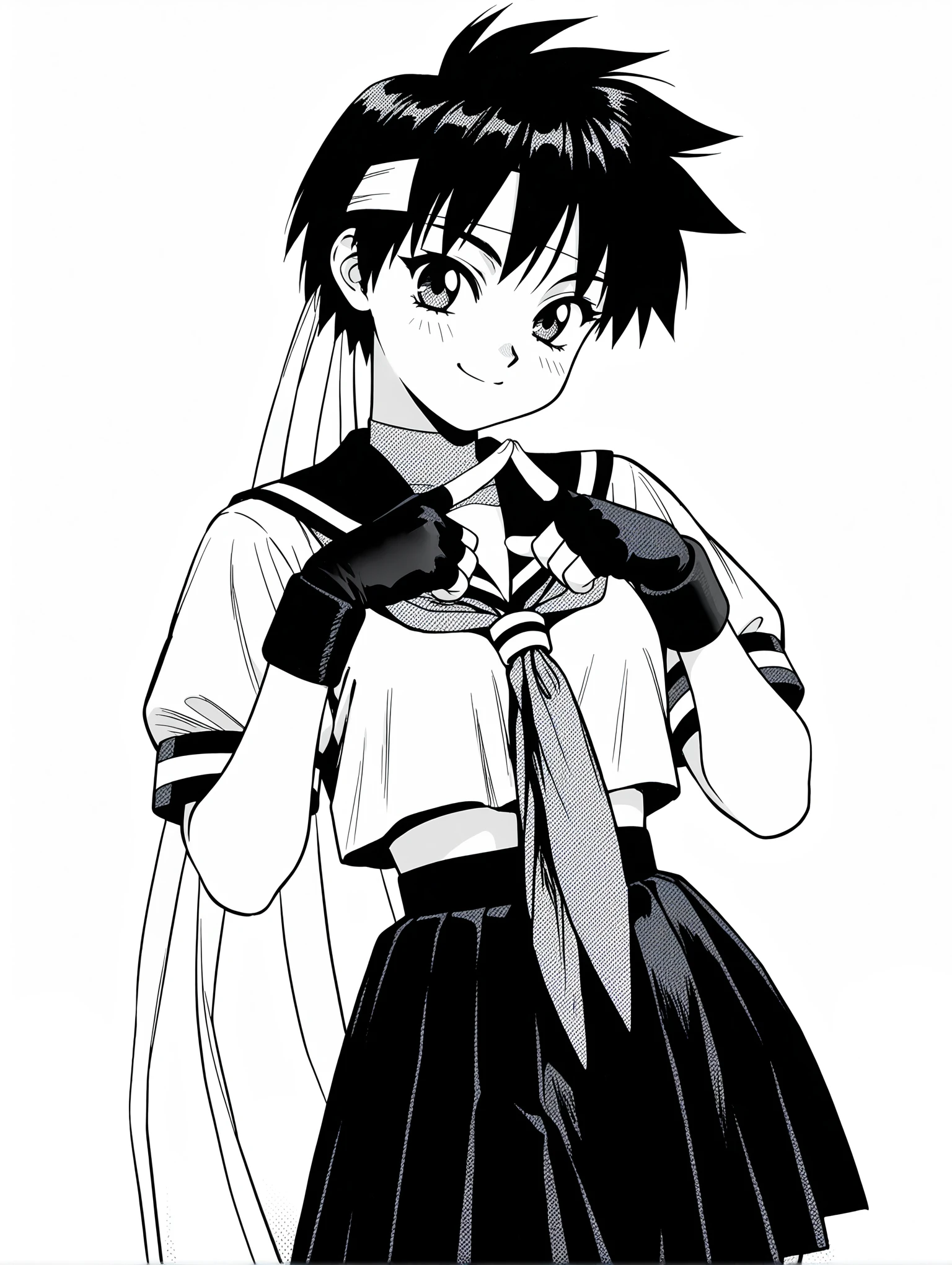 s_clothes,serafuku,neckerchief,wristband,fingerless gloves,white crop top,pleated_skirt,bobby socks,sneakers, (screentones,monochrome,grayscale,traditional media,)