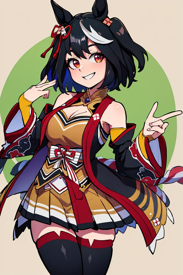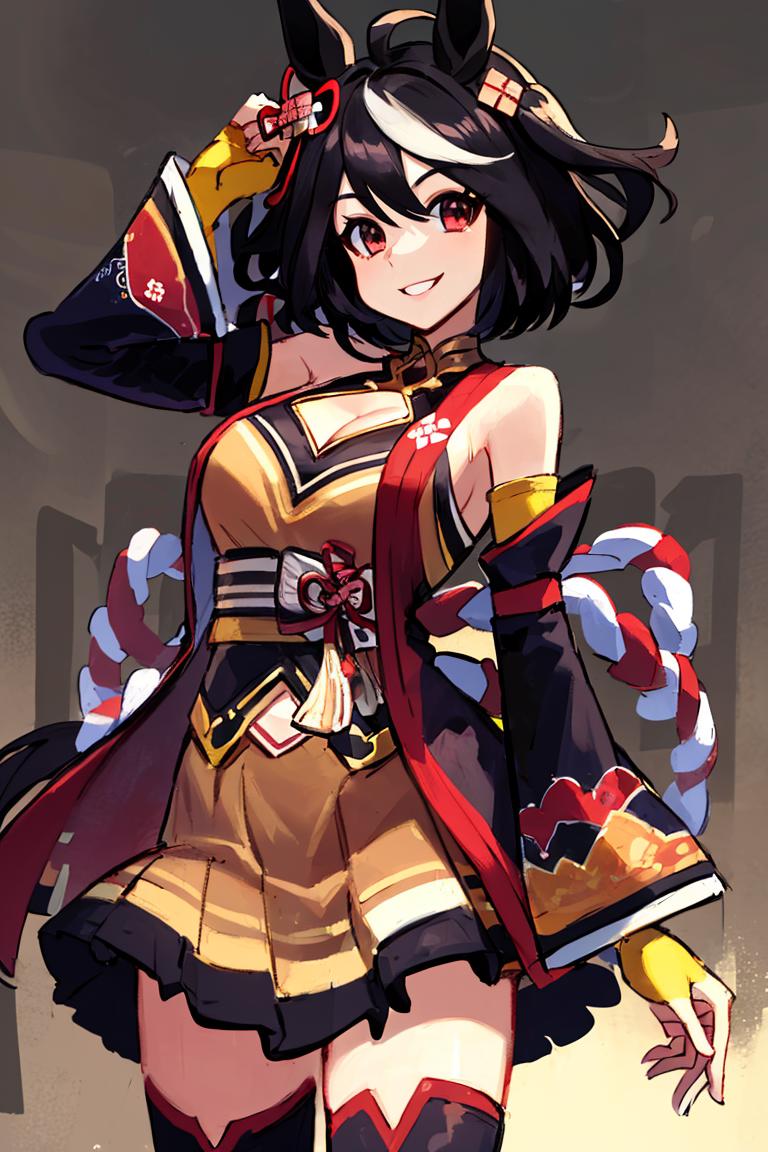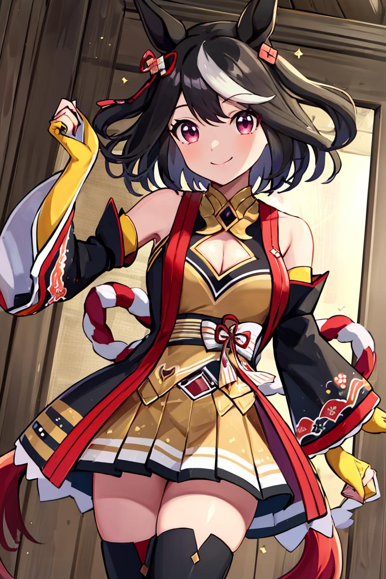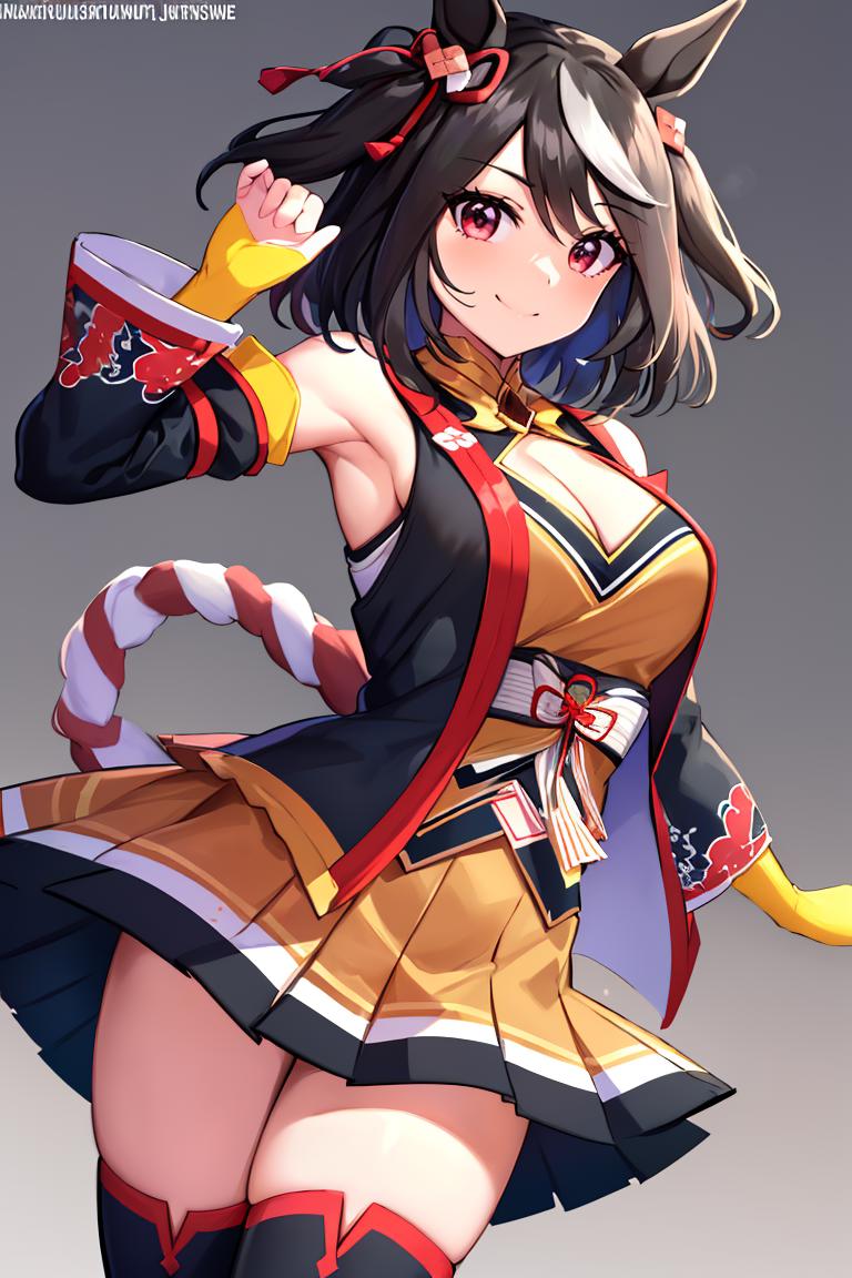 Kitasan_Black_Umamusume, animal ears, short hair, streaked hair, hair ornament, medium breasts, horse tail, cleavage, clothing cutout, detached sleeves, shimenawa, skirt, black thighhighs