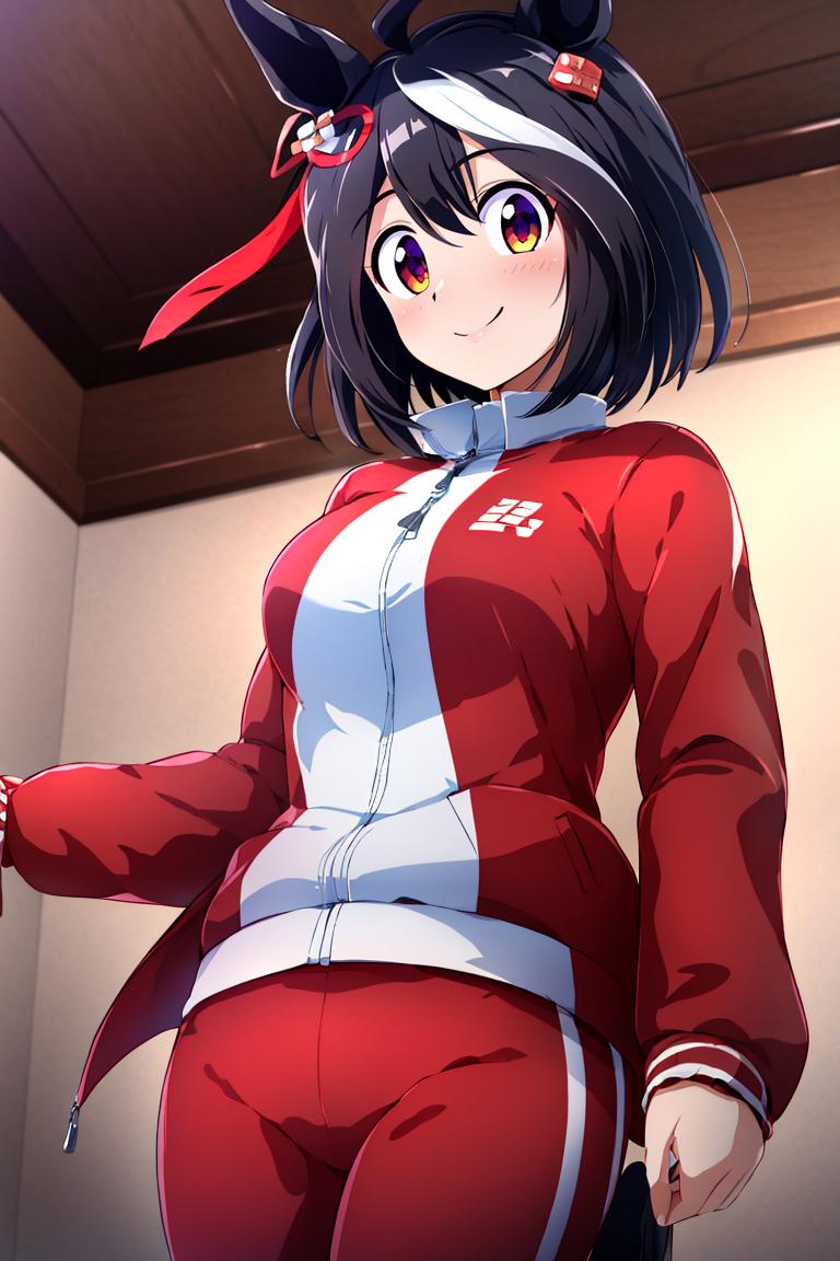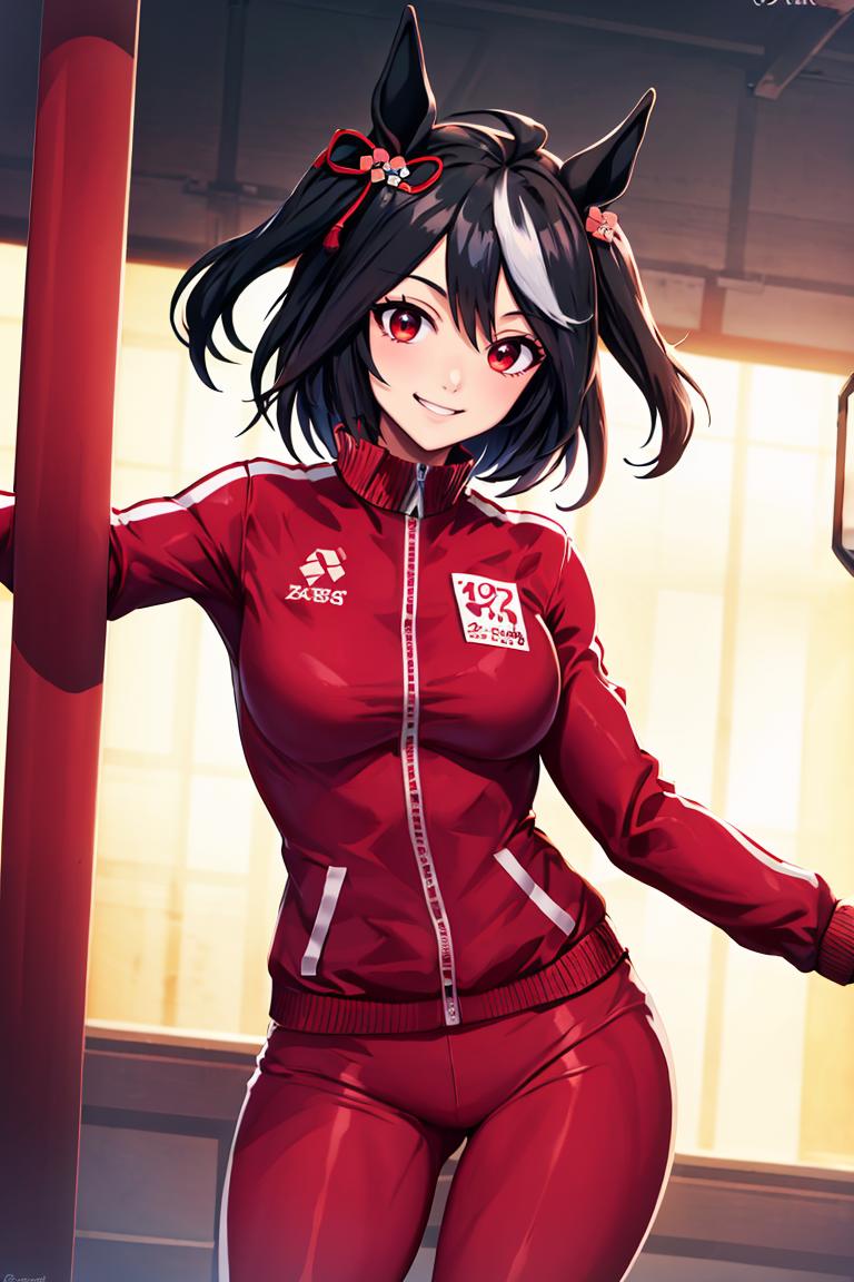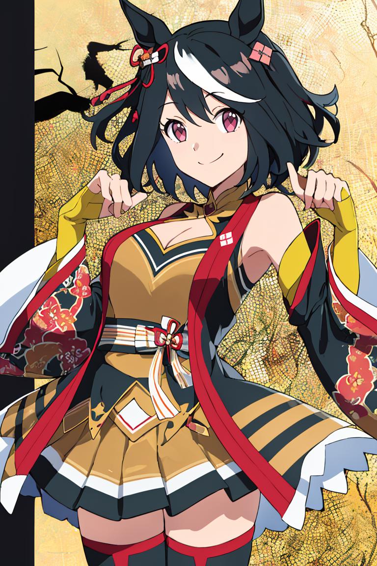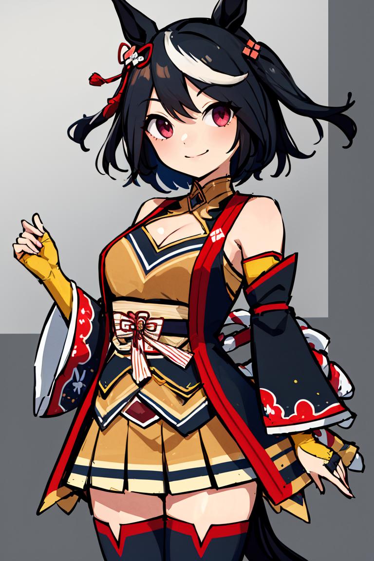 Kitasan_Black_Umamusume, animal ears, short hair, streaked hair, hair ornament, medium breasts, horse tail, cleavage, clothing cutout, detached sleeves, shimenawa, skirt, black thighhighs