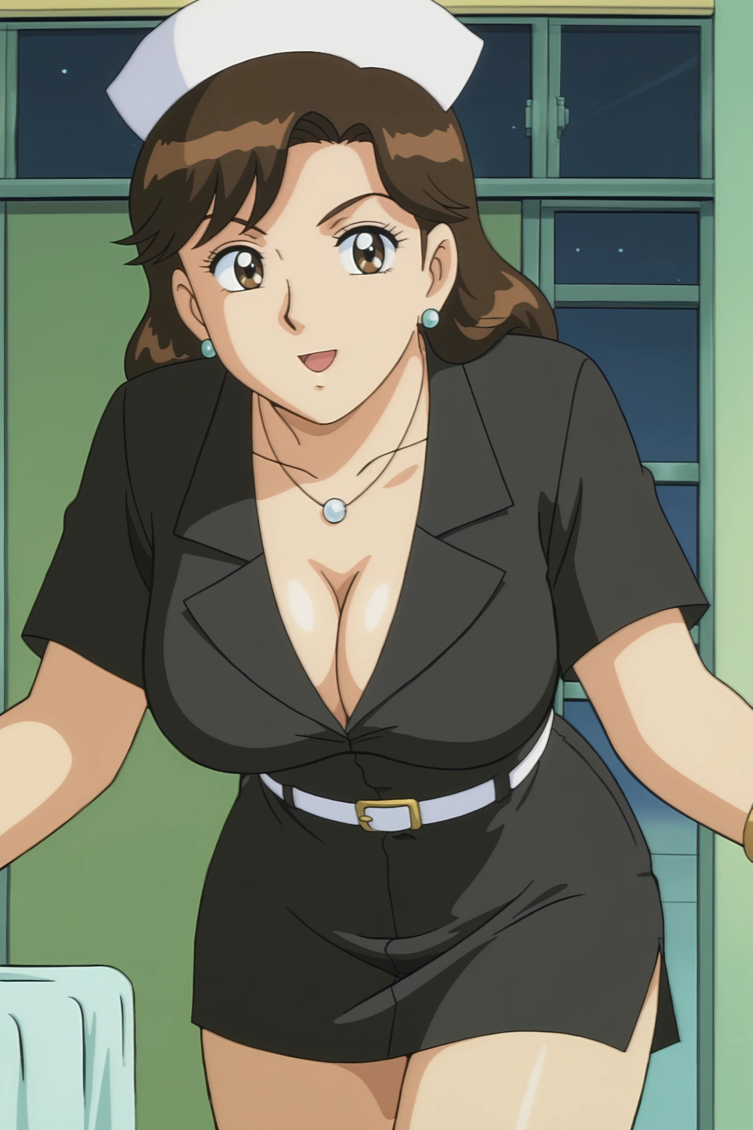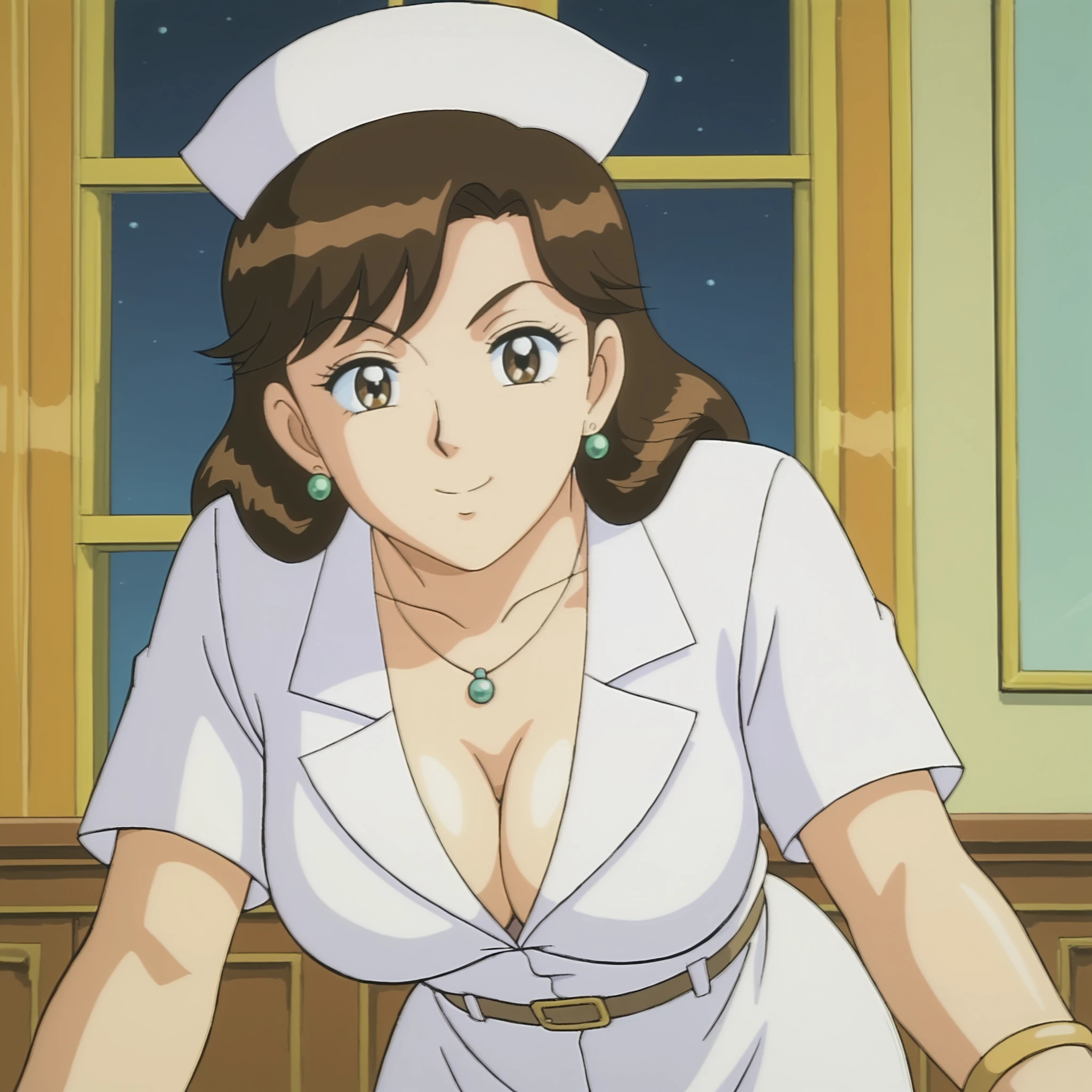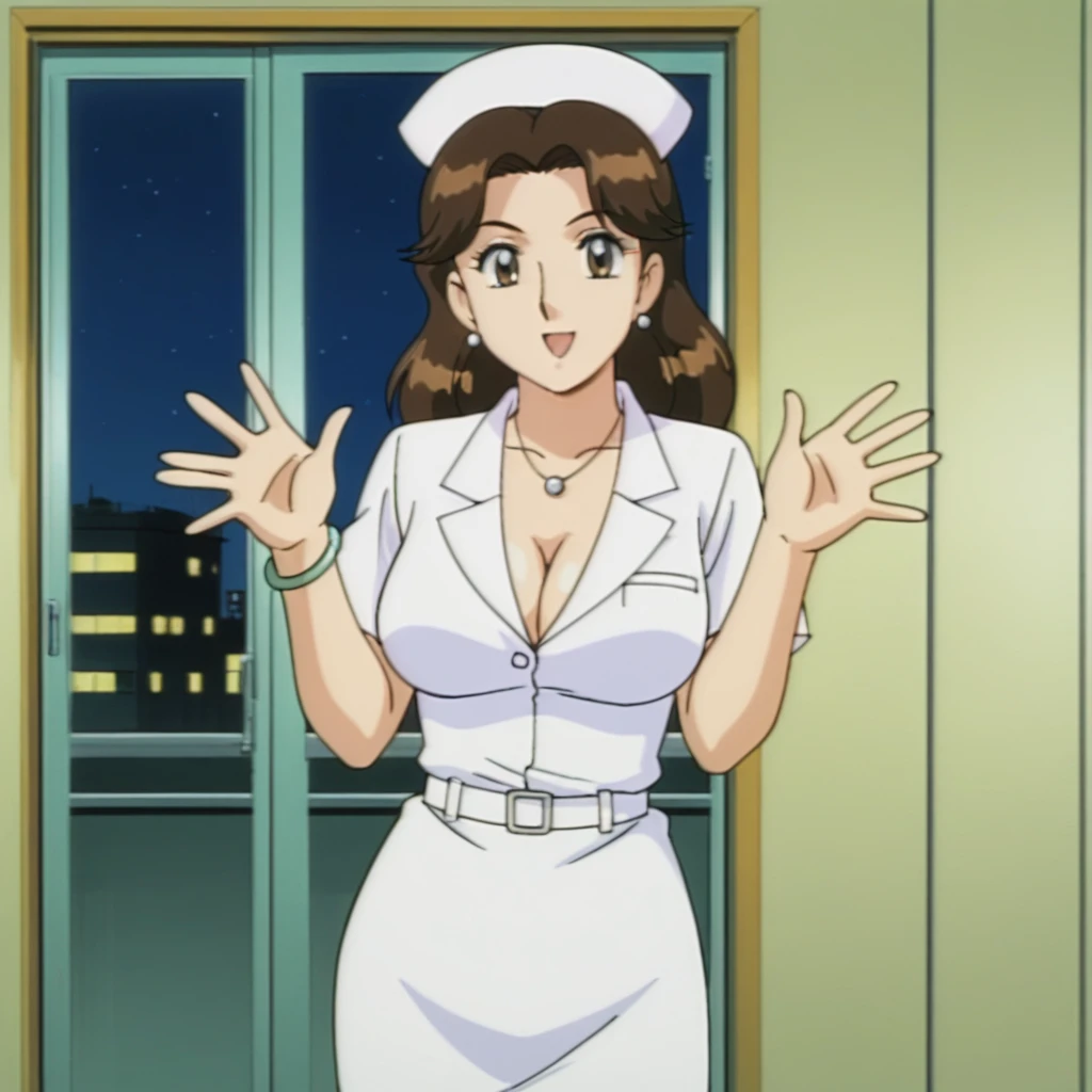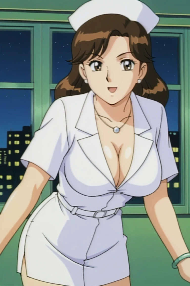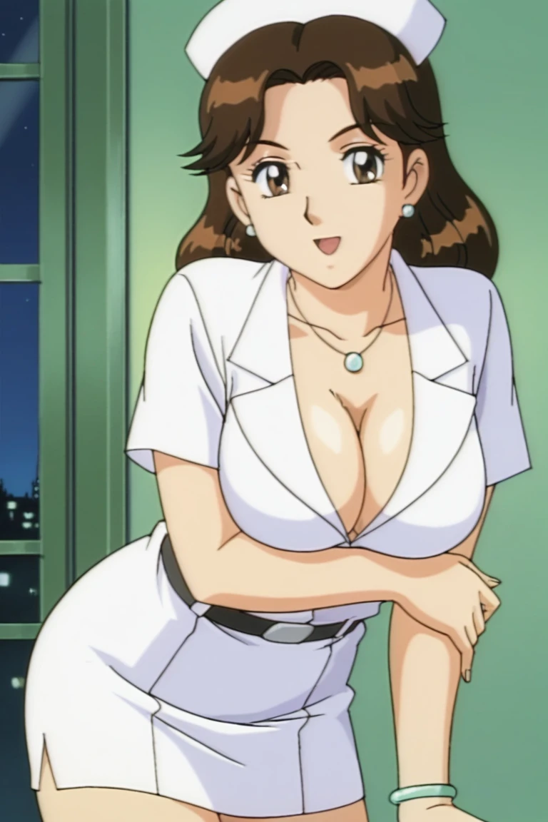 kochikame_style, kochikame_for_supporting_actress1, 2000s \(style\), retro artstyle, brown eyes, brown hair, long hair, earrings, necklace, bracelets, large breasts, collarbone, covered navel, cleavage, :d, nurse cap, nurse uniform, belt, minkskirt, indoors, carbin, night, looking_at_viewer
