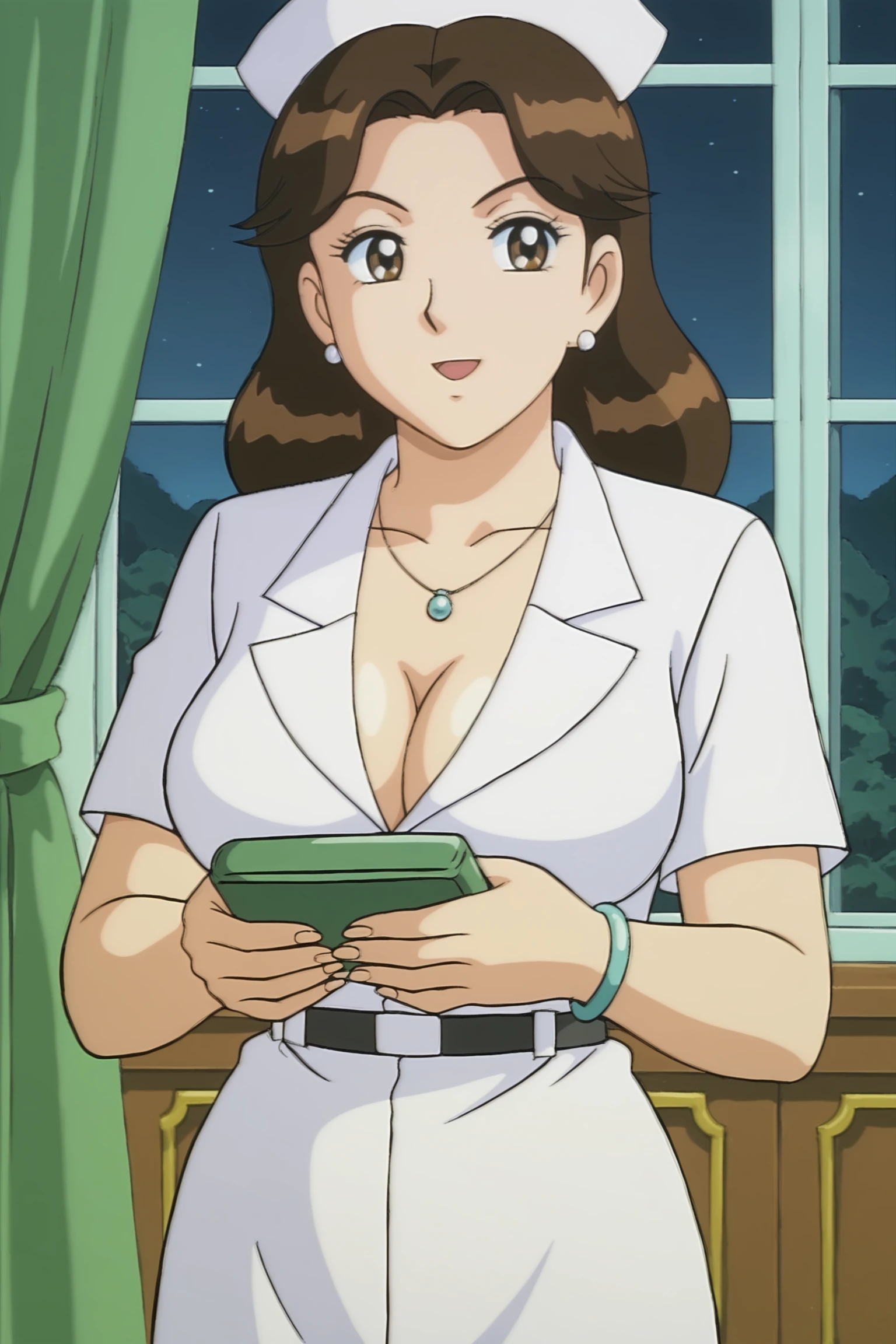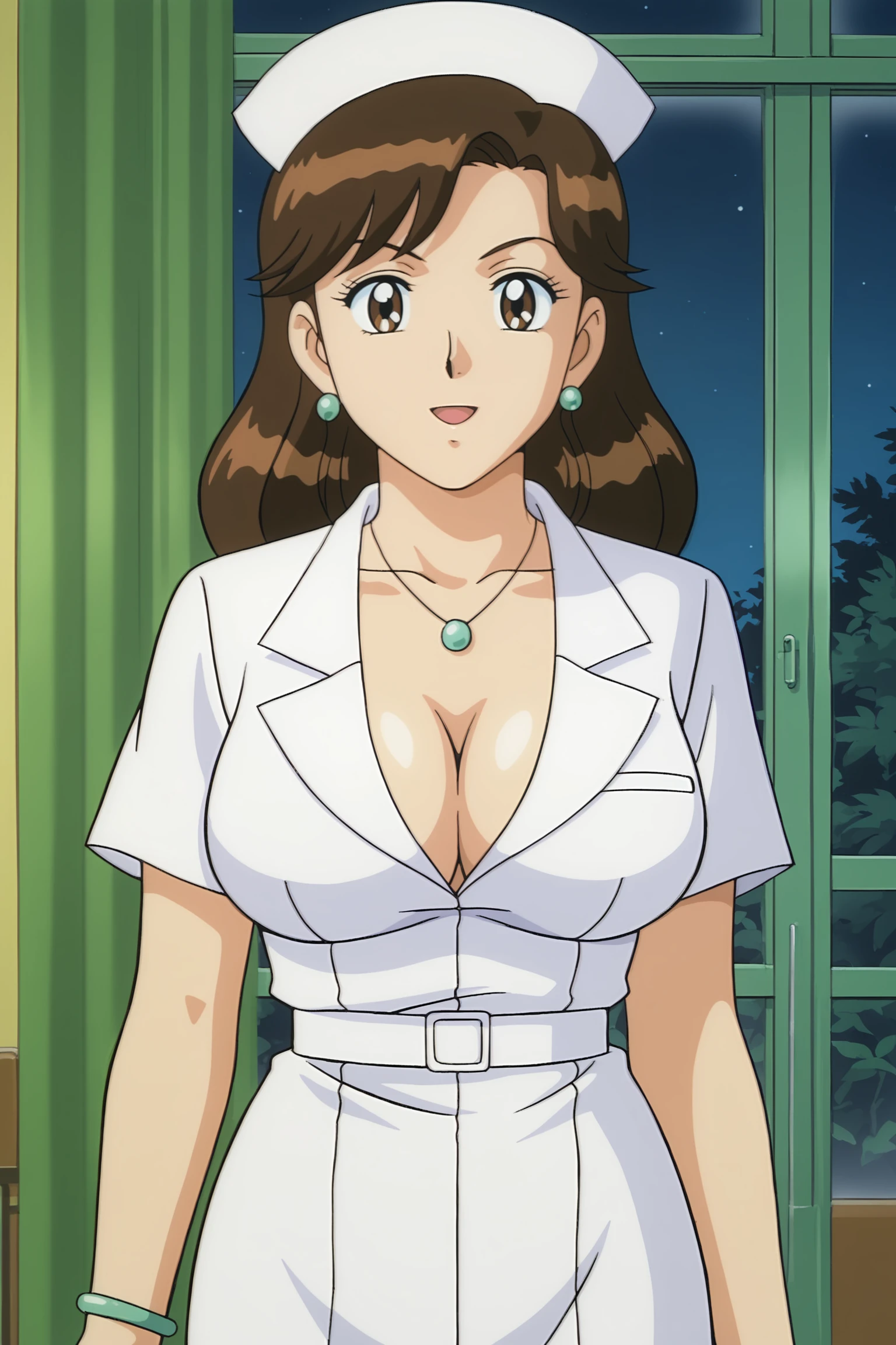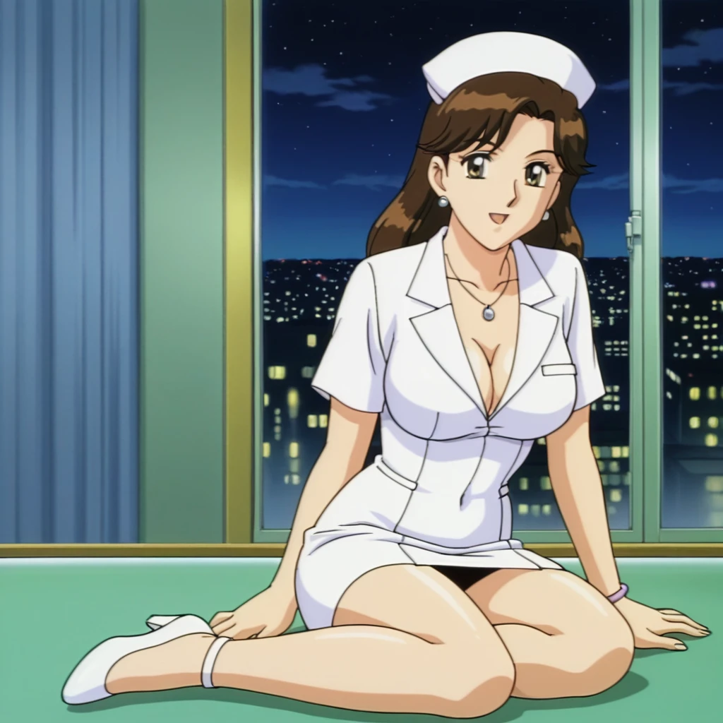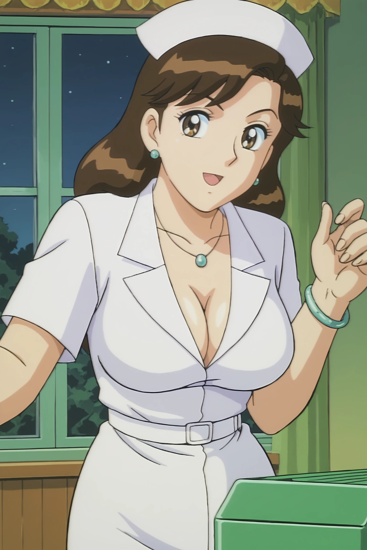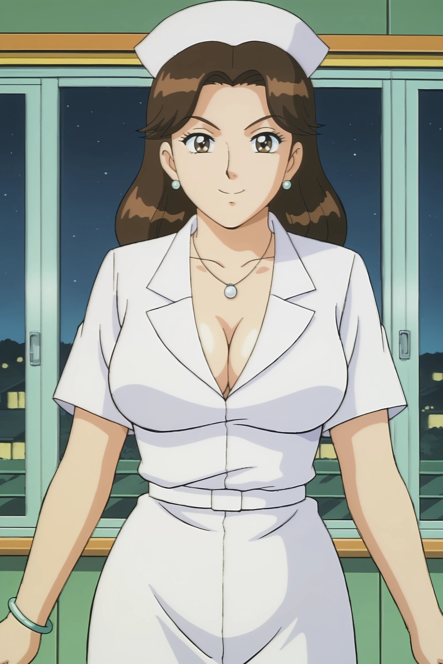 kochikame_style, kochikame_for_supporting_actress1, 2000s \(style\), retro artstyle, brown eyes, brown hair, long hair, earrings, necklace, bracelets, large breasts, collarbone, covered navel, cleavage, :d, nurse cap, nurse uniform, belt, minkskirt, indoors, carbin, night, looking_at_viewer