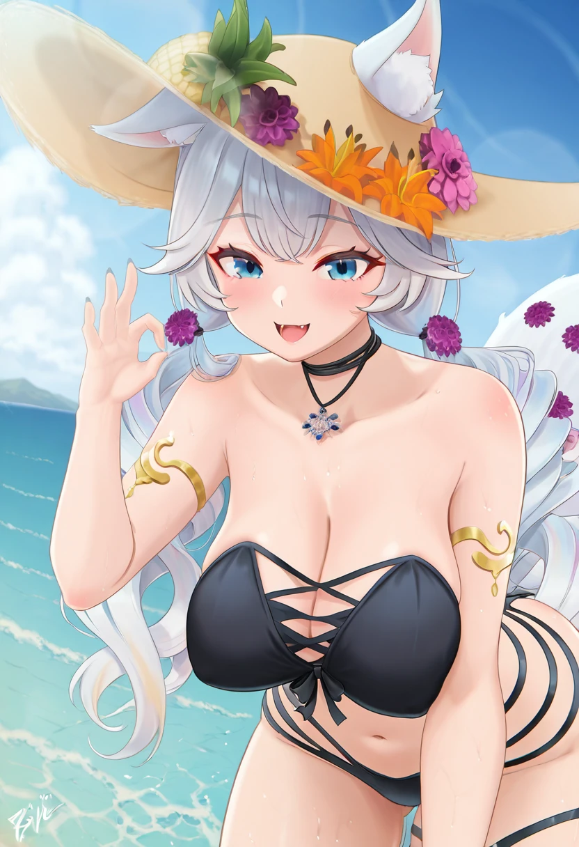 zzKirsche, blue eyes, long hair, white hair, fox ears, animal ear fluff, fox girl, multicolored hair, animal ears, long hair, twintails, tail, sun hat, hat flower, ears through headwear, black choker, necklace, golden armlet, black bikini, strapless bikini, thigh strap,