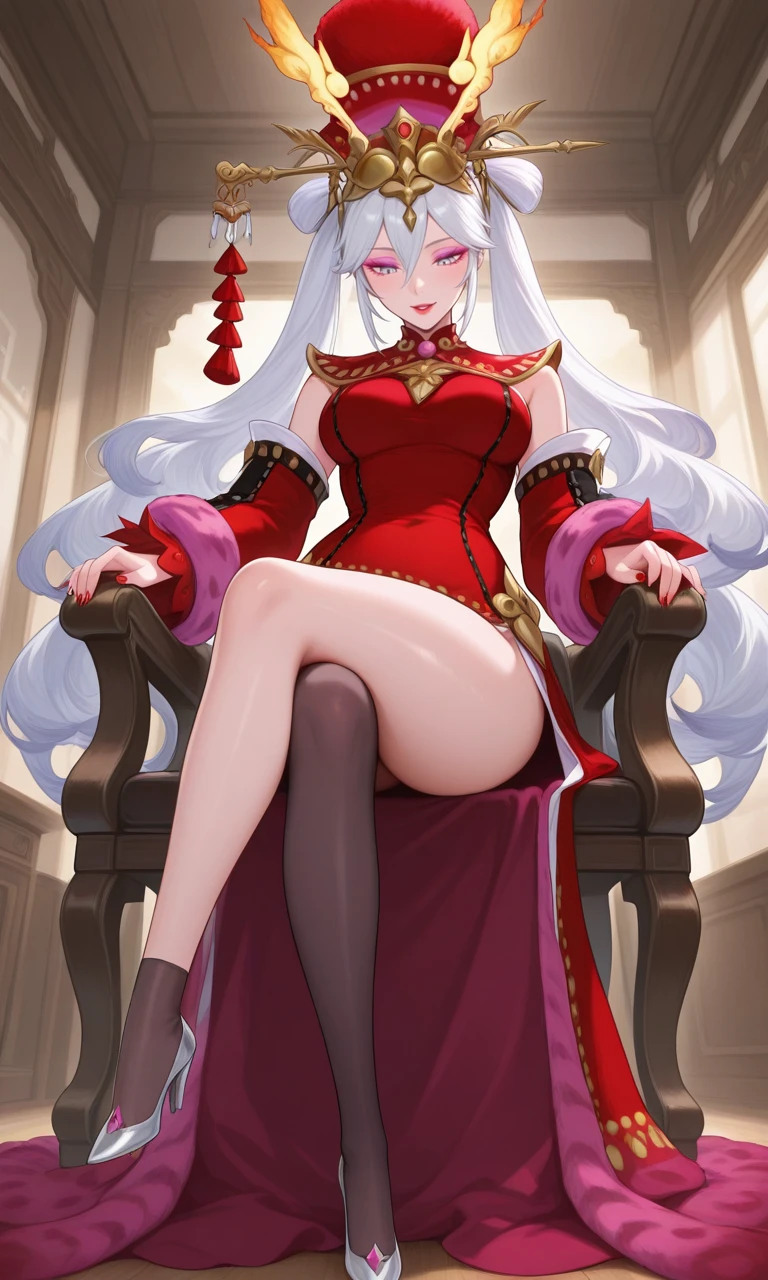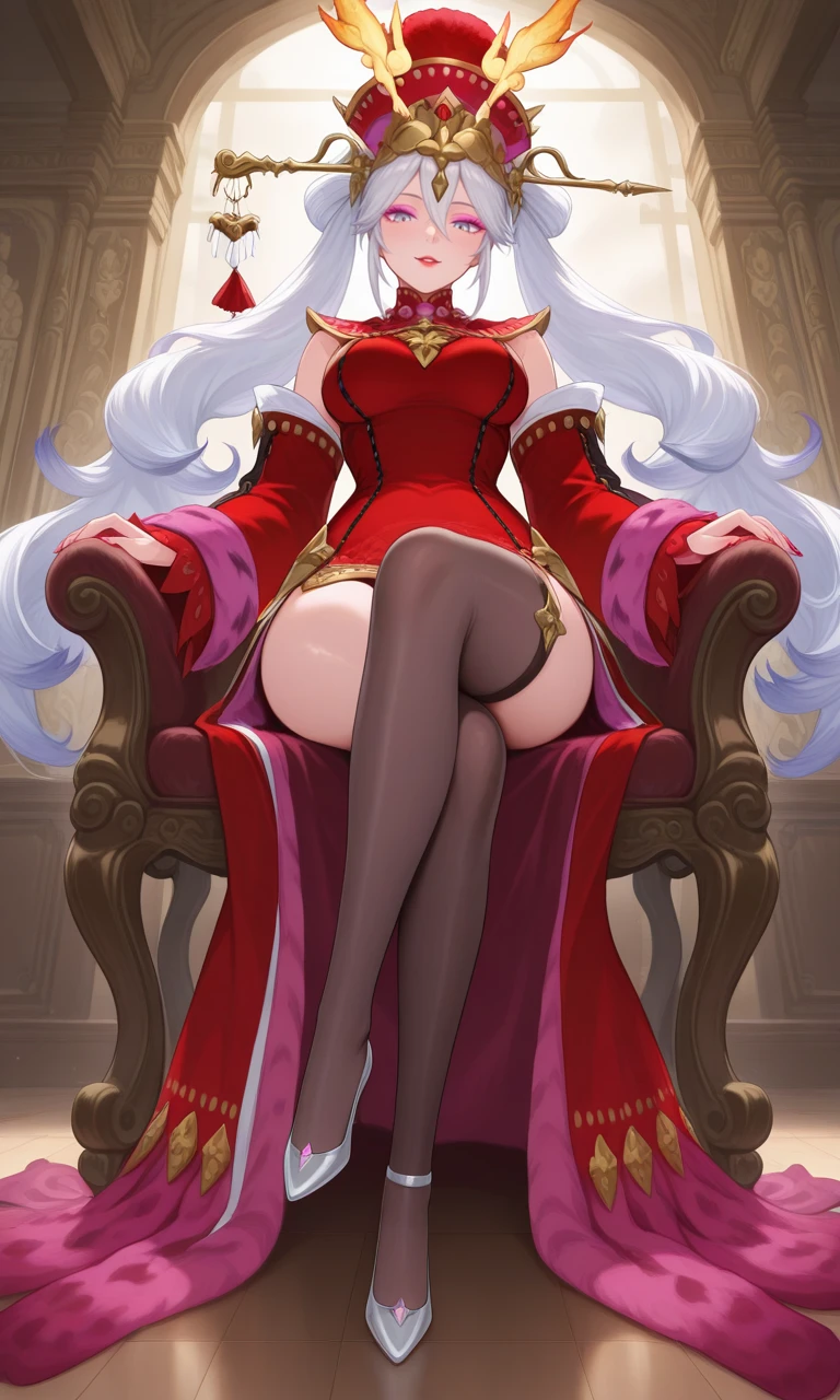 miho(sk), white hair, long twintails, wavy hair, Sky Blue eyes, pink eyeshadow, red lipstick, long nail, Red nail, red hat, gold decorations, chinese hairpin, red dress, Fuchsia robe, black and red stocking, Silver heels,