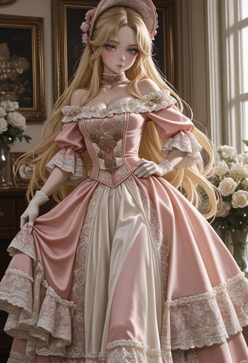 jewelry, hat, layered fabric, white gloves, black gloves, lace, bow, choker, earrings, gold details, golden details, necklace, elbow gloves, frills, hair ornament, hair flower, flowers, flower bouquet, bare shoulders, barefoot