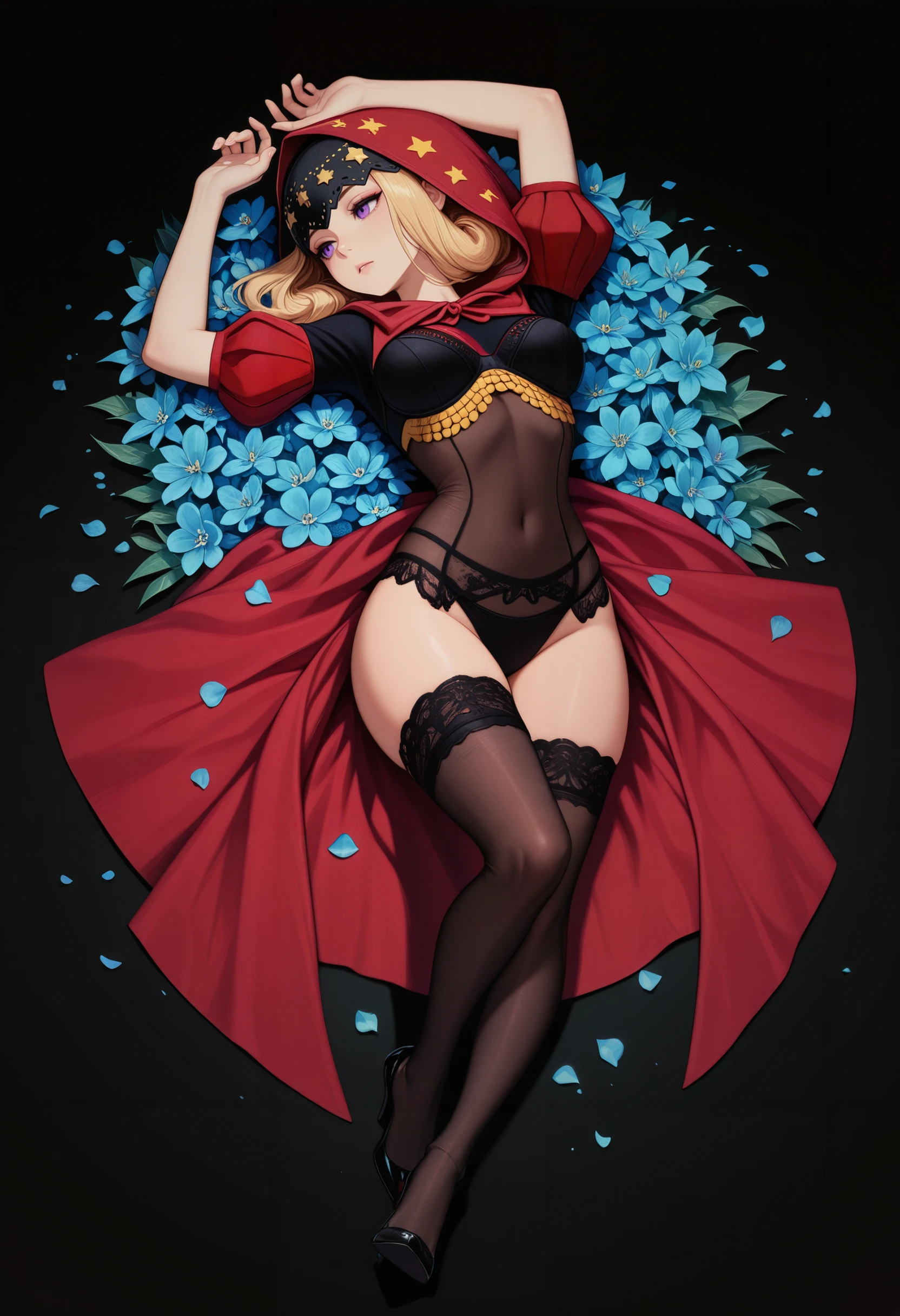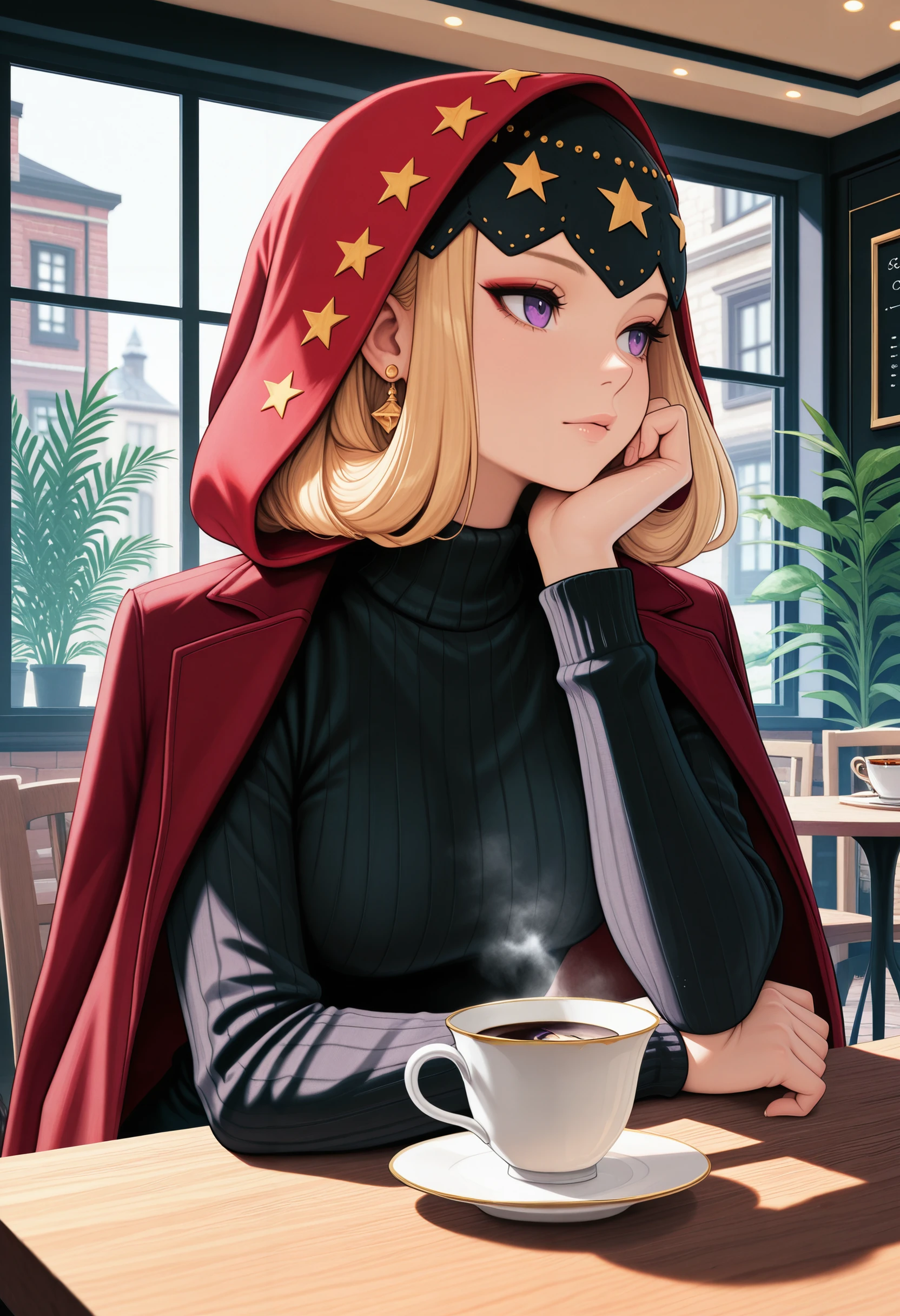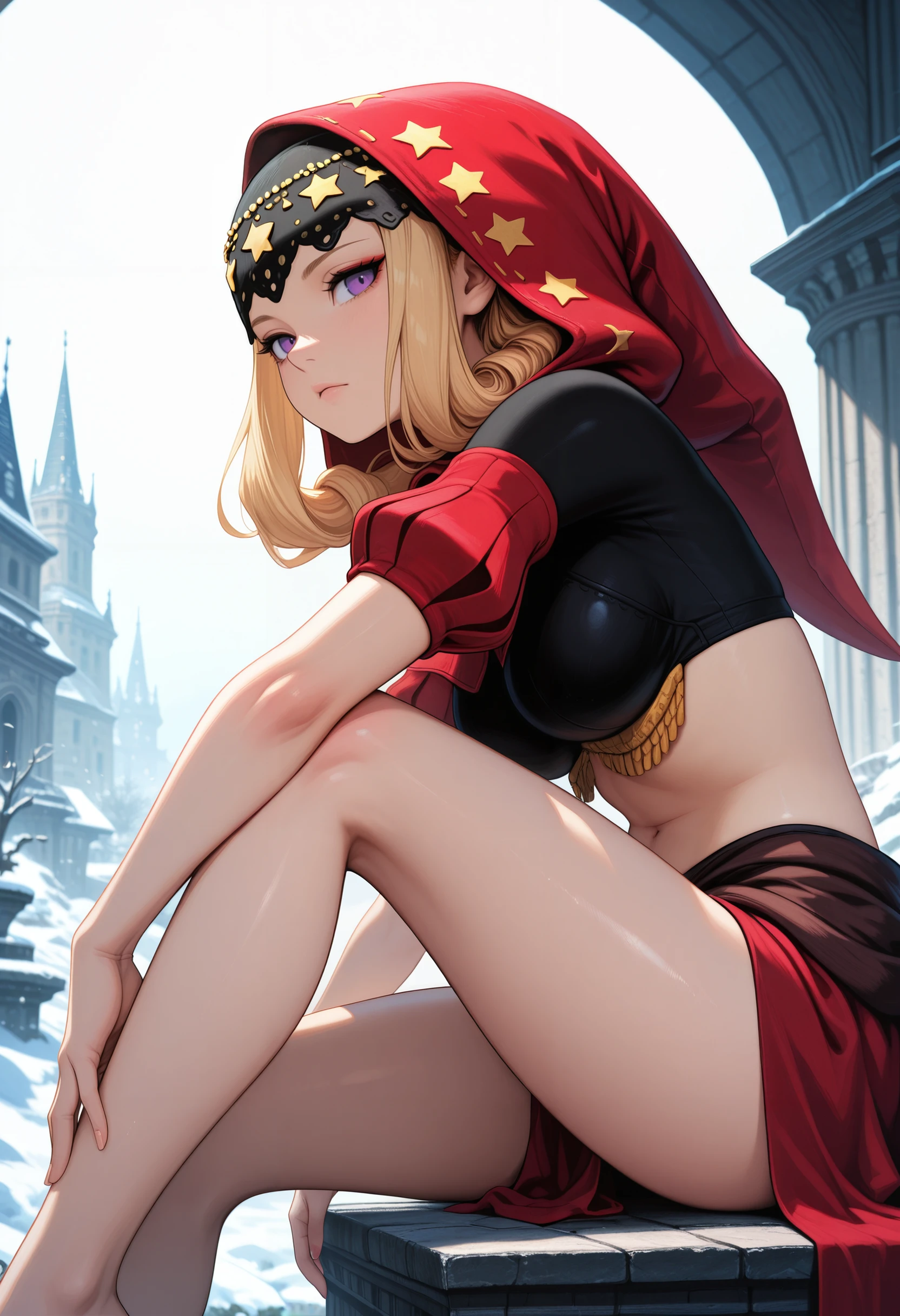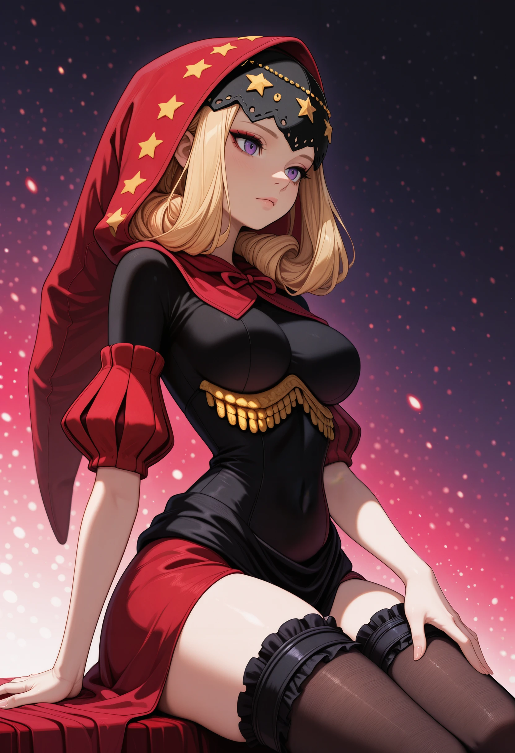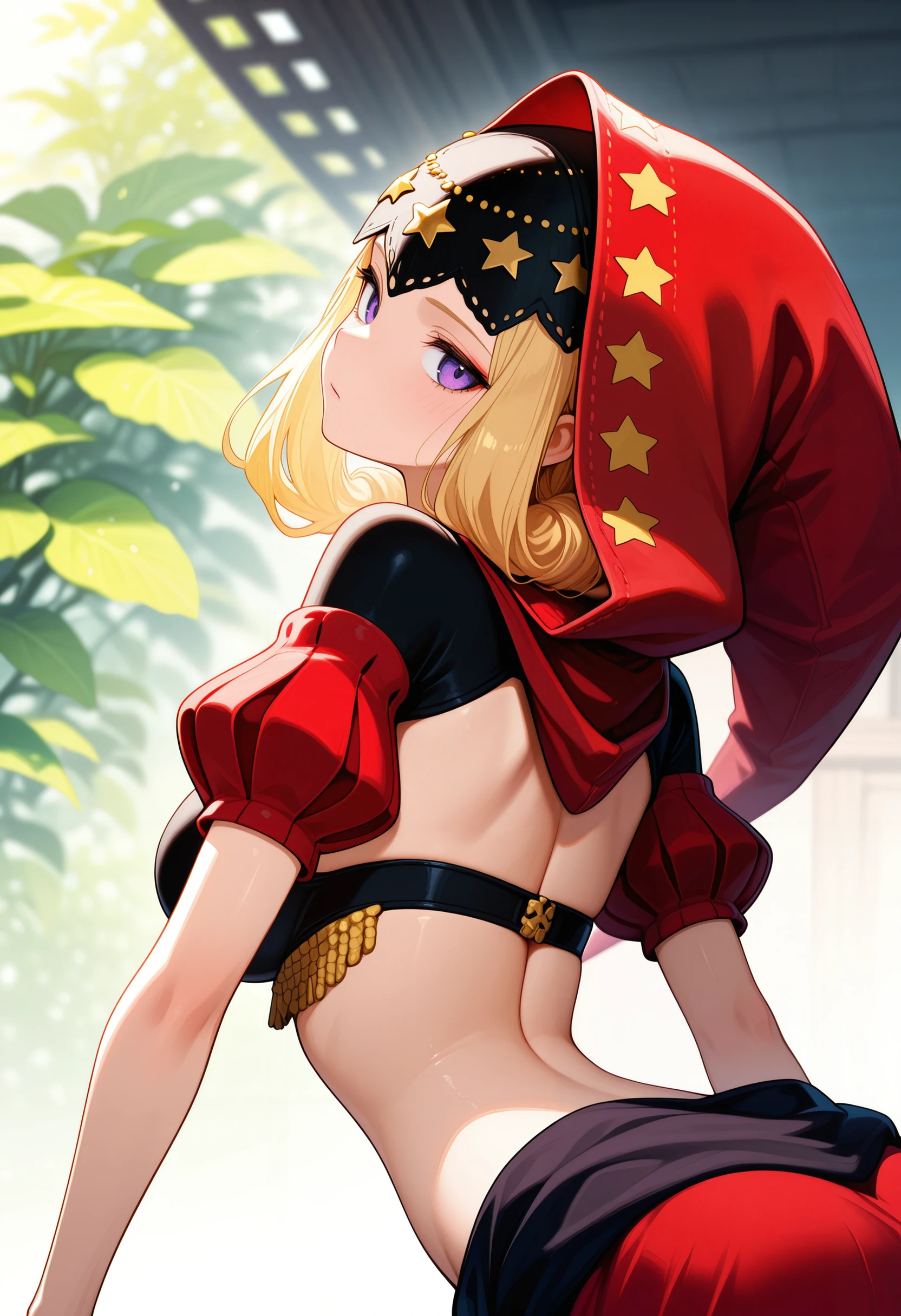 ODVelet, 1girl, blonde hair, short hair, purple eyes, hood