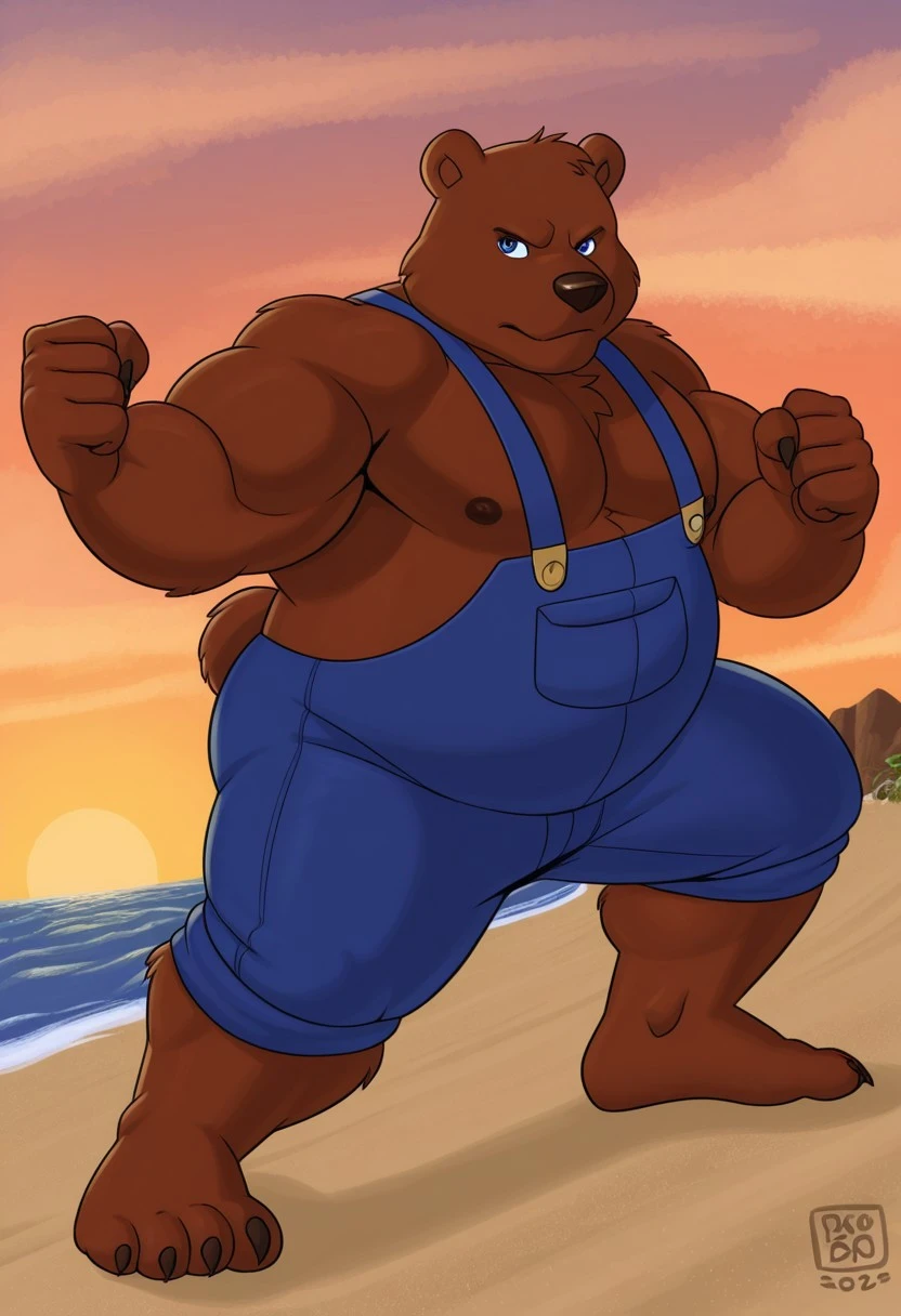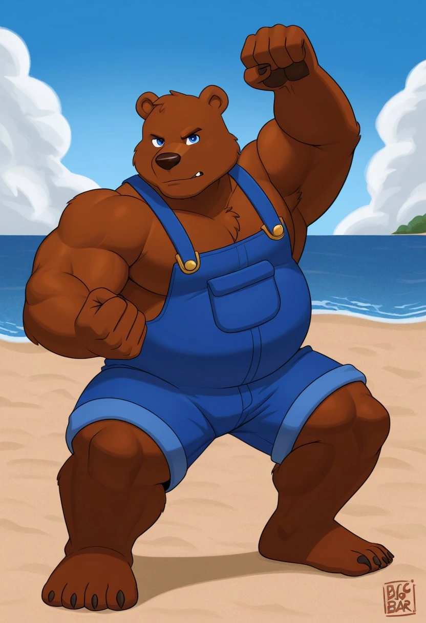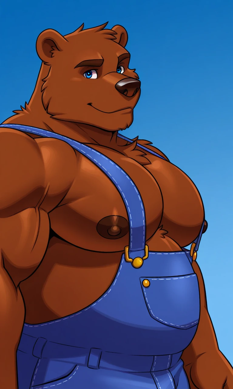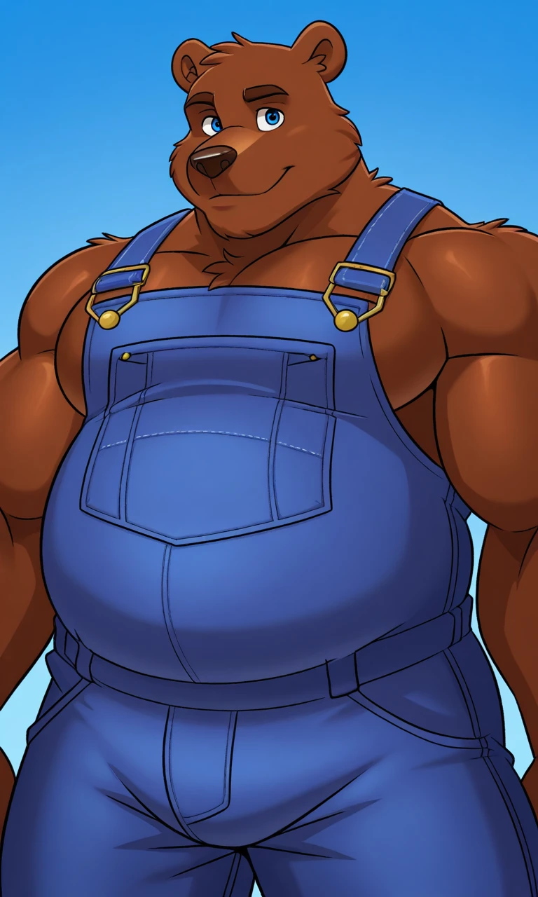 Ivanthebear, Anthro, furry, bear, male, solo,Full brown fur, blue eyes, Blue overalls, musclegut