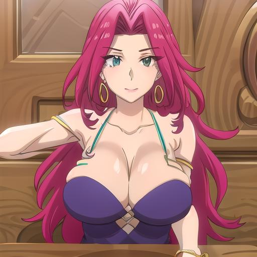 Night version: earrings, hair intakes, hoop earrings, purple hair, large breasts, bracelet,
