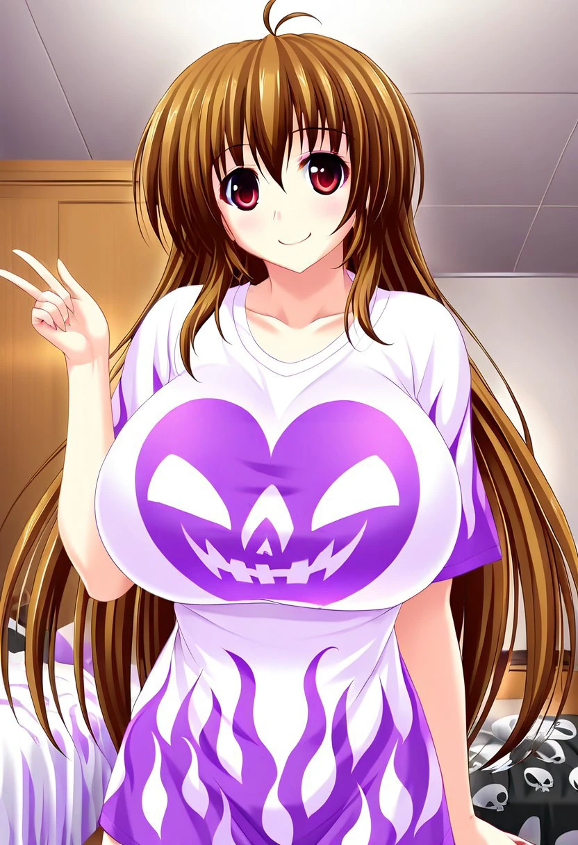 nanami odera shabura rental game cg style, long hair, brown hair, ahoge, red eyes, huge breasts,