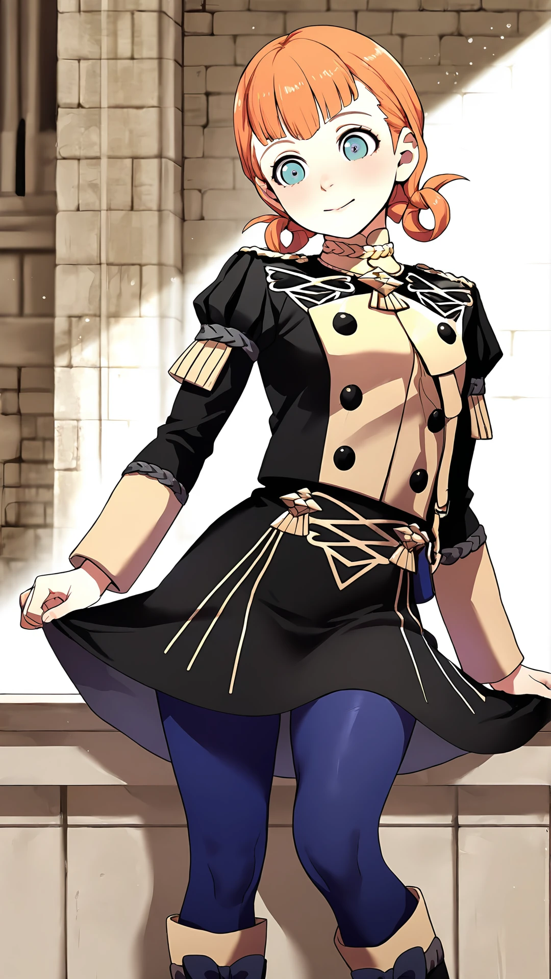 Annette,1girl,annette fantine dominic,garreg mach monastery uniform,solo,orange hair,twintails,boots,blue eyes,blue pantyhose,long sleeves,uniform,pantyhose,black footwear,knee boots,skirt,
