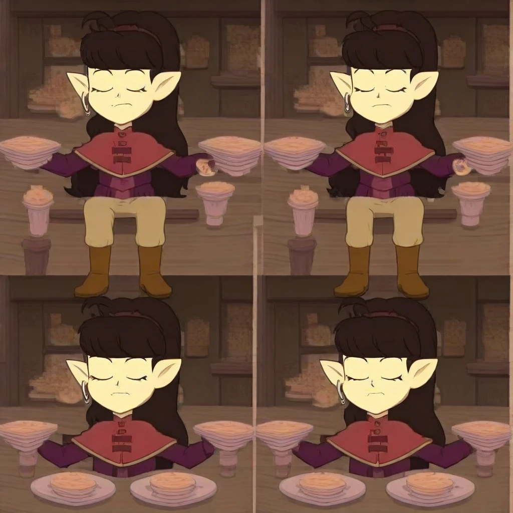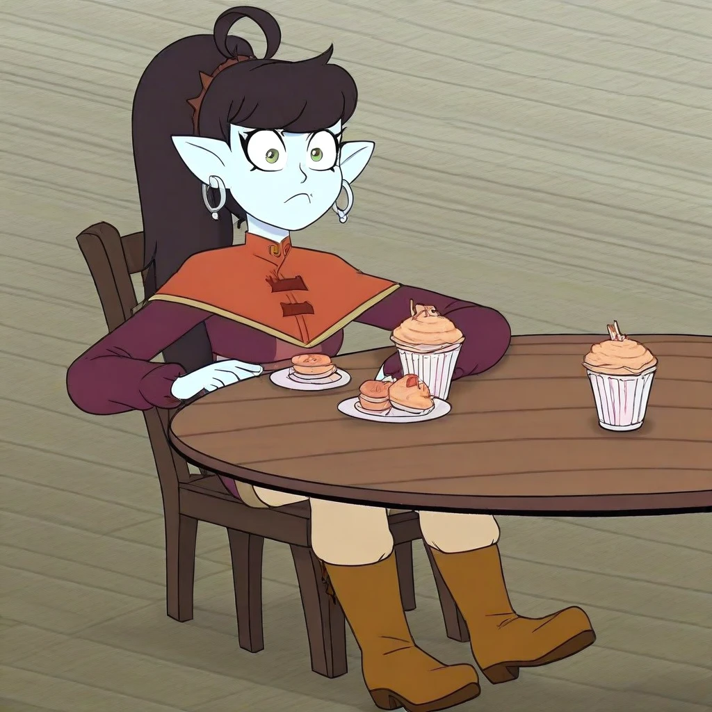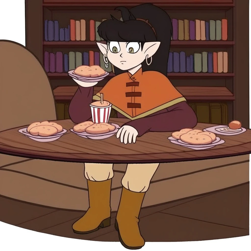 1girl, sitting, colored skin, simple background, food, table, pointy ears, earrings, boots, solo, meme, Viney (epilogue)