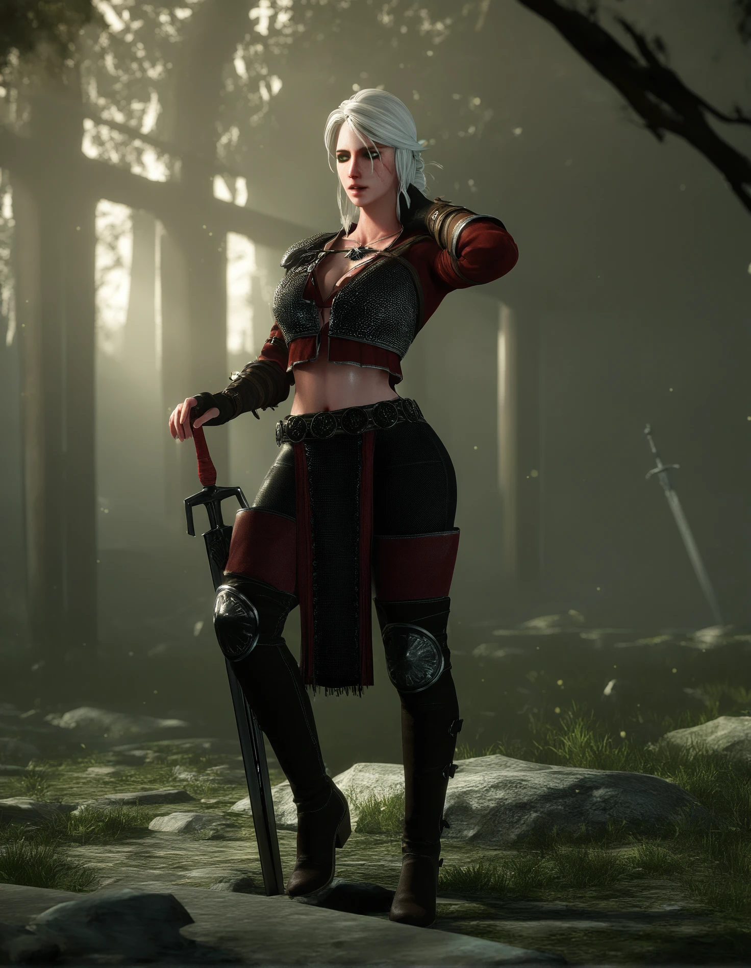chainmail, crop top, red sleeves, midriff, pelvic curtain, black pants, black knee boots, knee pads, shoulder belt, fingerless gloves, red thigh boots, studded belt