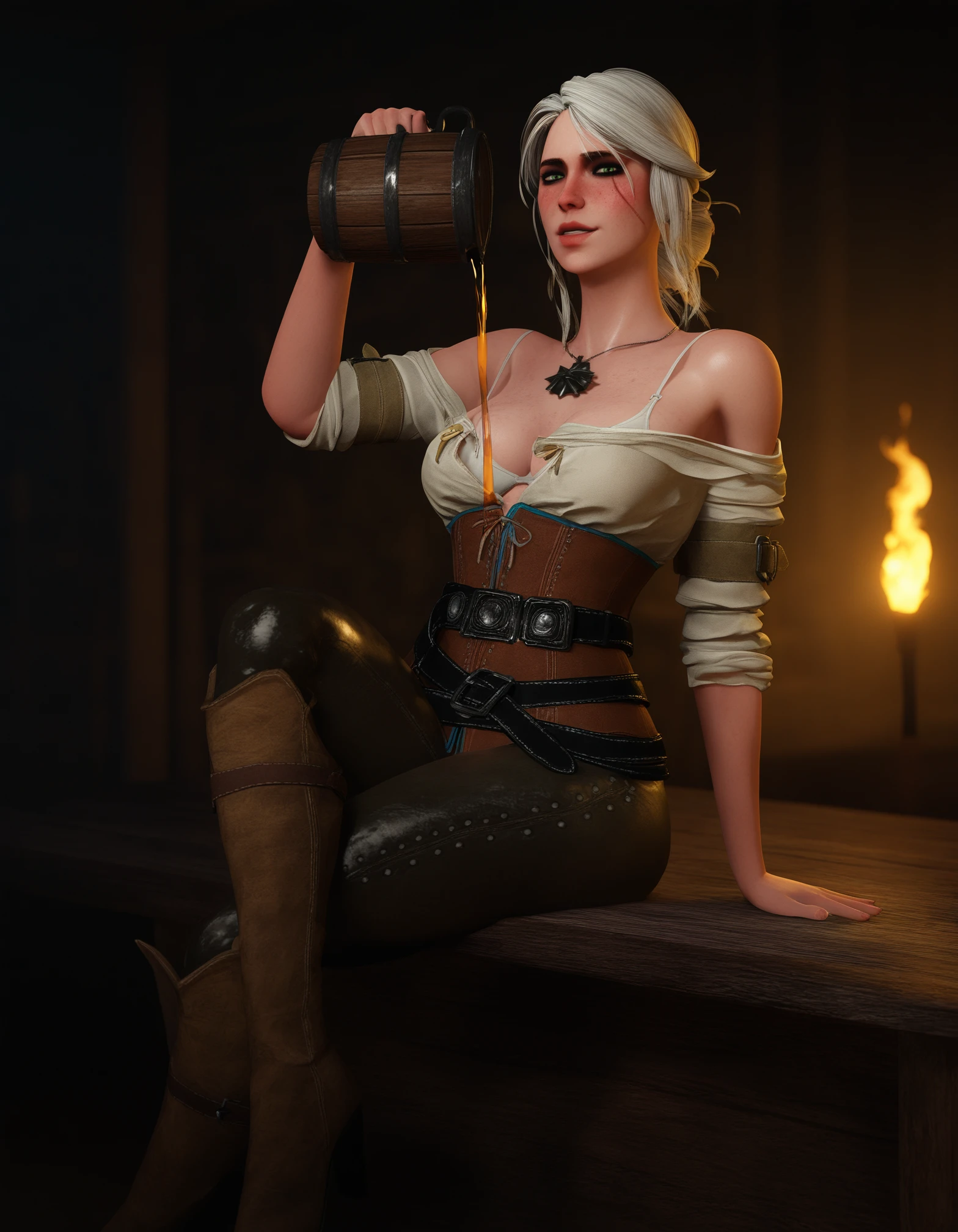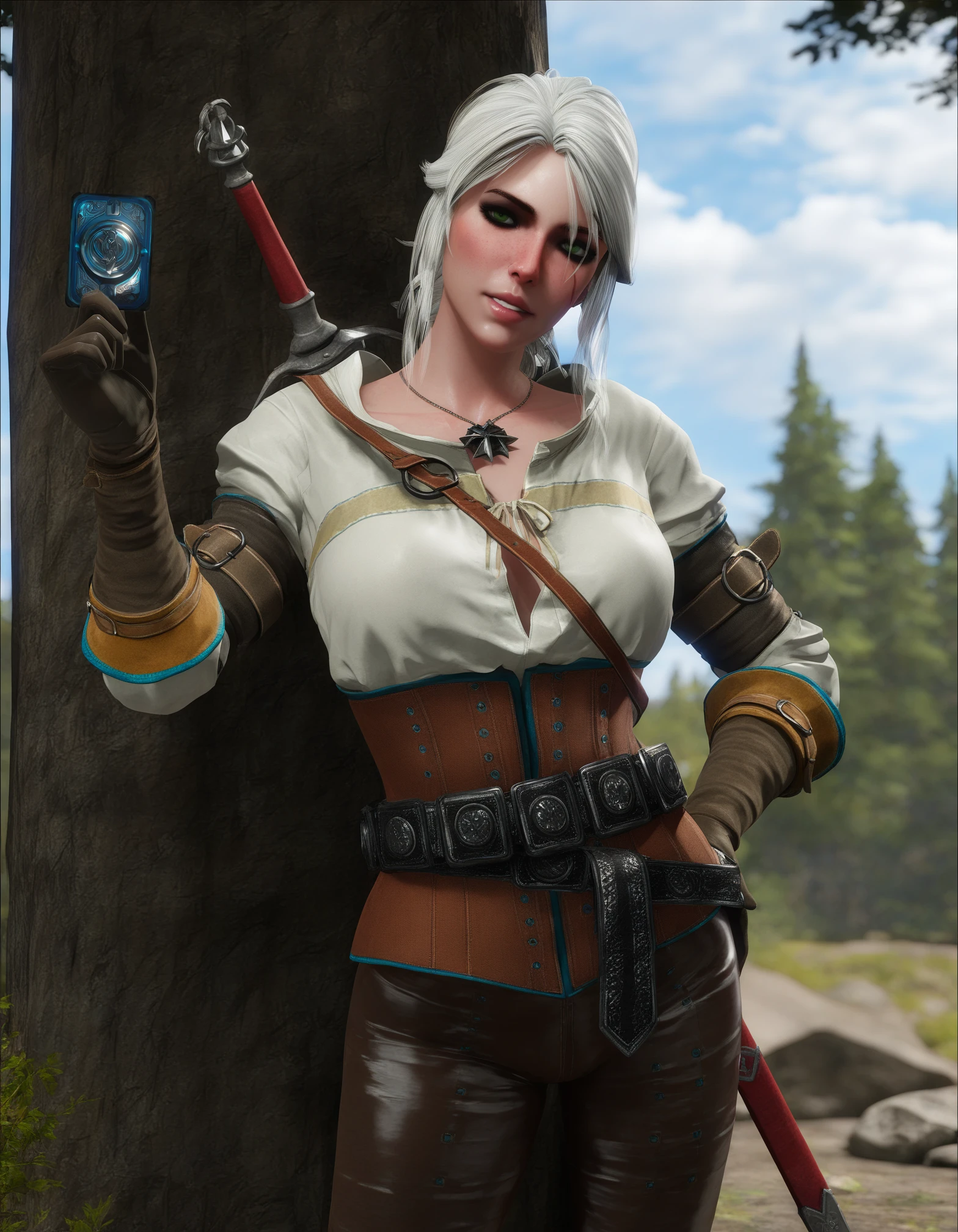 1girl, ciri, witcher medallion, white hair, green eyes, freckles, updo, single hair bun, scar across eye