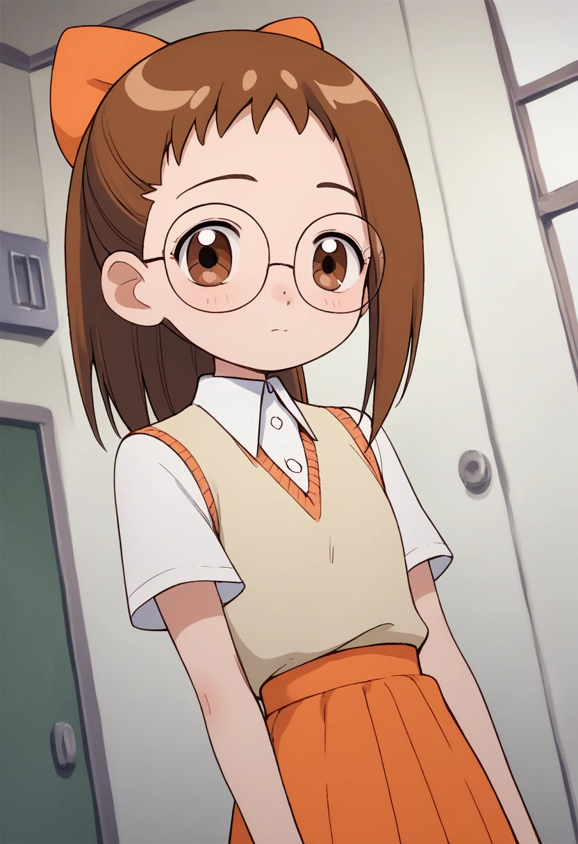 score_9, score_8_up, score_7_up, score_6_up, score_5_up, score_4_up, masterpiece, source_anime BREAK 1girl, c-hazuki, flat chest, brown hair, glasses, brown eyes, ponytail, hair bow, white collared shirt, beige sweater vest, short sleeves, orange skirt, looking at viewer, cowboy shot, Negative prompt ❌: