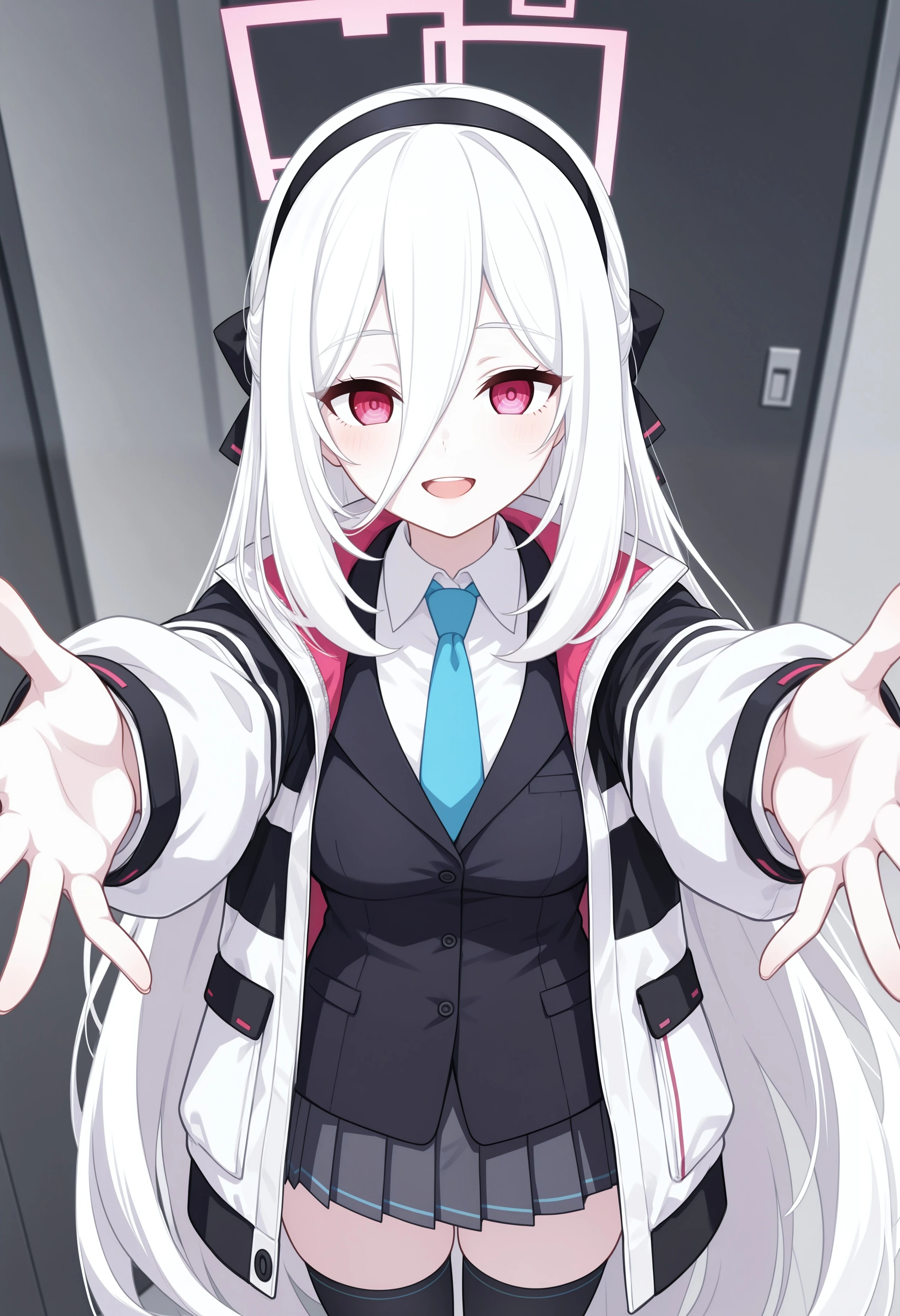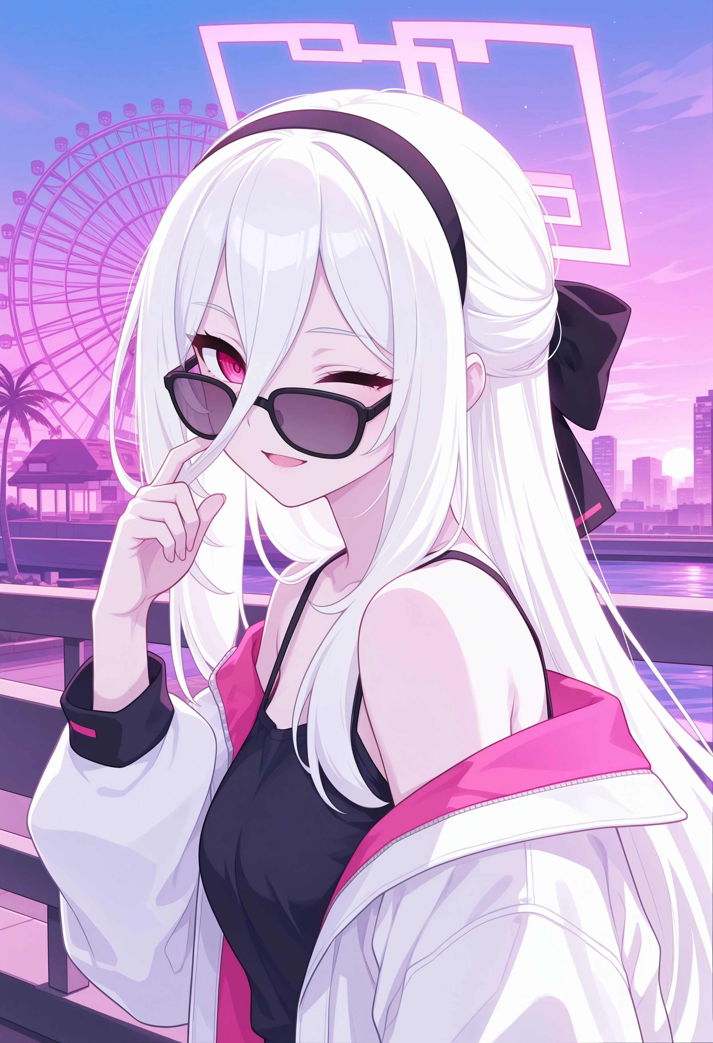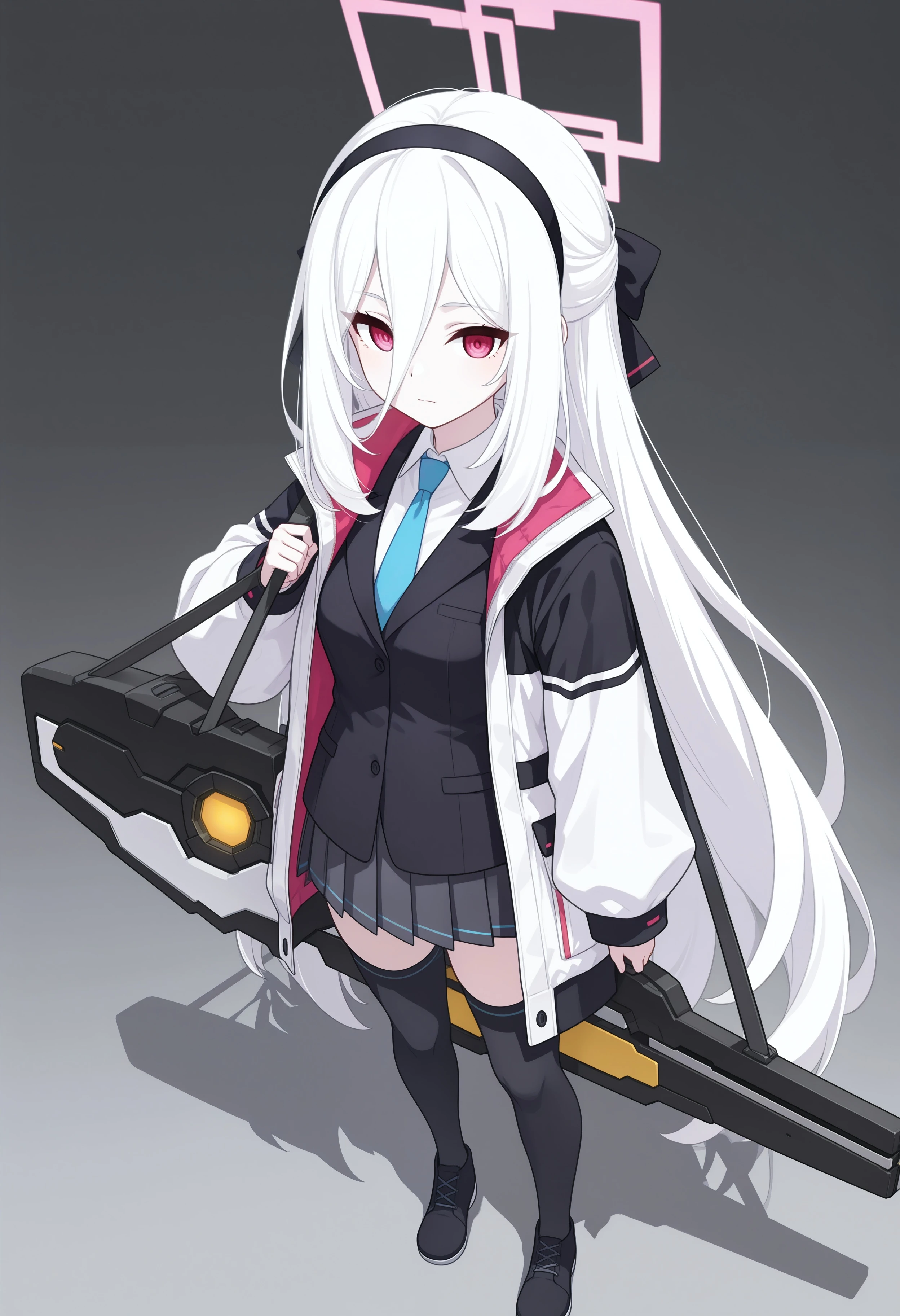 white hair, black hairbow, red eyes, kei halo, black hairband,