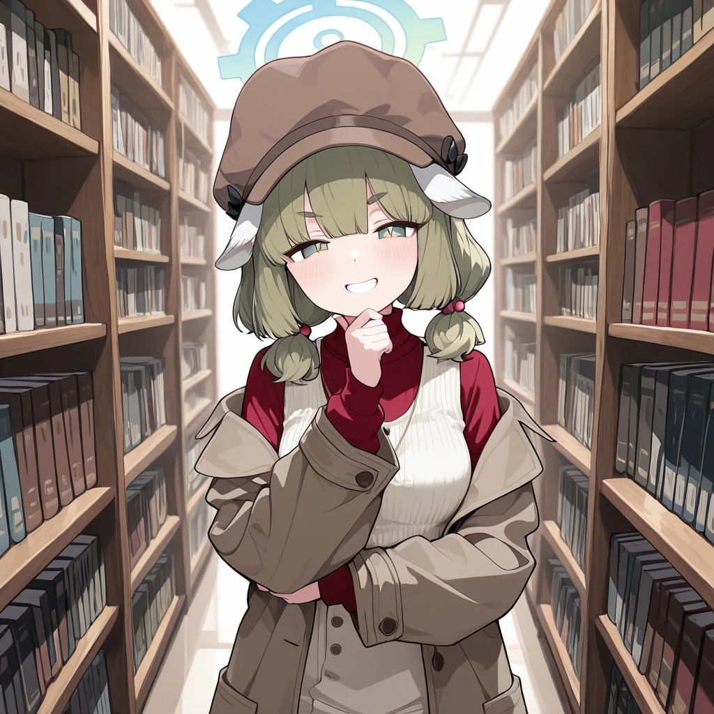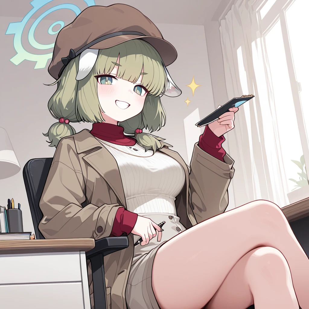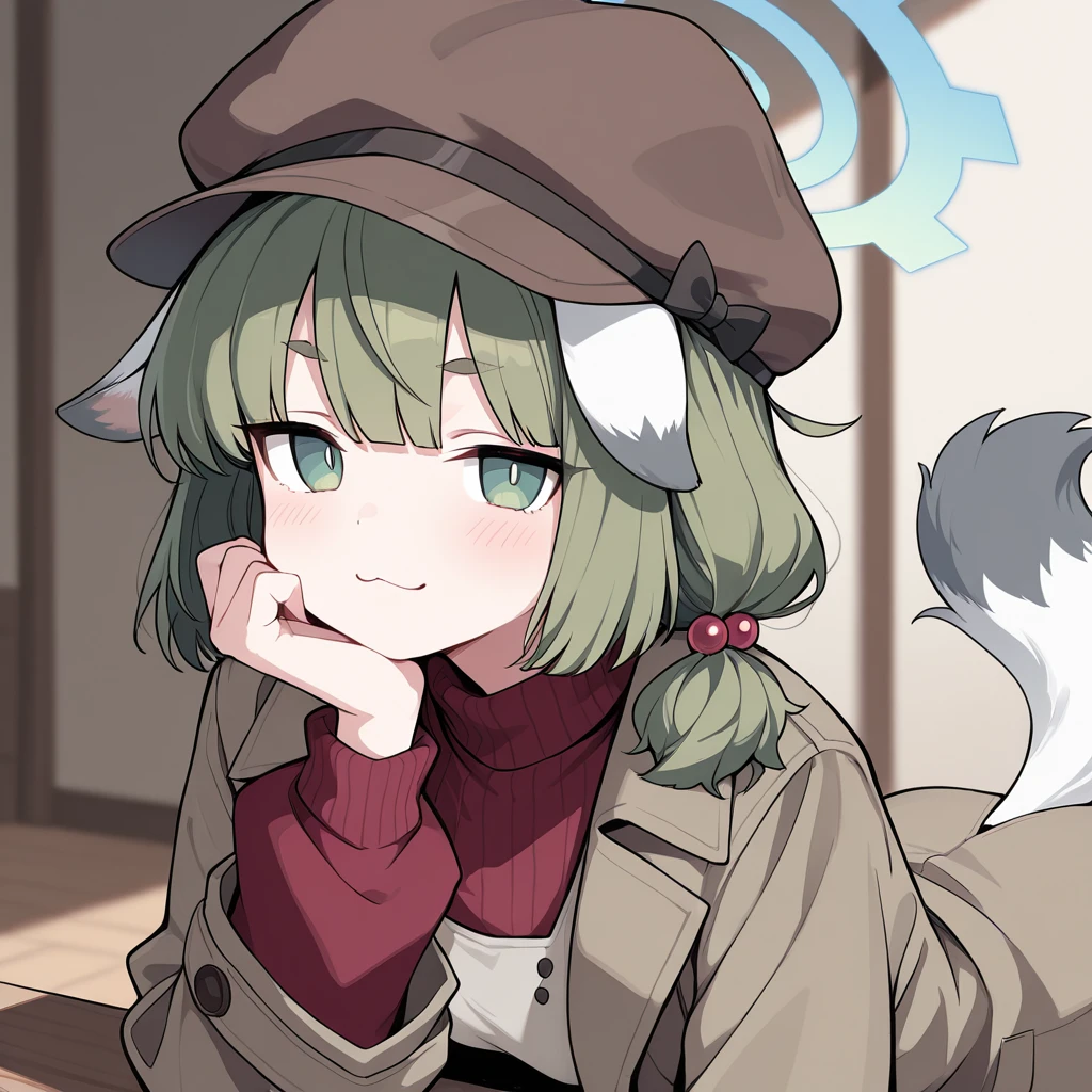 bayakumo, animal ears, tail, green eyes, green hair, hair bobbles, halo, brown hat, cabbie hat, brown coat, open coat, red sweater, long sleeves,