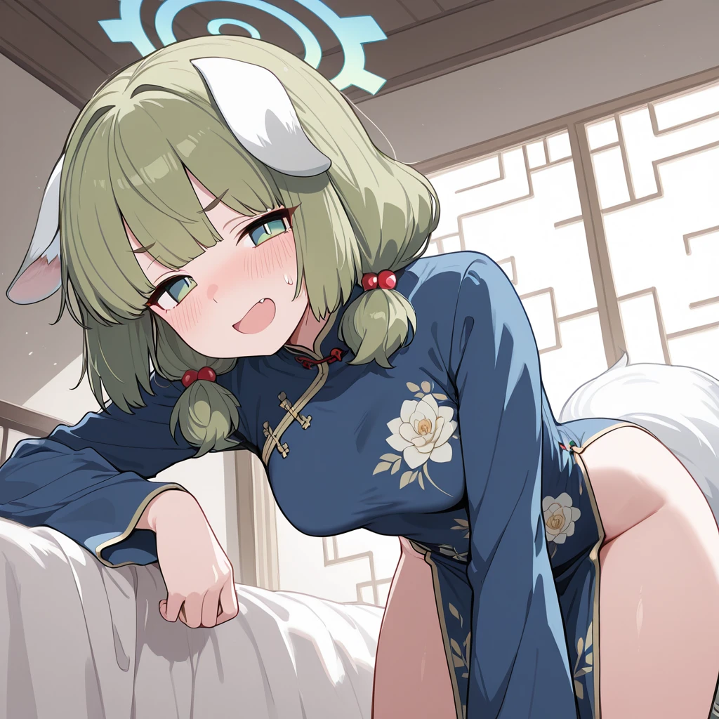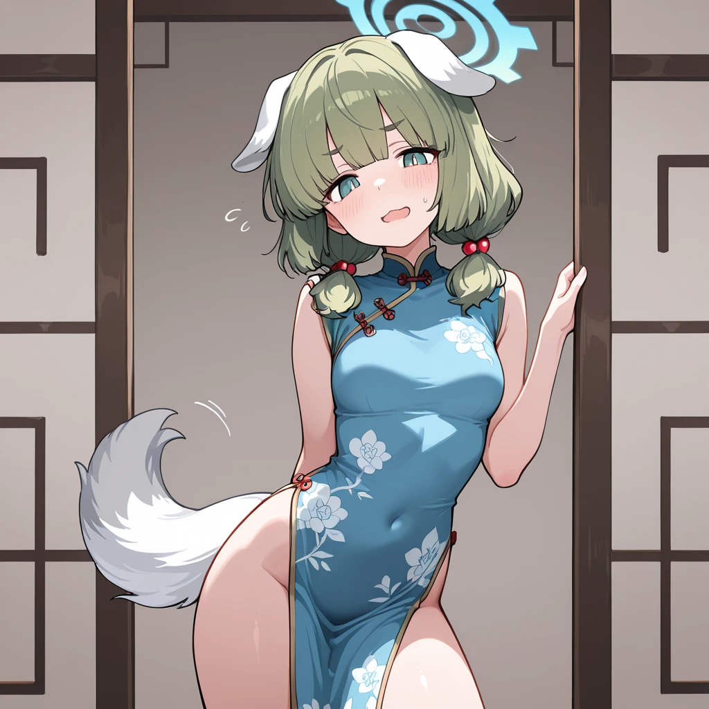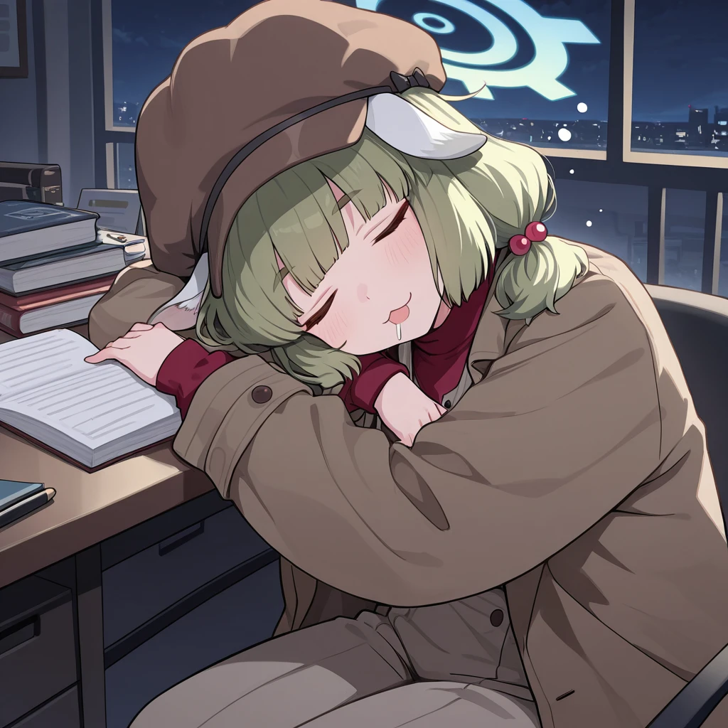 bayakumo, animal ears, tail, green eyes, green hair, hair bobbles, halo, brown hat, cabbie hat, brown coat, open coat, red sweater, long sleeves,