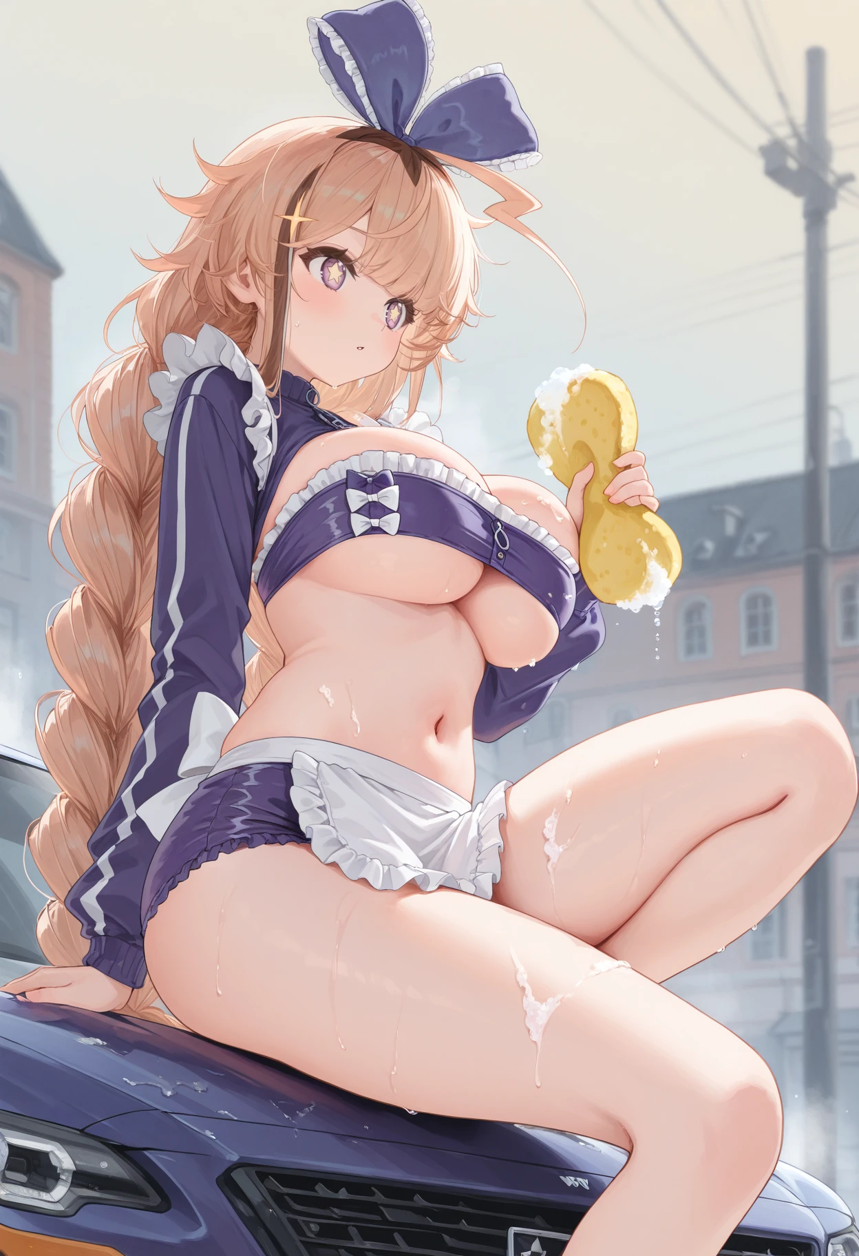 Maid costume: wdp_maid, tube top, frill trim, shrug \(clothing\), long sleeves, shorts, waist apron, navel, stomach, underboob, bare legs,