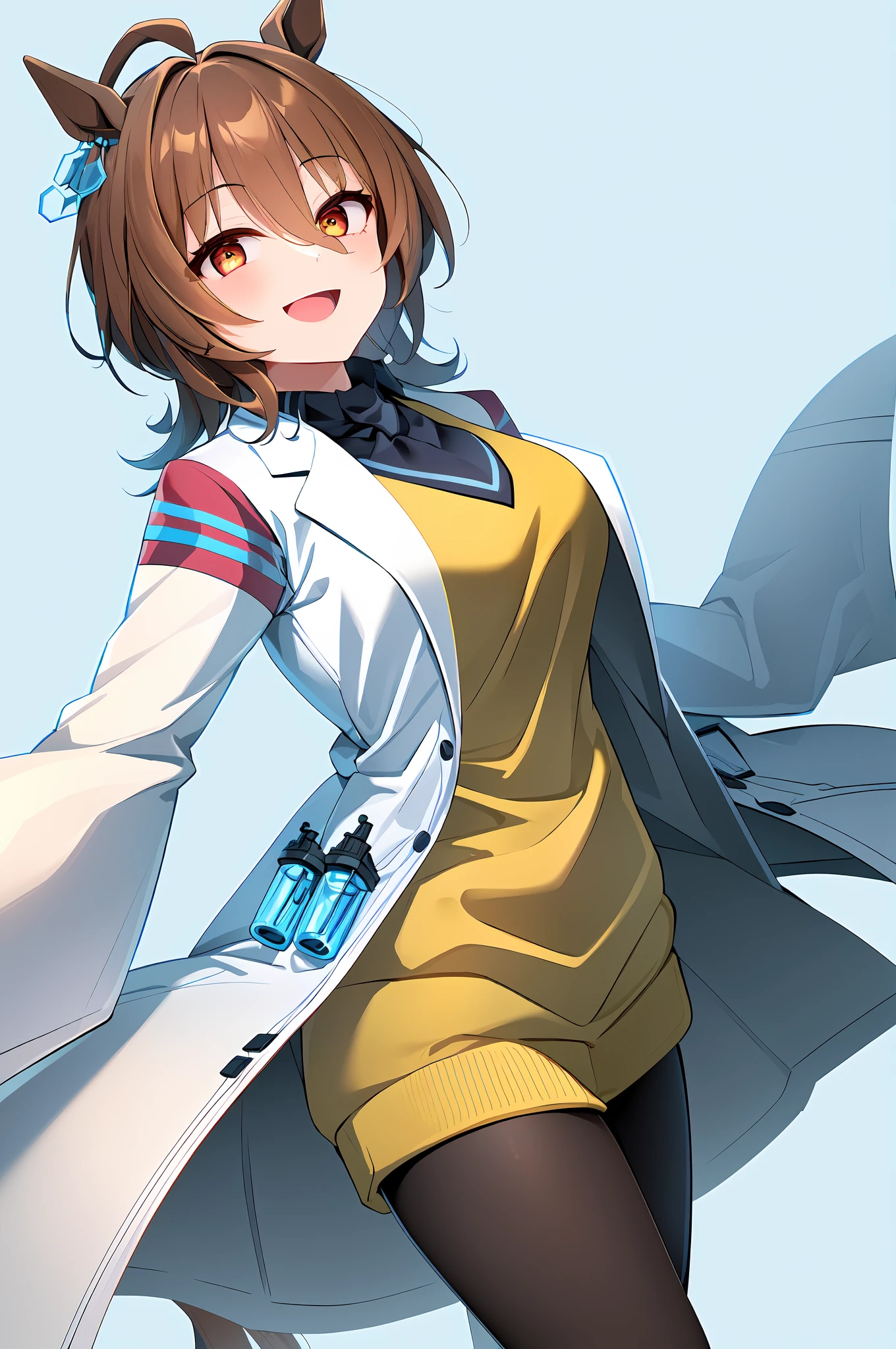 ・earrings in one ear, collared shirt, black tie, yellow sweater, sweater vest, long sleeves, lab coat, sleeves, test tubes and instruments, black pantyhose, white high cut shoes