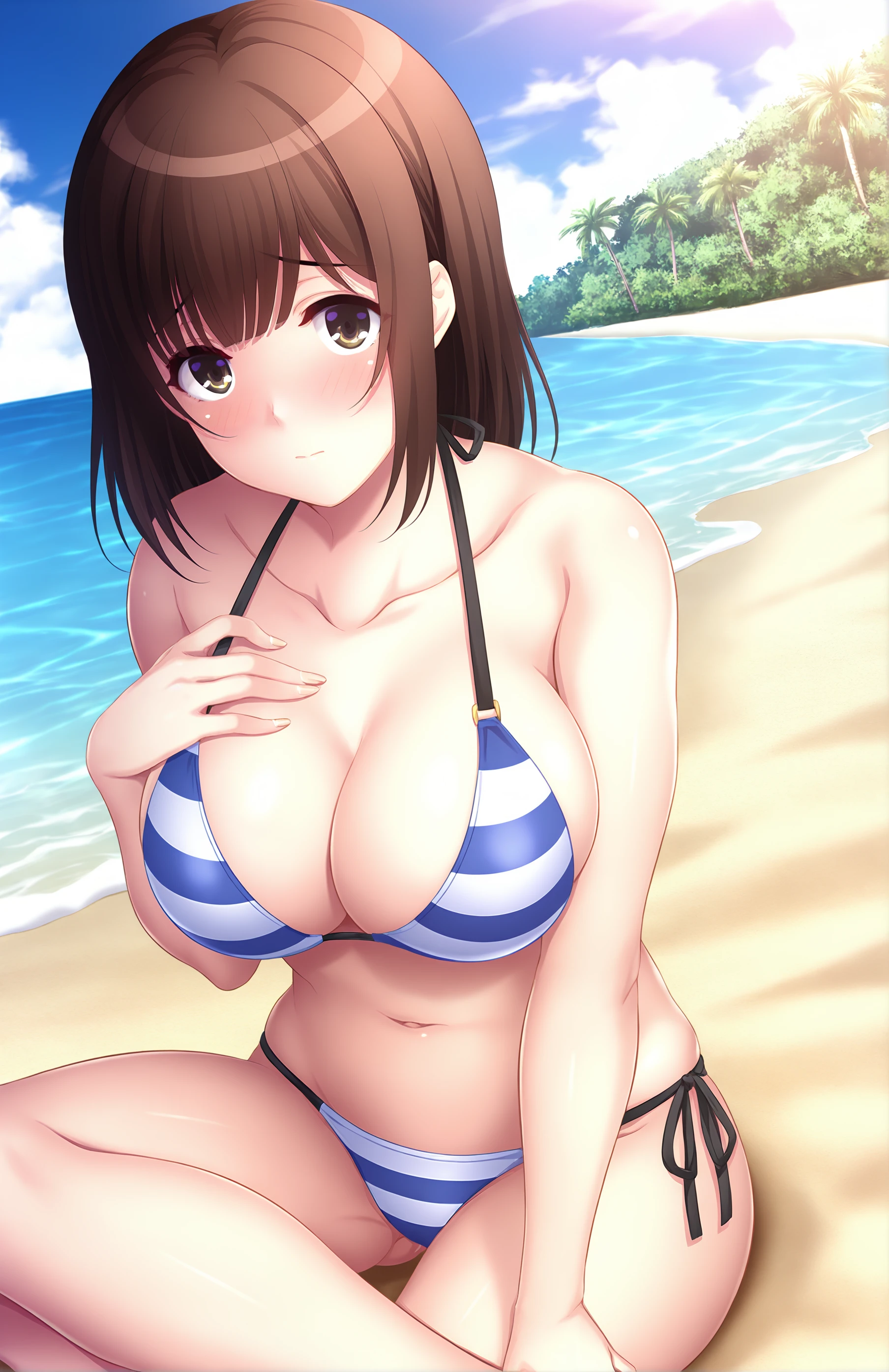 TakayanagiKana, breasts, short hair, bangs, large breasts, brown hair, navel, cleavage, brown eyes, collarbone, swimsuit, bikini, striped, medium hair, side-tie bikini bottom, halterneck, ass visible through thighs, string bikini, striped bikini