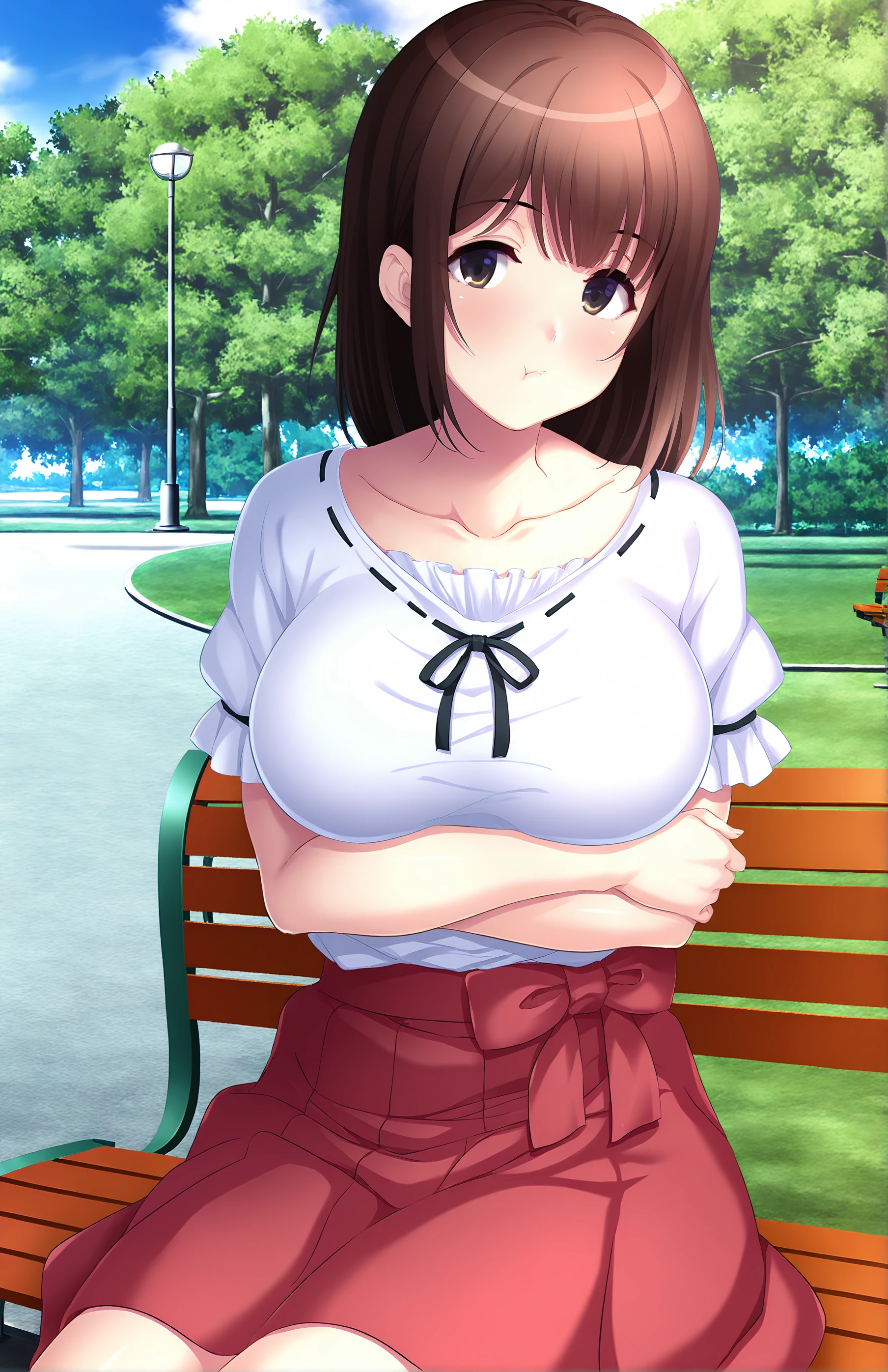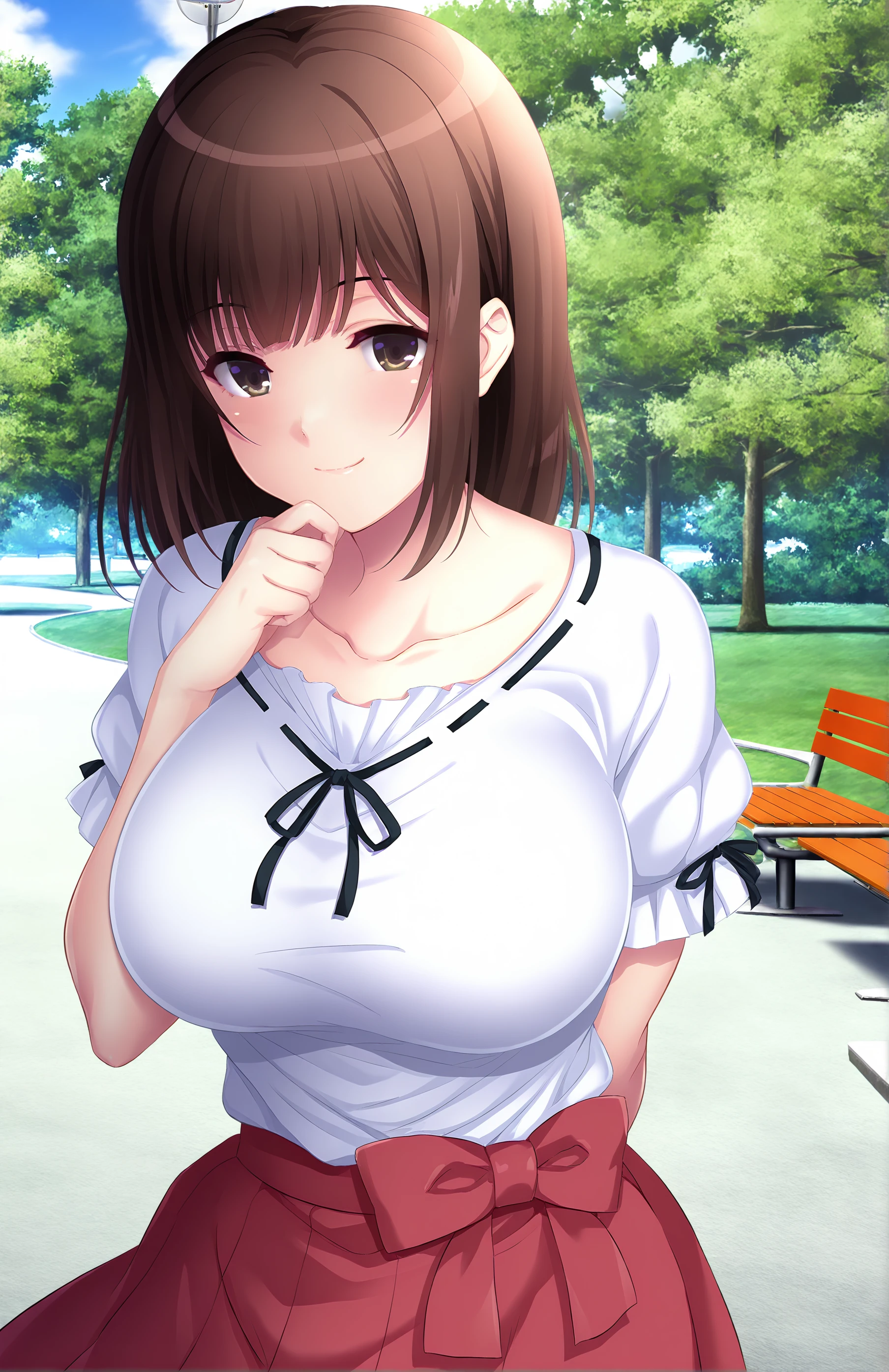 TakayanagiKana, breasts, bangs, skirt, large breasts, brown hair, shirt, bow, brown eyes, collarbone, white shirt, short sleeves, red bow, red skirt, black ribbon, ribbon trim, ribbon-trimmed clothes