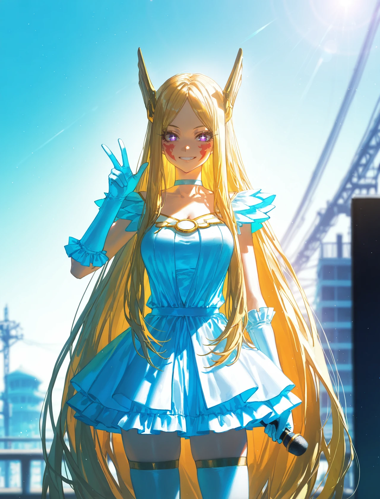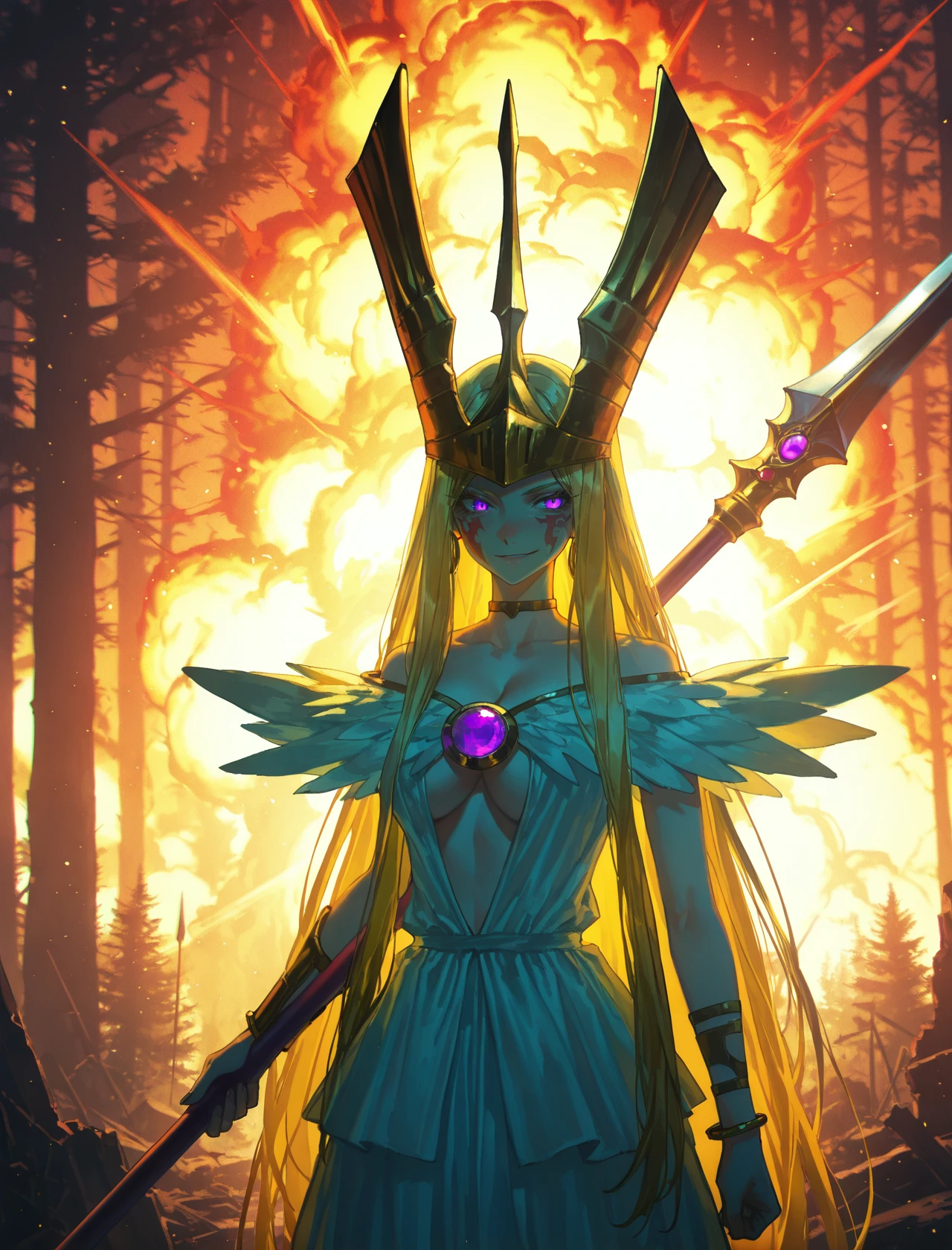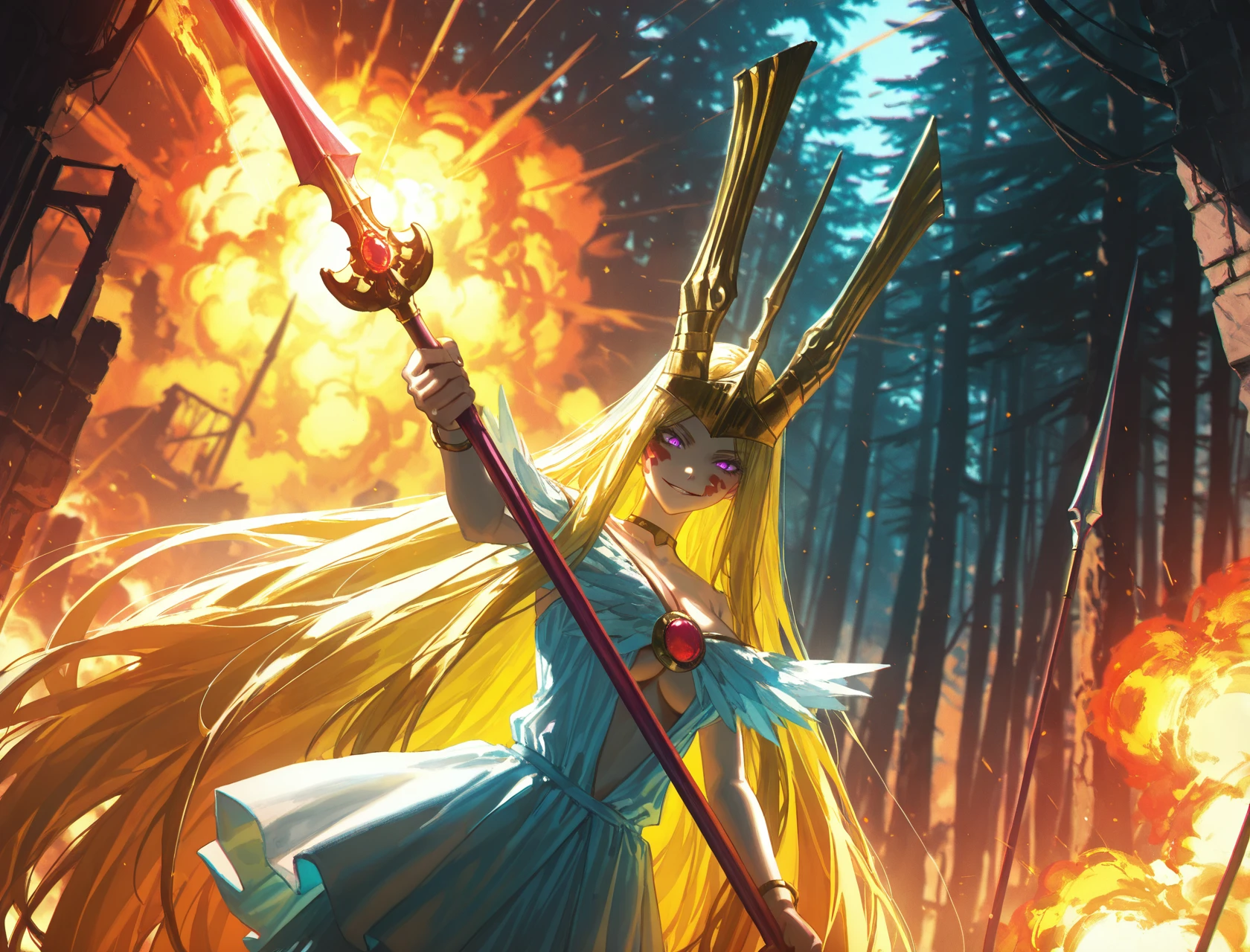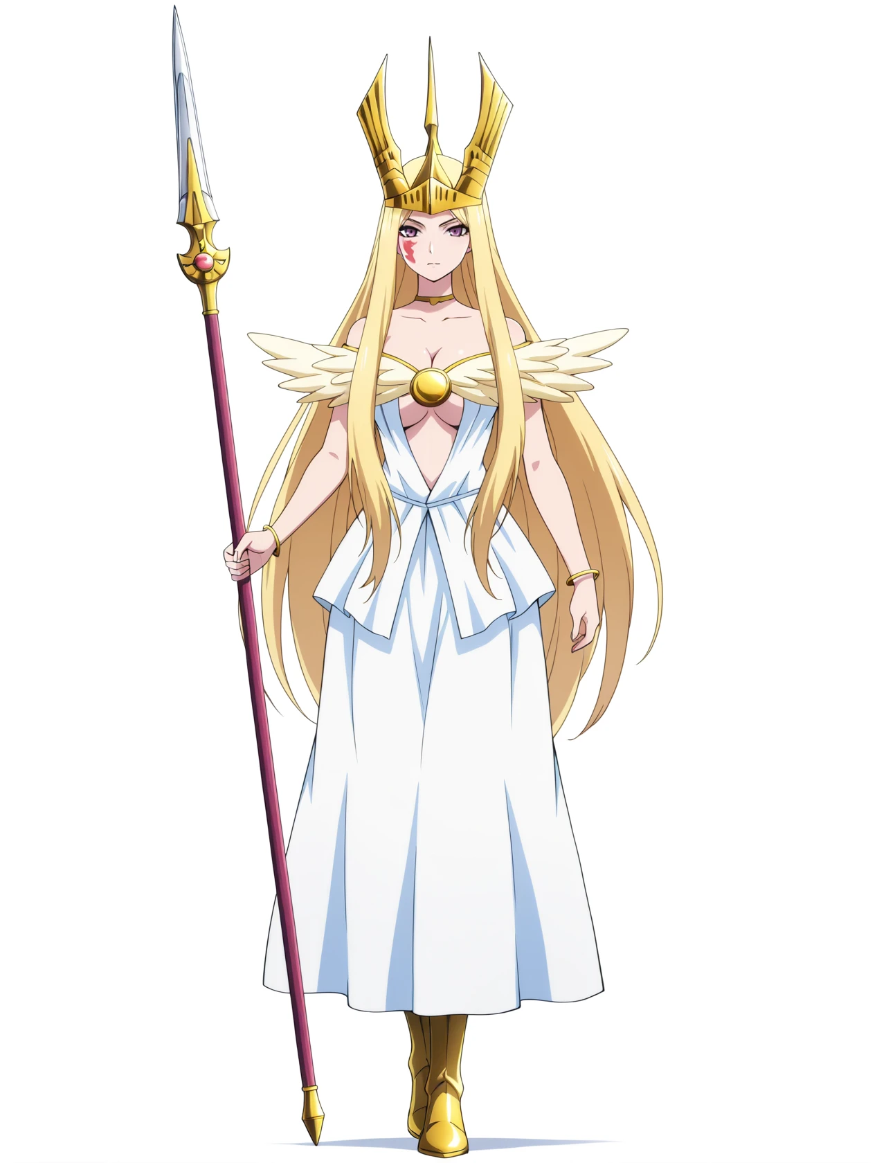 MiraDianusArtemina,blonde hair,very long hair,purple eyes,long hair,facepaint,facial mark on cheek,facial mark,, crown,jewelry,bracelet, shoulders,armor,cleavage,cleavage cutout,strapless dress,center opening,choker,white dress,golden boots with wings,boots, holding polearm,polearm,spear,holding weapon,