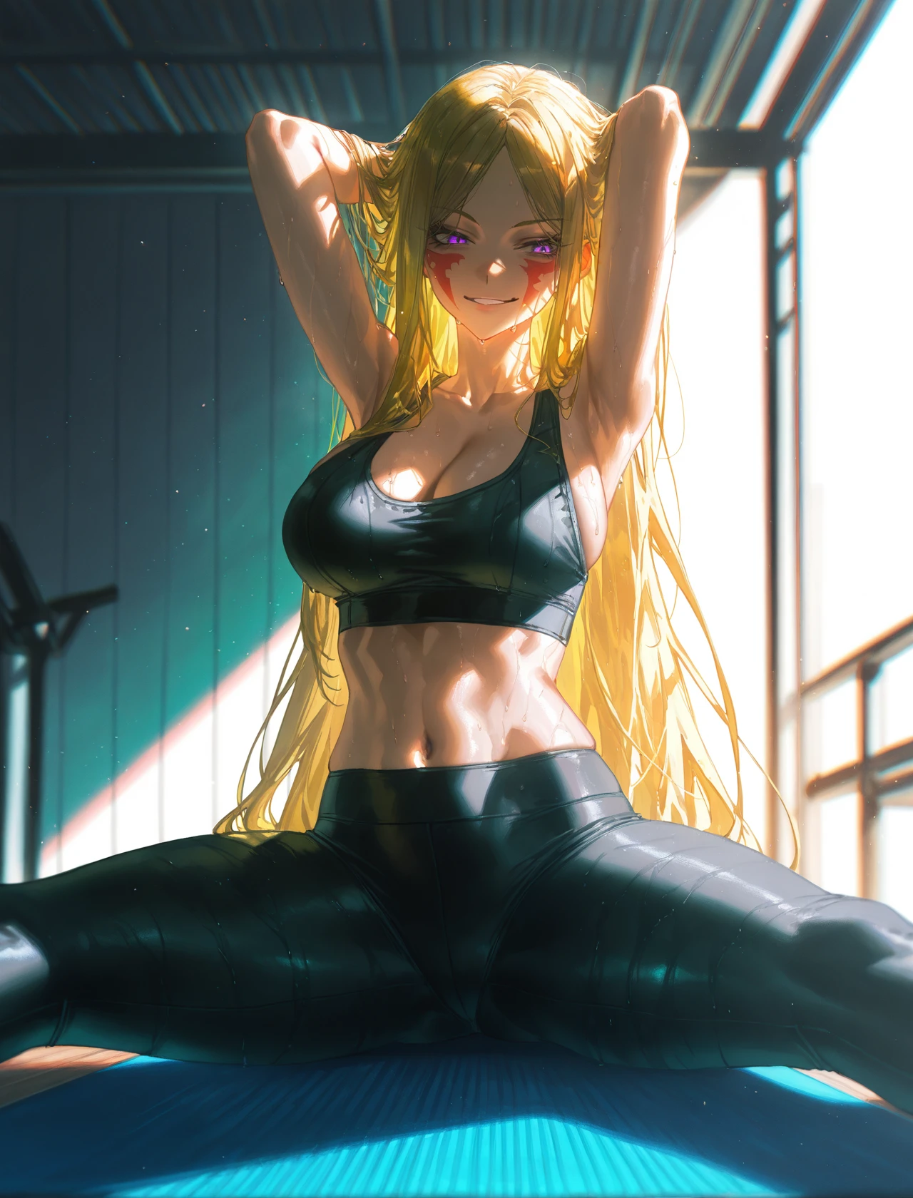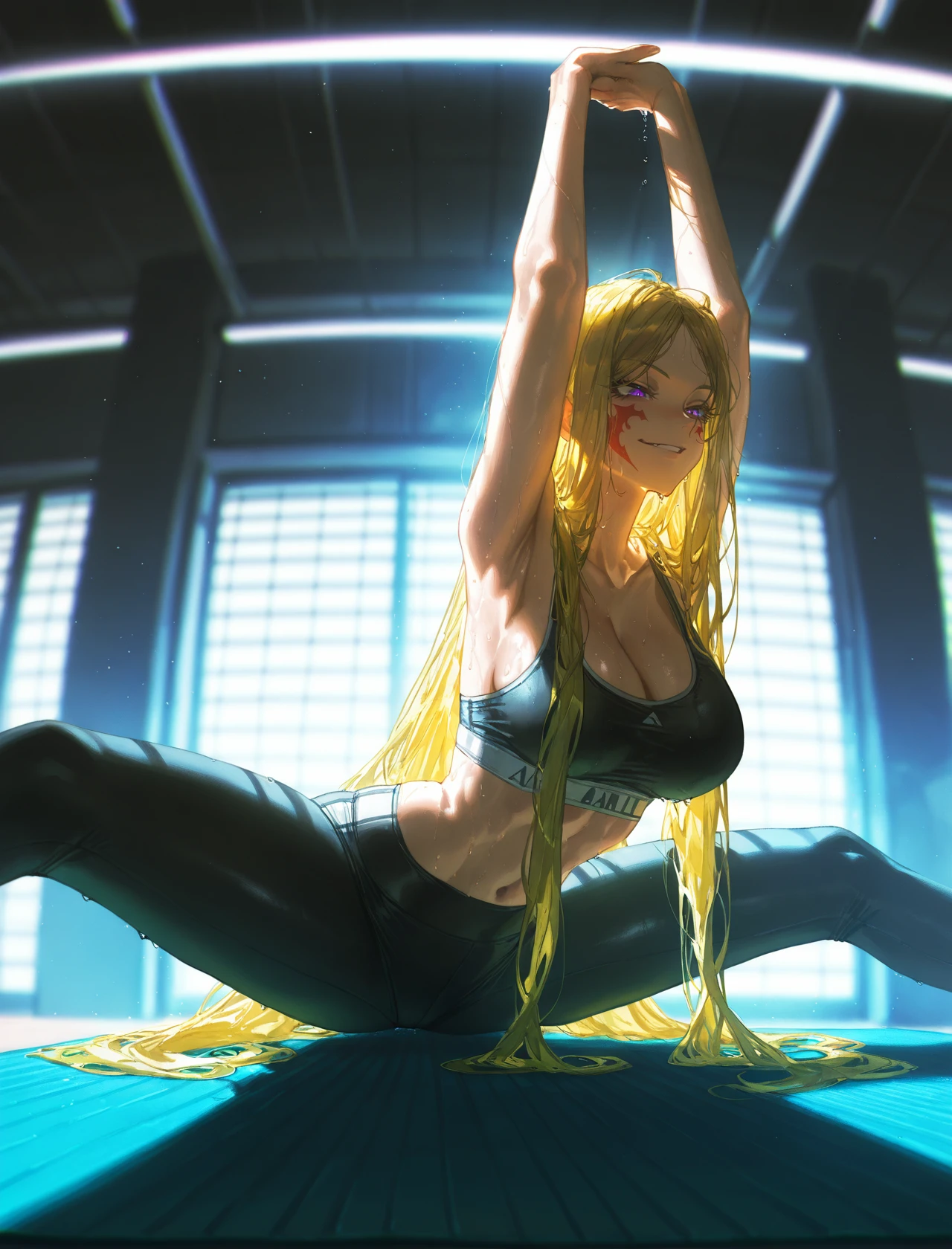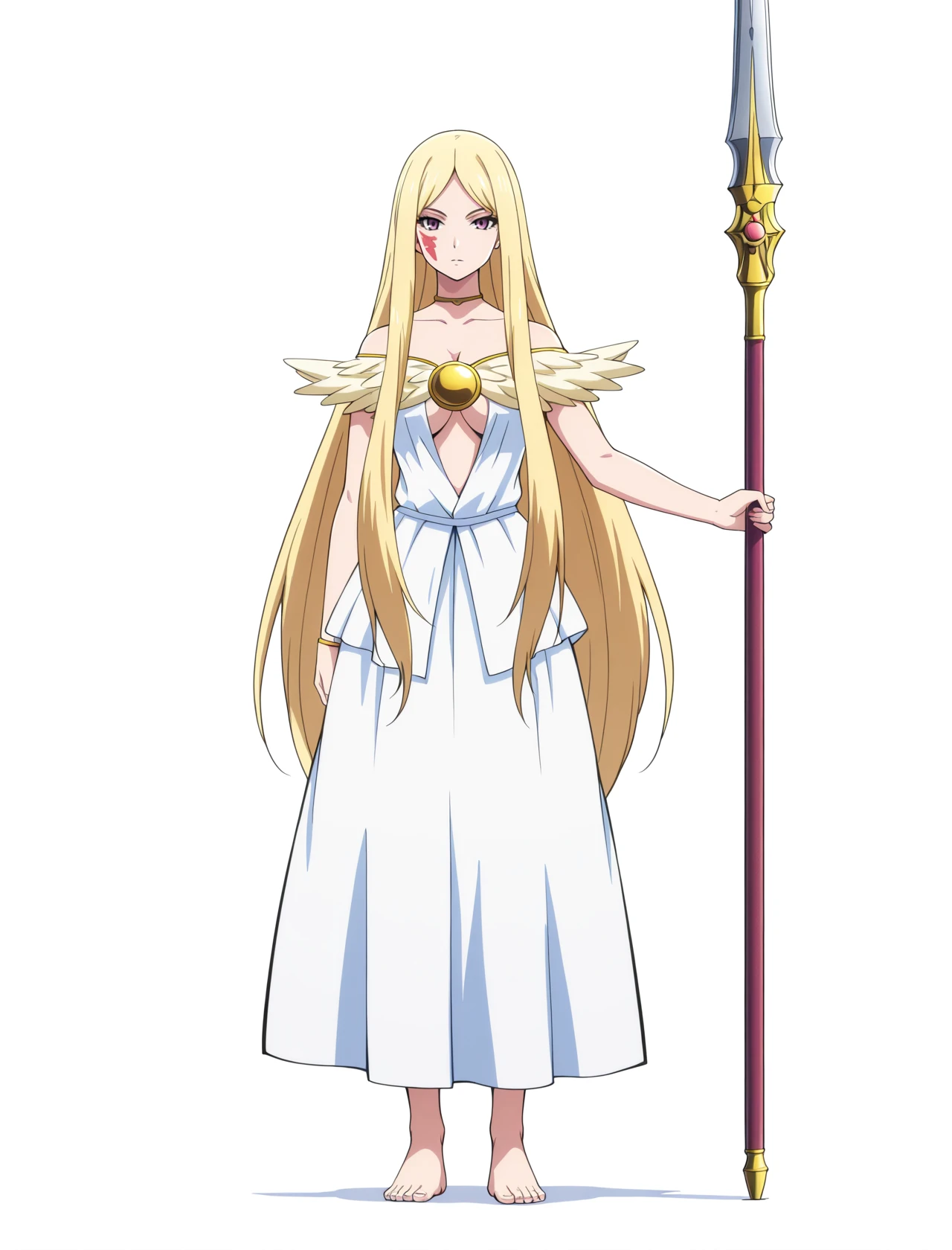 MiraDianusArtemina,blonde hair,very long hair,purple eyes,long hair,facepaint,facial mark on cheek,facial mark,,parted bangs, white dress, shoulders,barefoot, holding polearm,polearm,spear,holding weapon,