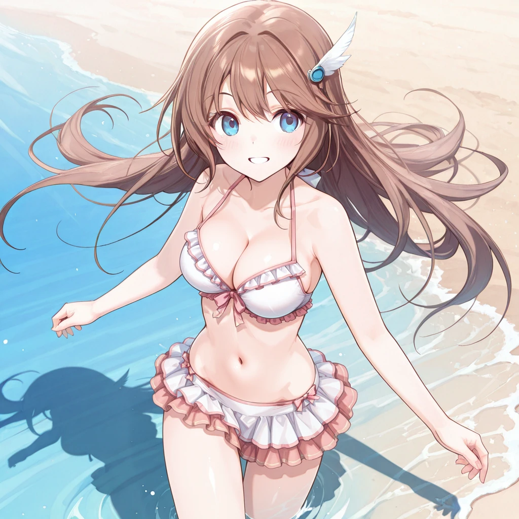 Swim: frilly bikini top, Frilly bikini skirt, Sandals)