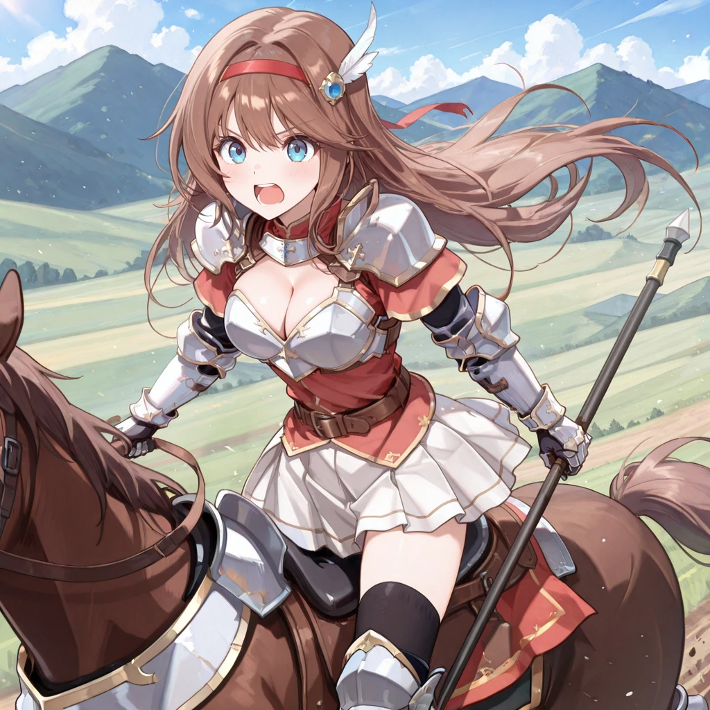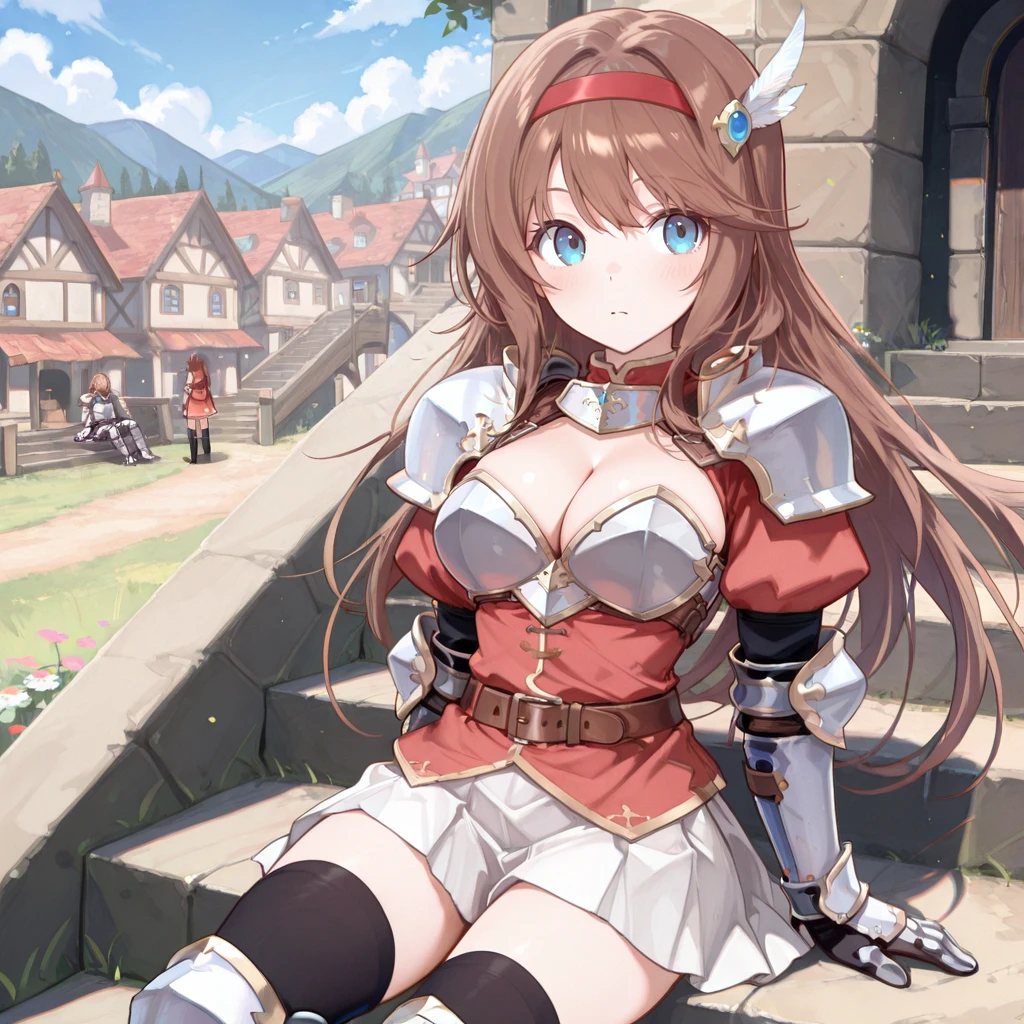 Default: Red Hairband, Flower Ornament, Armor, Cleavage, Red Tunic, Brown Belt, White Skirt, Black Socks, Armored Boots, Gauntlets