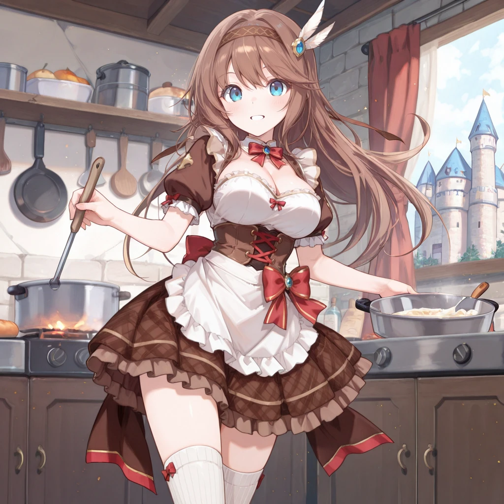 Alternative: Brown Headband with bow, corset, cleavage, brown skirt, white socks, brown boots