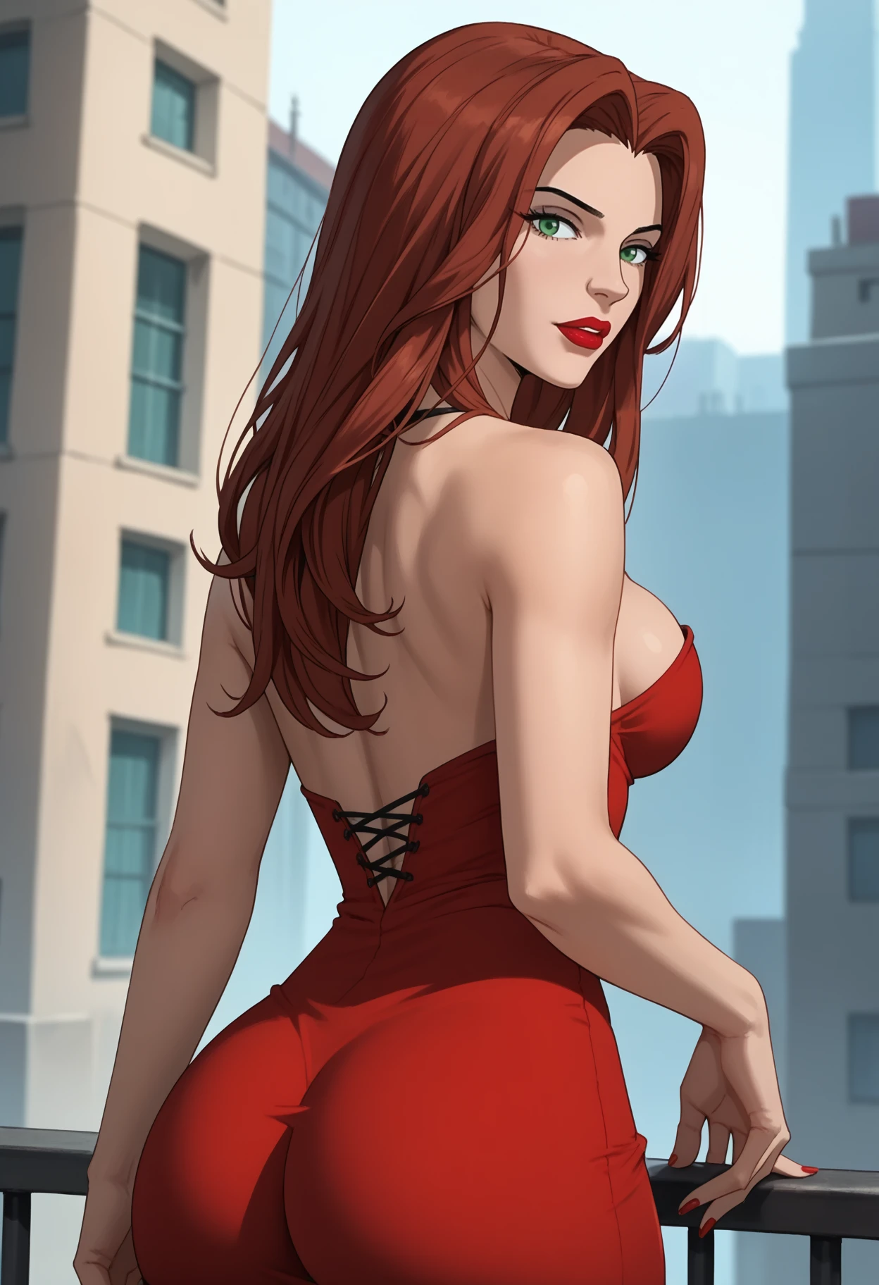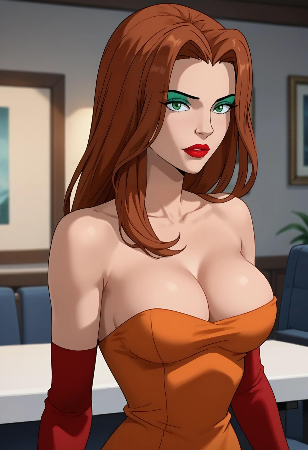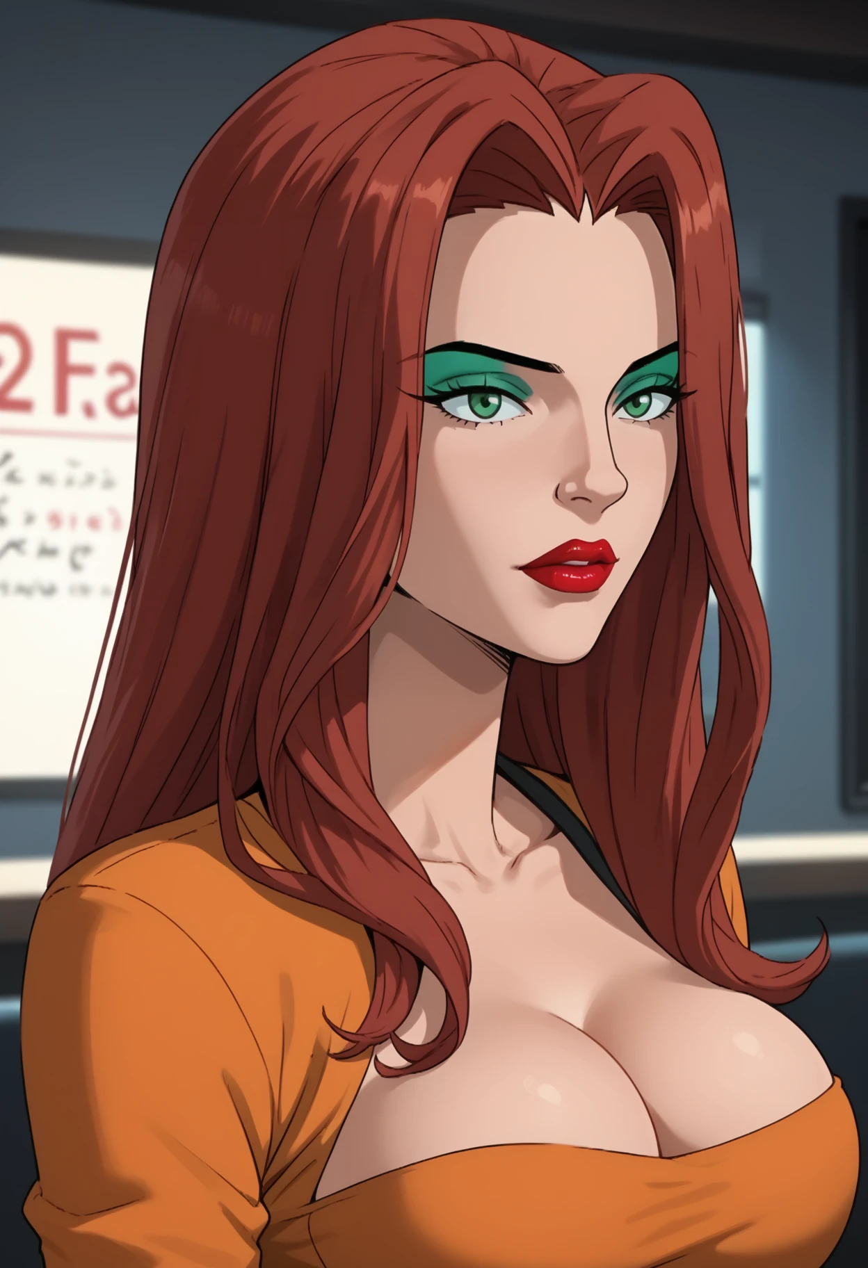 recommended tags: 1girl, solo, green eyes, brown hair, red hair, long hair, breasts, large breasts, makeup, eyeshadows, lipstick, red lips,