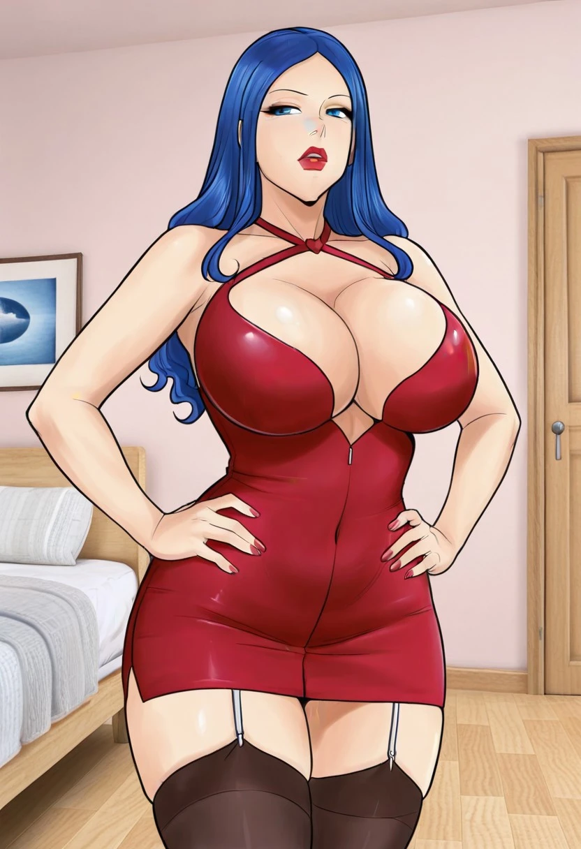 Appearance prompt : long hair, blue hair, blue/green eyes, large breasts, lipstick