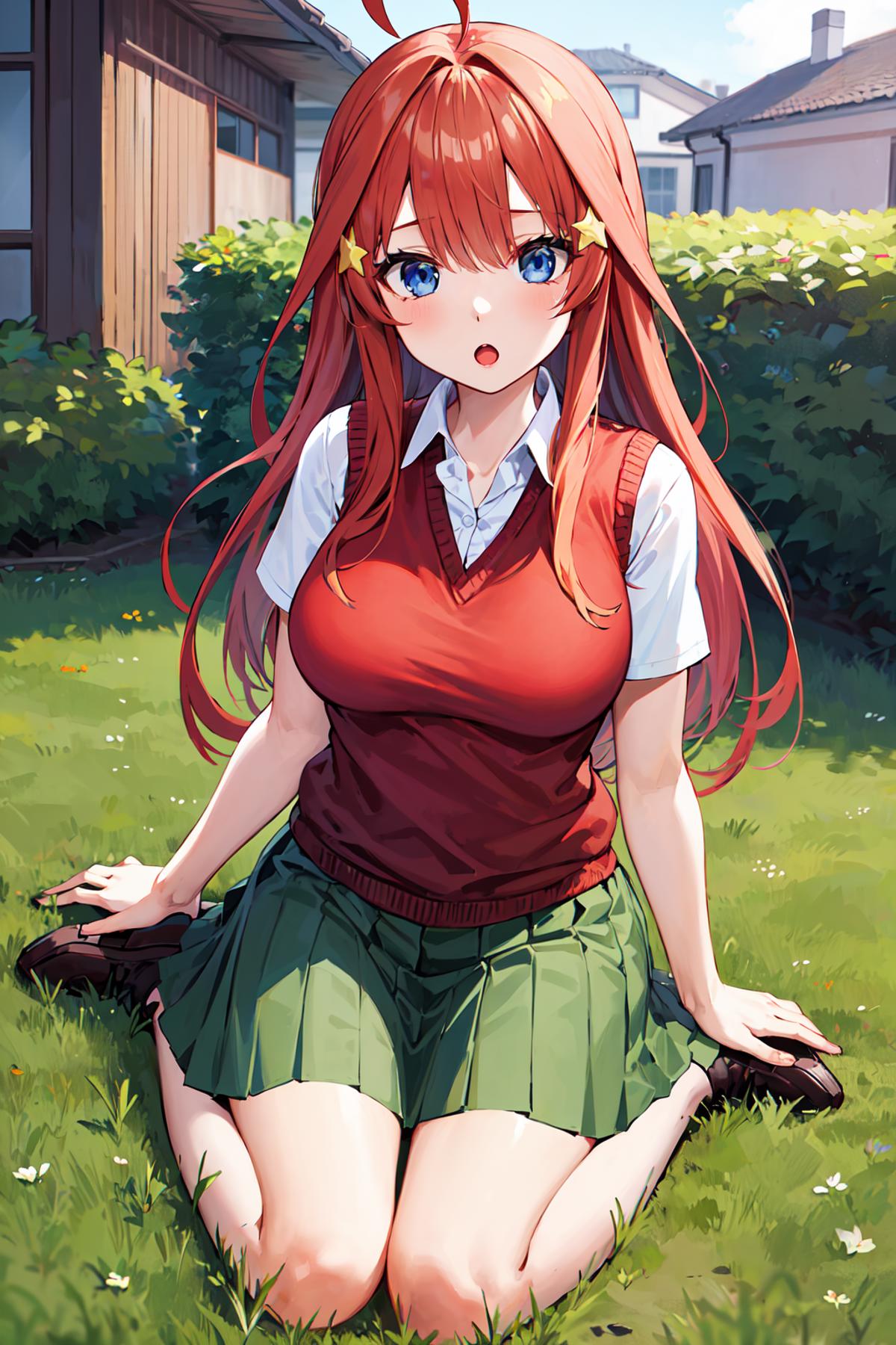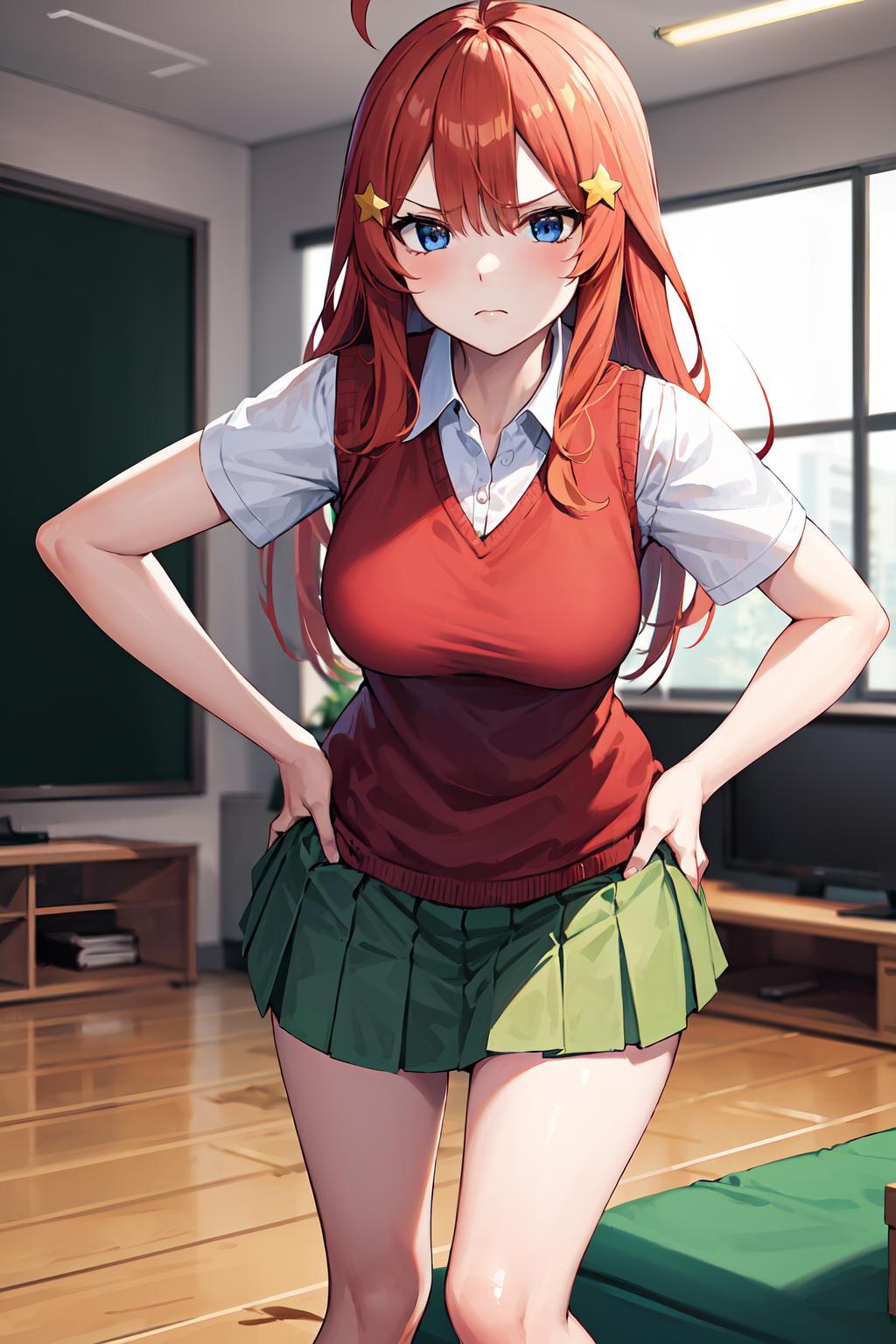 outfit2aaitsuki, long hair, ahoge, star hair ornament, school uniform, red sweater, sweater vest, short sleeves, green skirt, pleated skirt