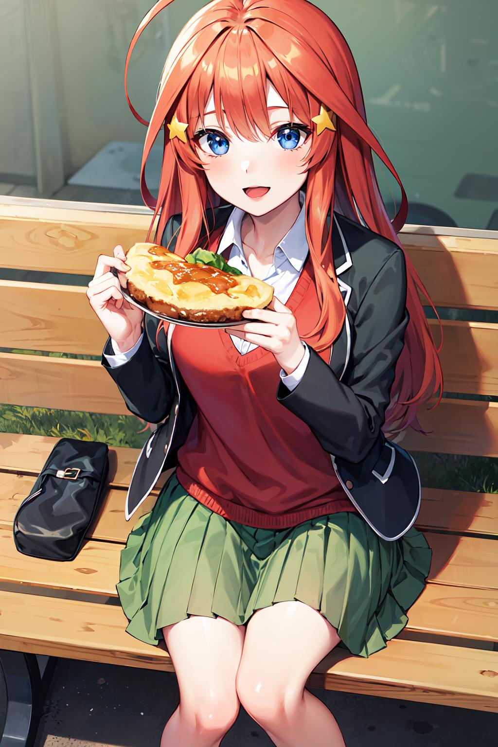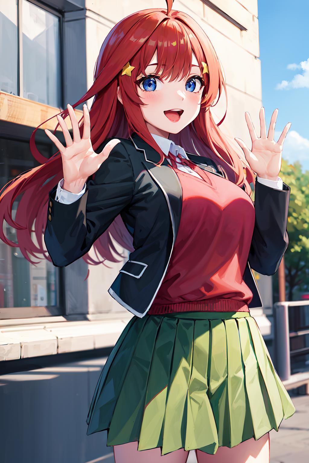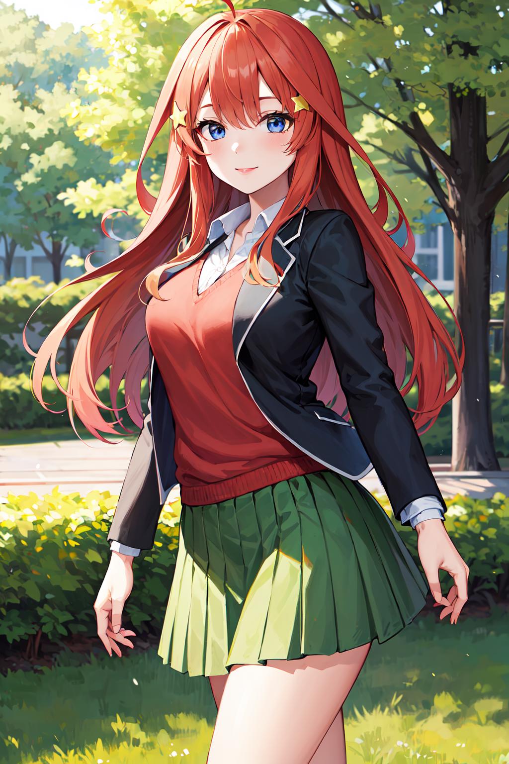 aaitsuki, long hair, ahoge, star hair ornament, school uniform, blazer, black jacket, open jacket, red sweater, long sleeves, green skirt, pleated skirt