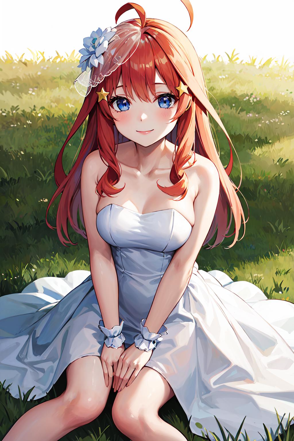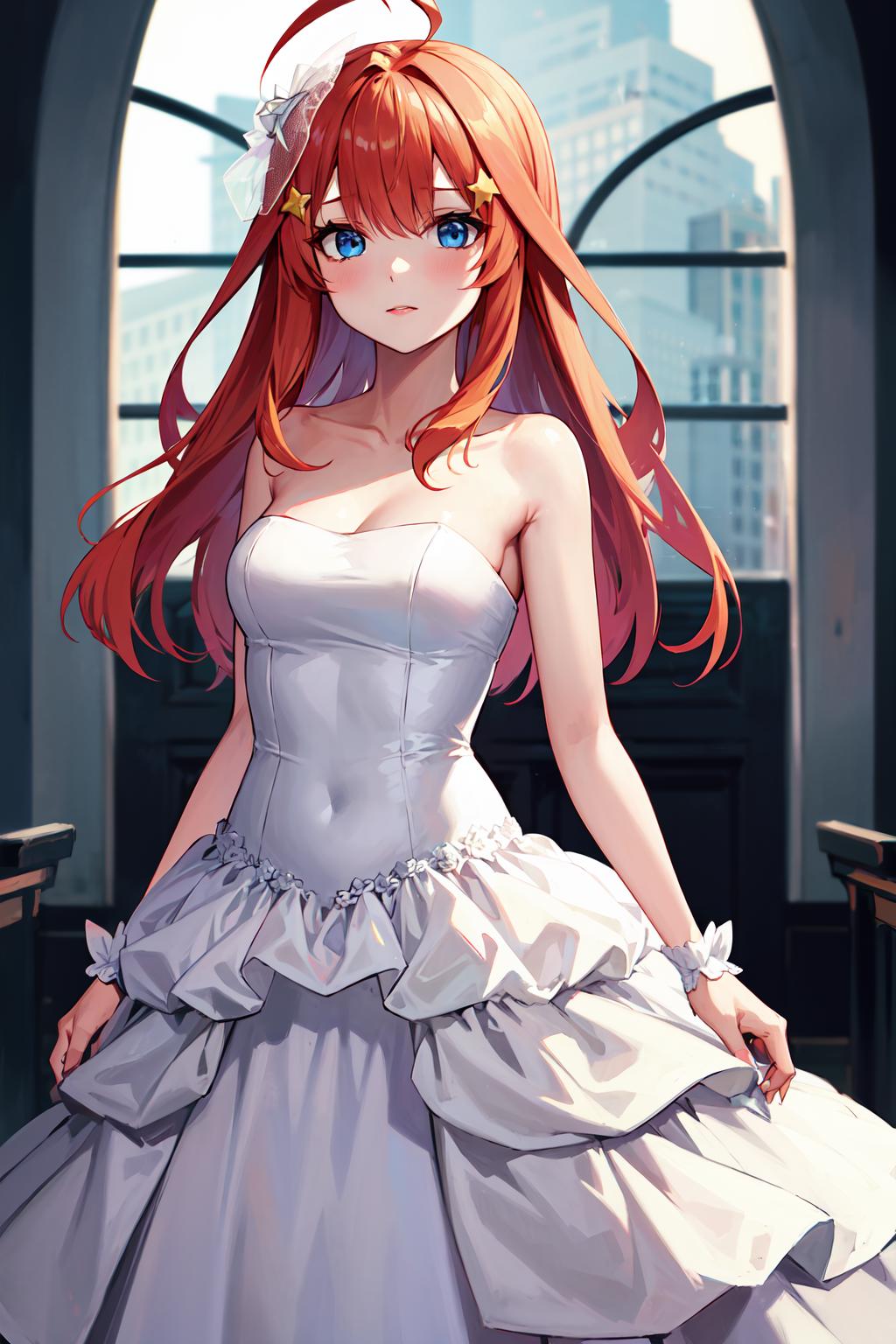 outfit3aaitsuki, long hair, ahoge, star hair ornament, bridal veil, collarbone, bare shoulders, strapless, wedding dress, white dress, wrist cuffs