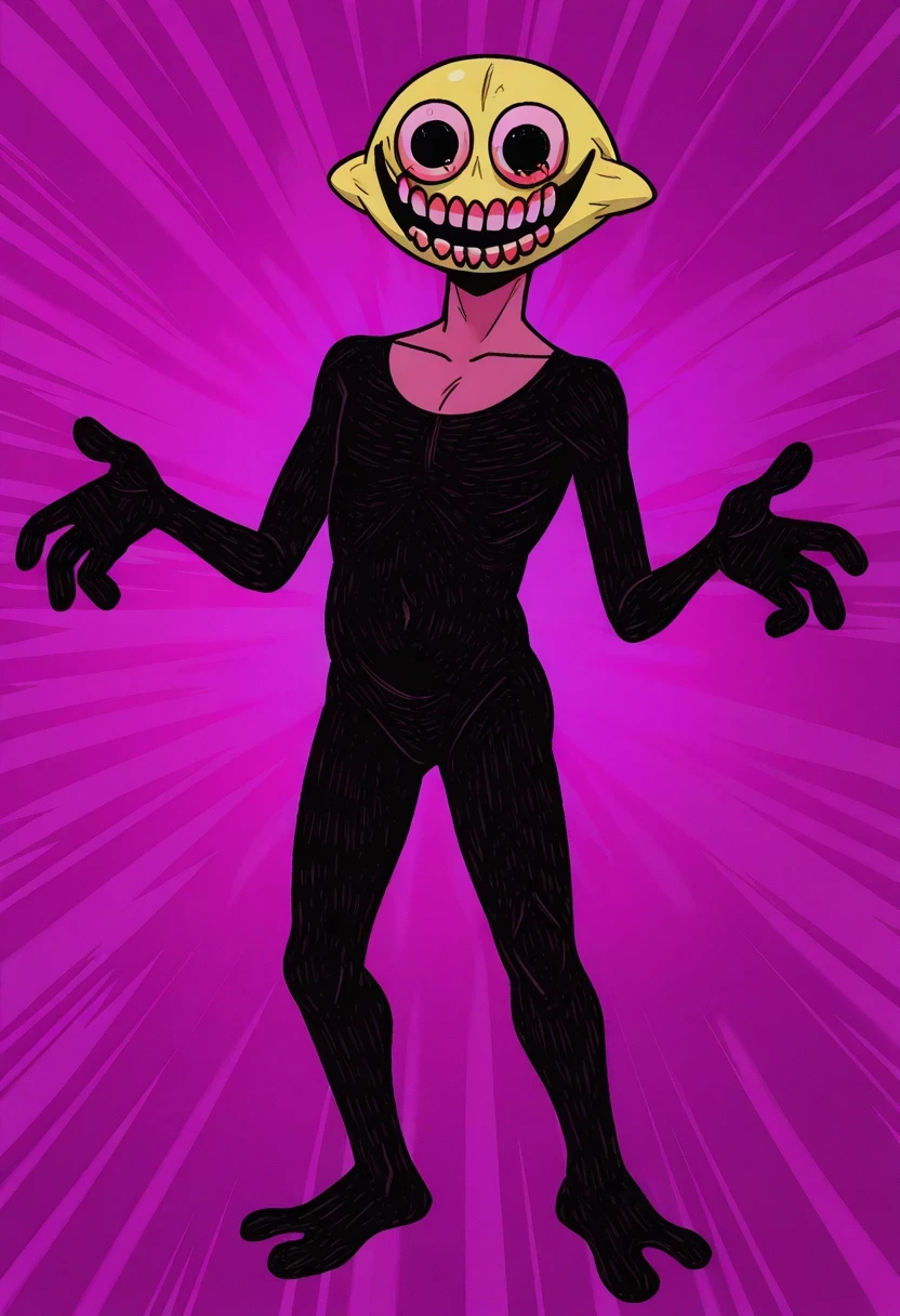 LemonDemonFNF, 1boy, demonic humanoid creature black body, violet-pink neck, two stubs for hands, two subs for feet, yellow lemon shaped head, bloodshot eyes, black eyes, Light-pink sclera, colored sclera, wide open smile, light-pink teeth, Bloody tears, bloody teeth, horror solo,