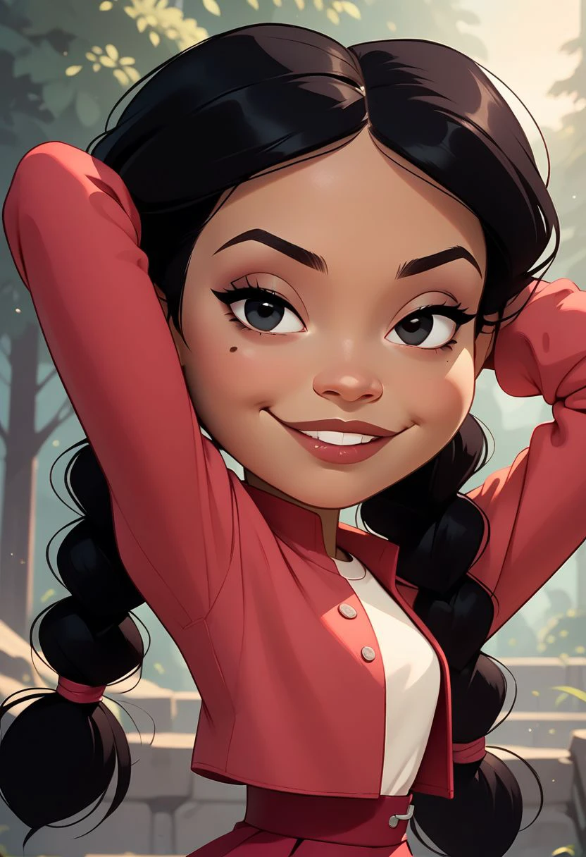 1girl, black hair, twin braids, black eyes, mole under eye, dark skin, red skirt